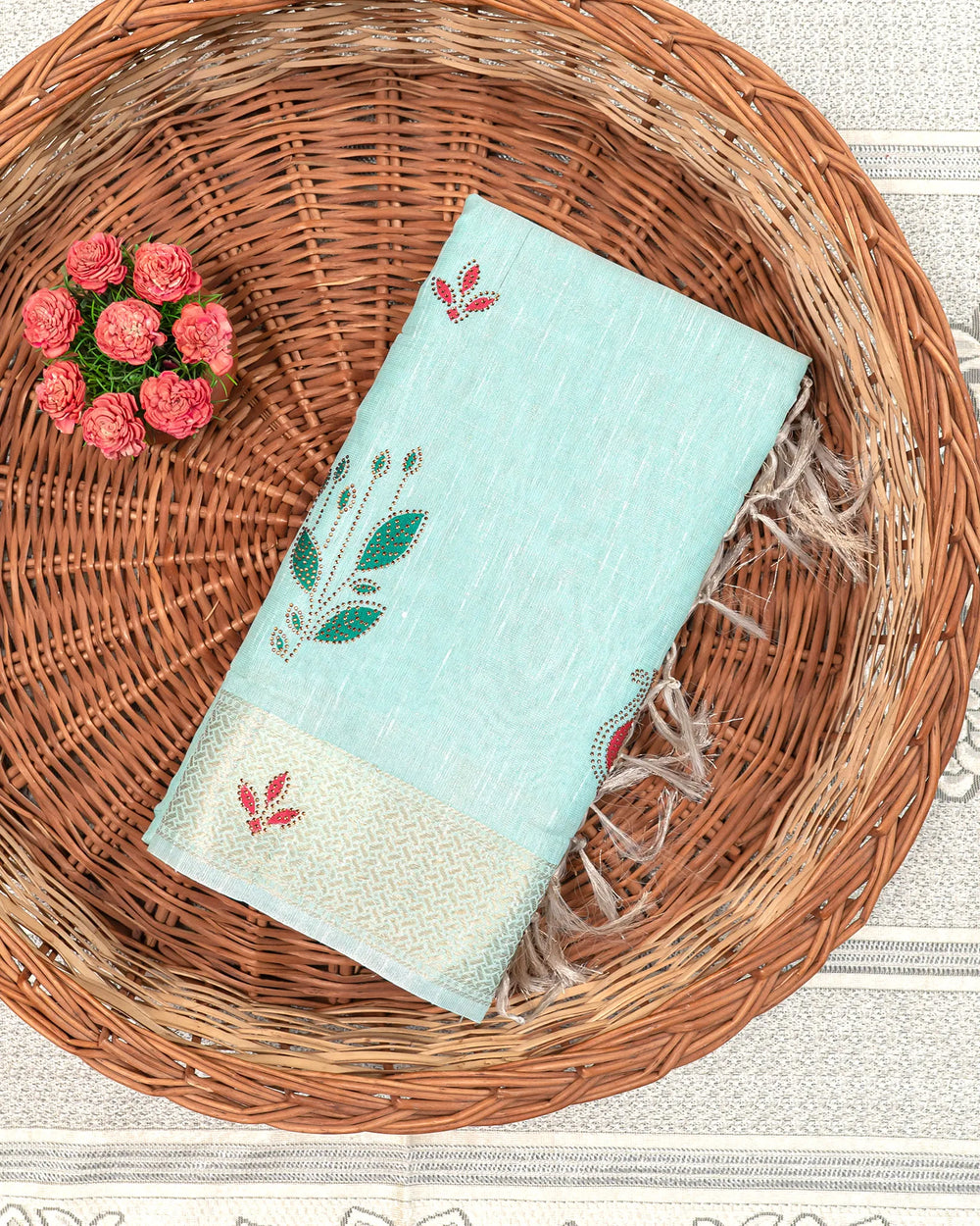 | Description | A graceful linen saree decorated with delicate multi-stone embellishments, blending natural texture with festive sparkle. Perfect for celebrations, cultural gatherings, and elegant day or evening wear. |