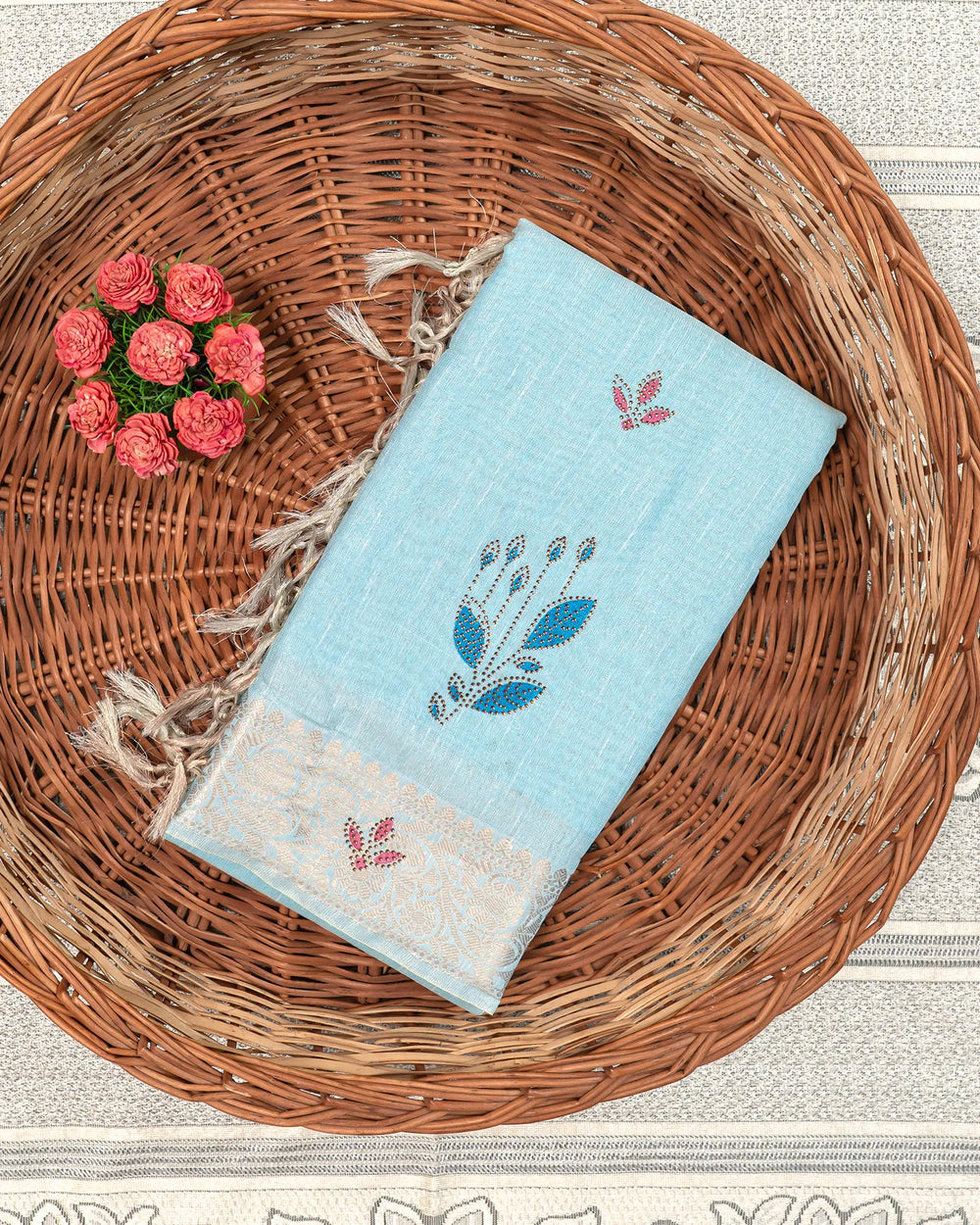 | Style | Elegant linen saree with fine multi-stone accents and a silver-bordered blouse for a refined, festive look. |