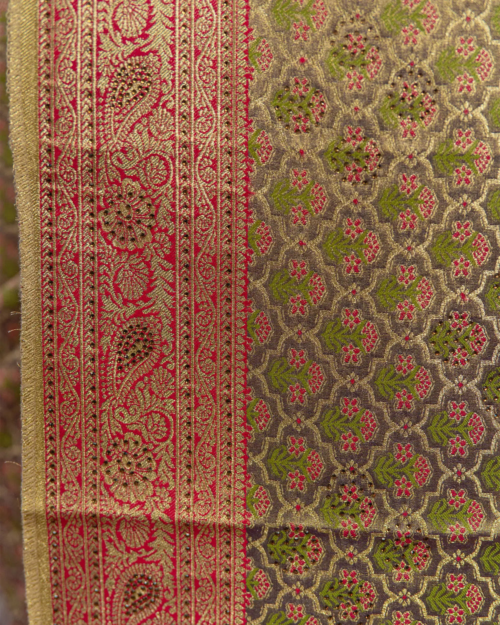 | Blouse | Tissue blouse with delicate butta detailing to perfectly match the saree’s rich stone work. |