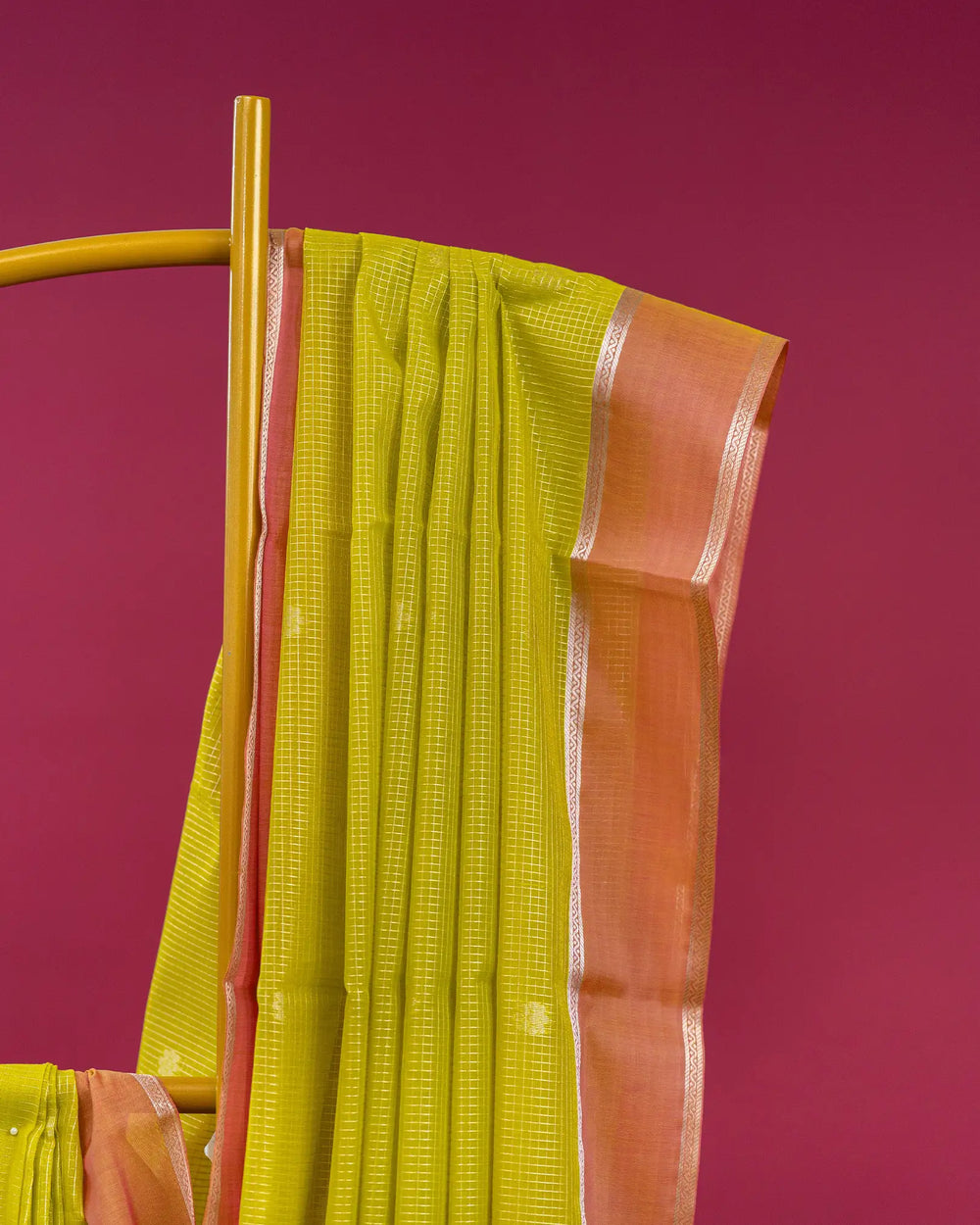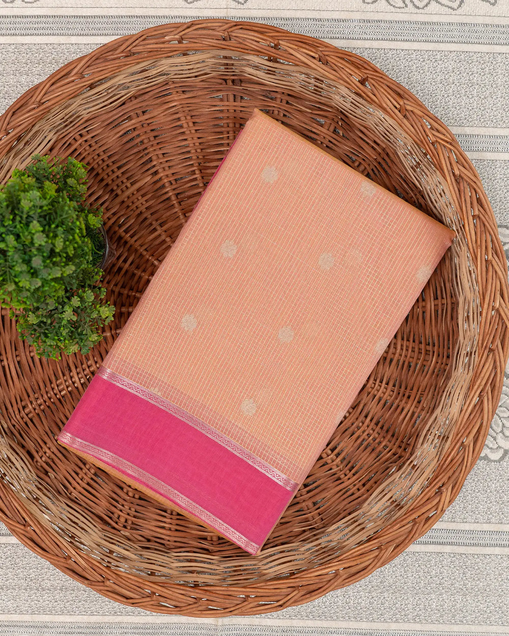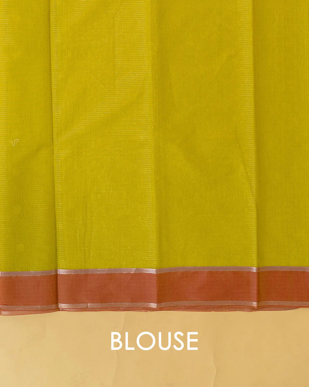 | Blouse | Running checked blouse with zari work on the hand and shoulder, designed to complement the saree’s elegant look. |