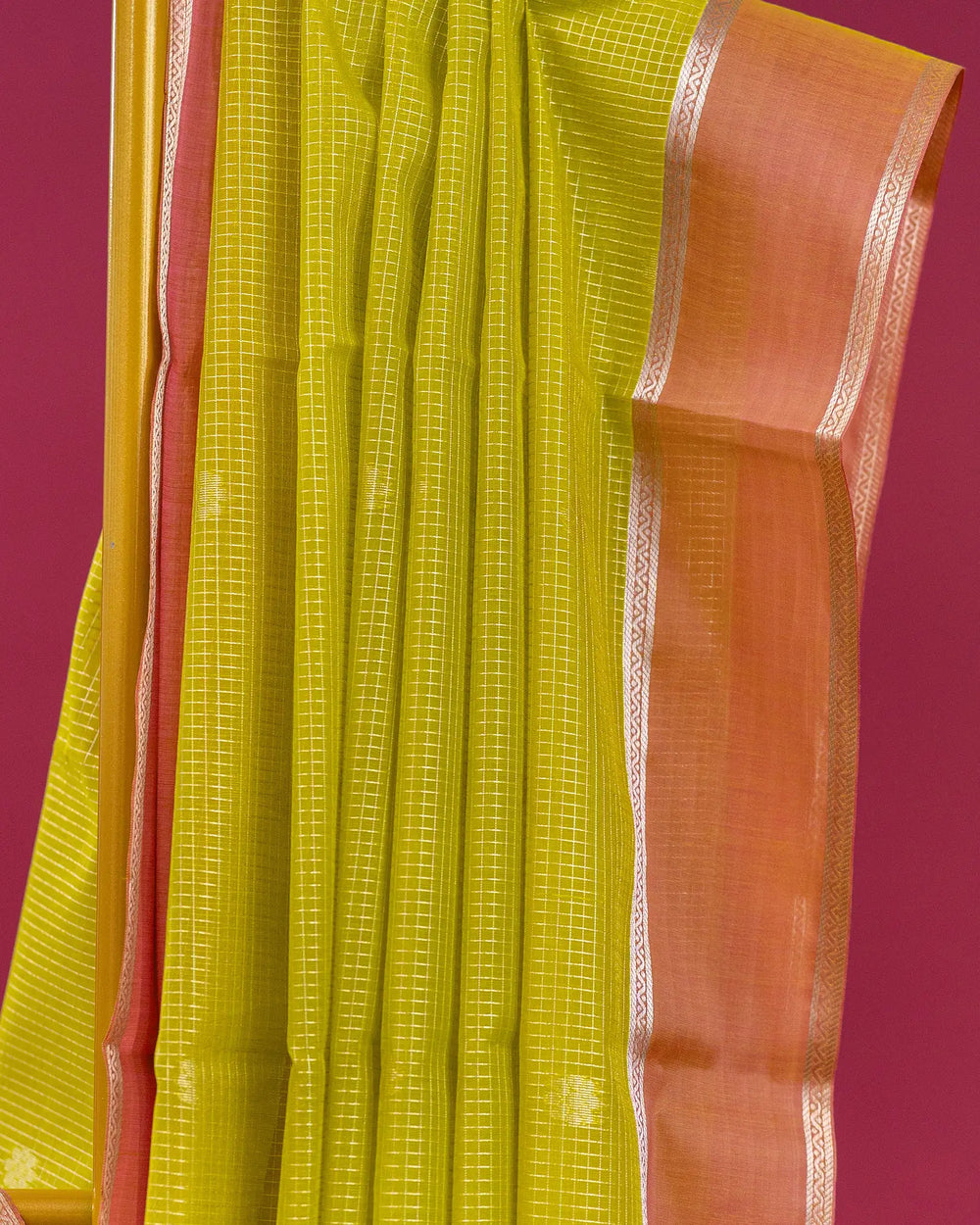 | Style | Elegant silk cotton saree with woven lines butta and a rich checked blouse design for timeless sophistication. |