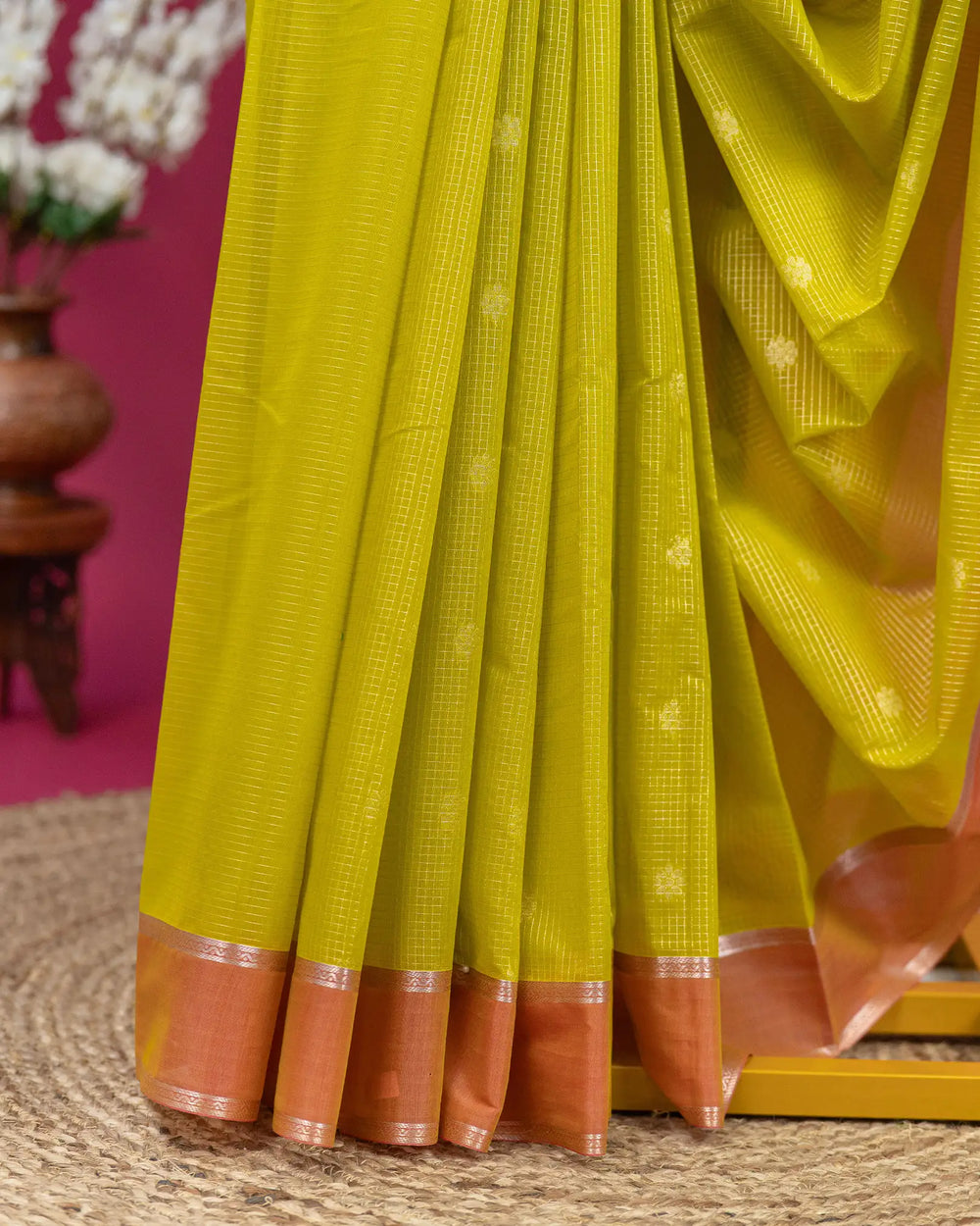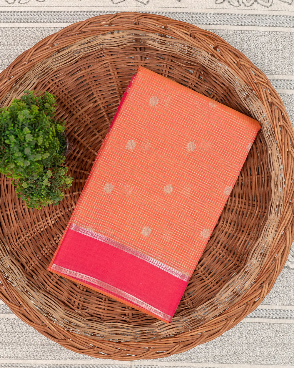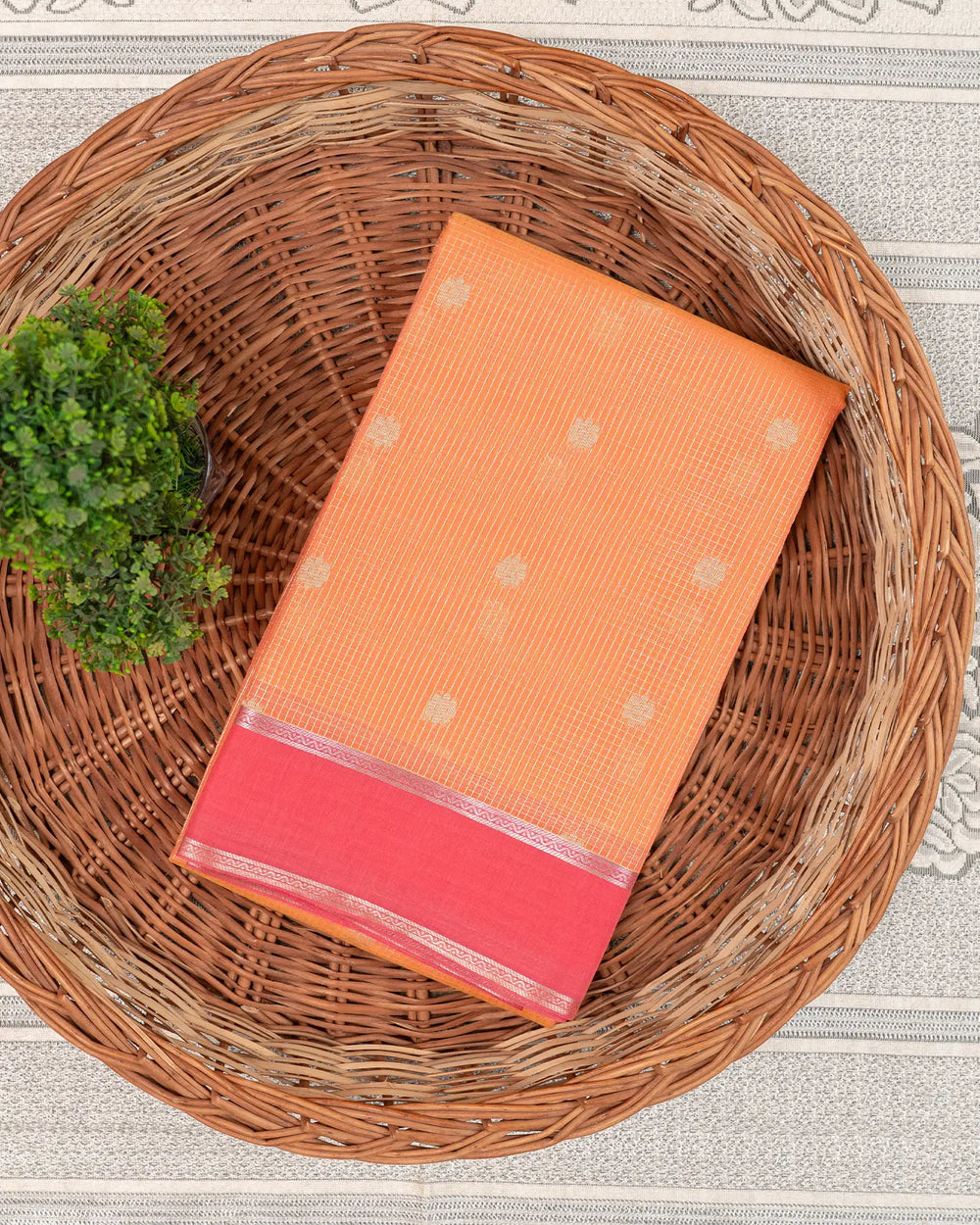 | Description | A classic silk cotton saree beautifully patterned with subtle lines butta, offering a graceful texture and elegant drape. Perfect for festive occasions, traditional gatherings, and special celebrations. |