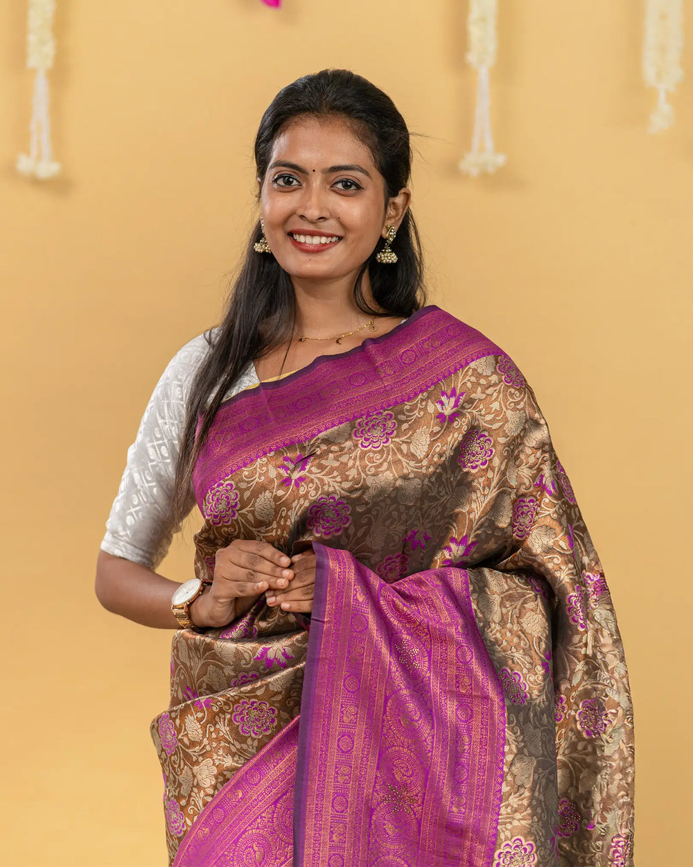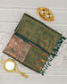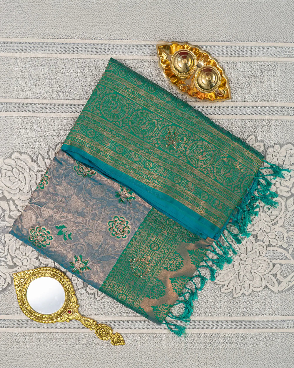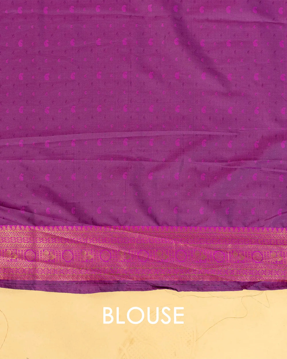 | Style | Elegant top-dyed saree highlighted with meena butta motifs and paired with a richly detailed embose blouse. |