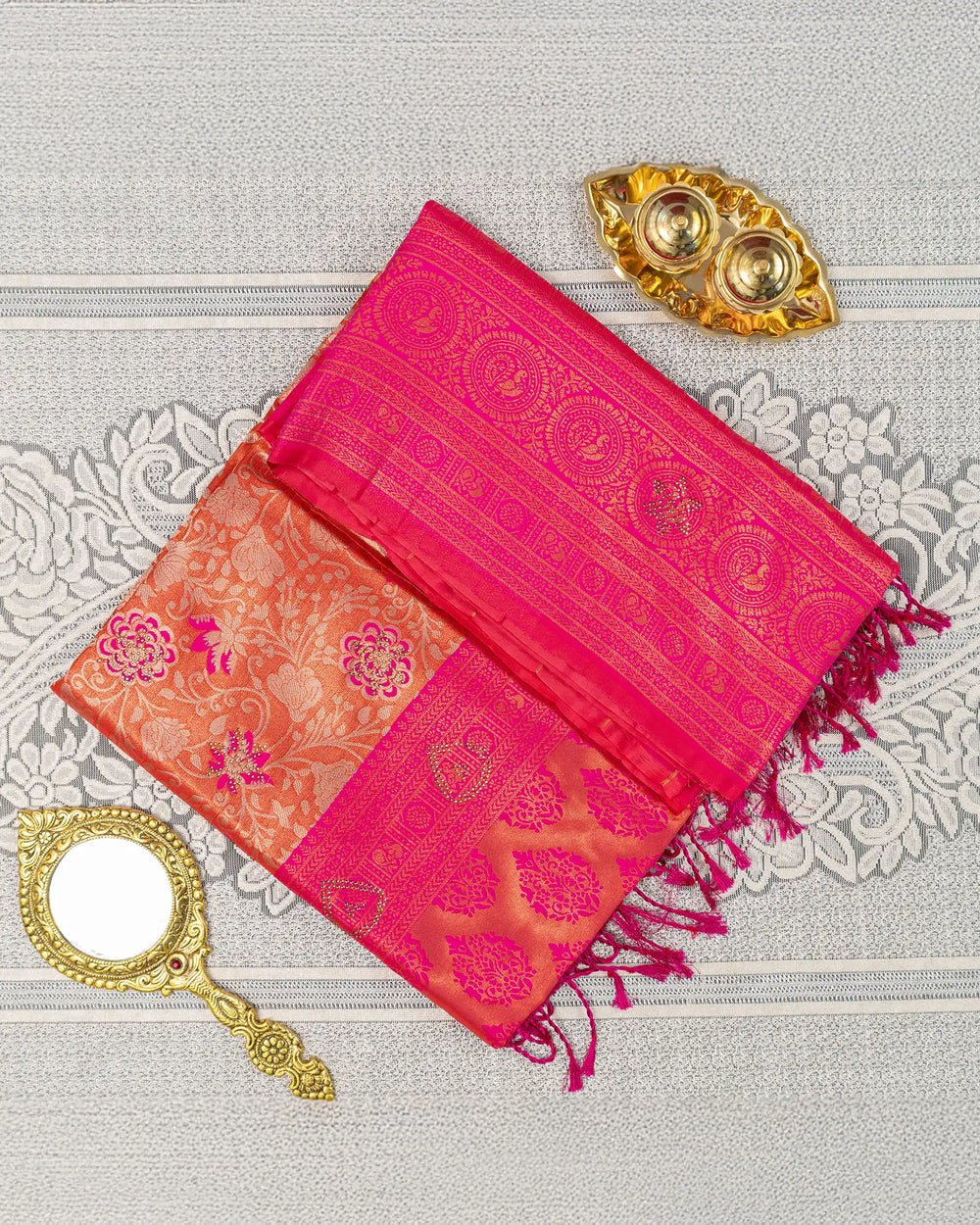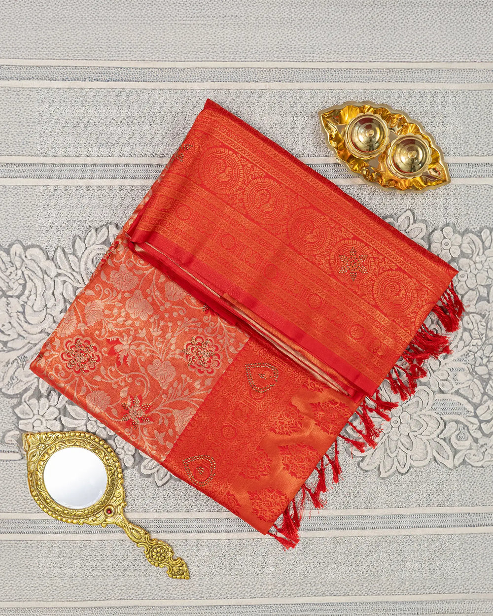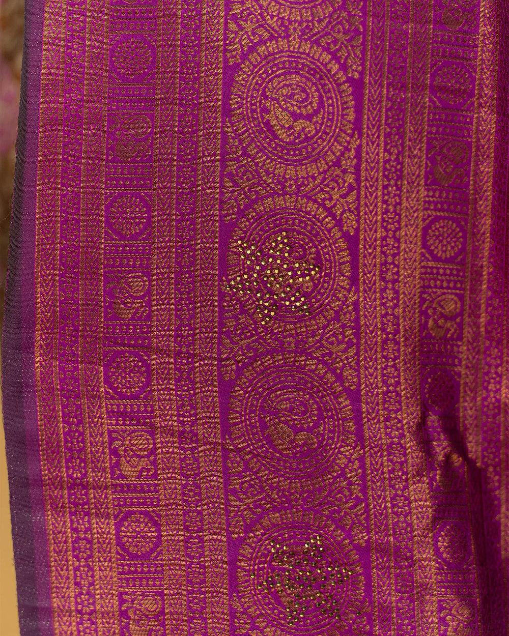 | Description | A premium Dharmavaram Pattu saree beautifully woven with intricate meena butta motifs, offering a rich texture and graceful fall. Perfect for weddings, festive occasions, and traditional celebrations. |