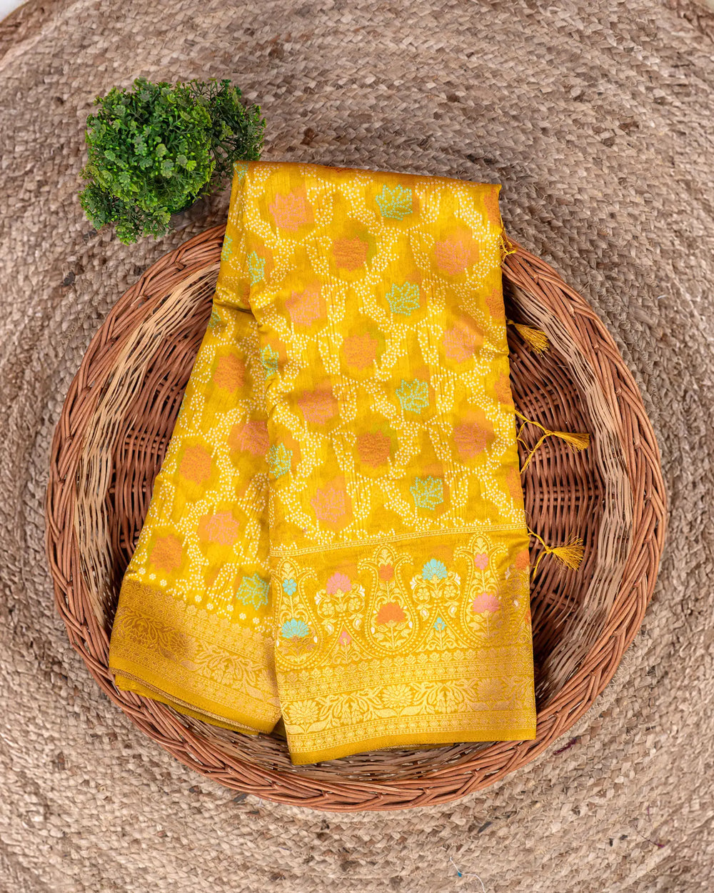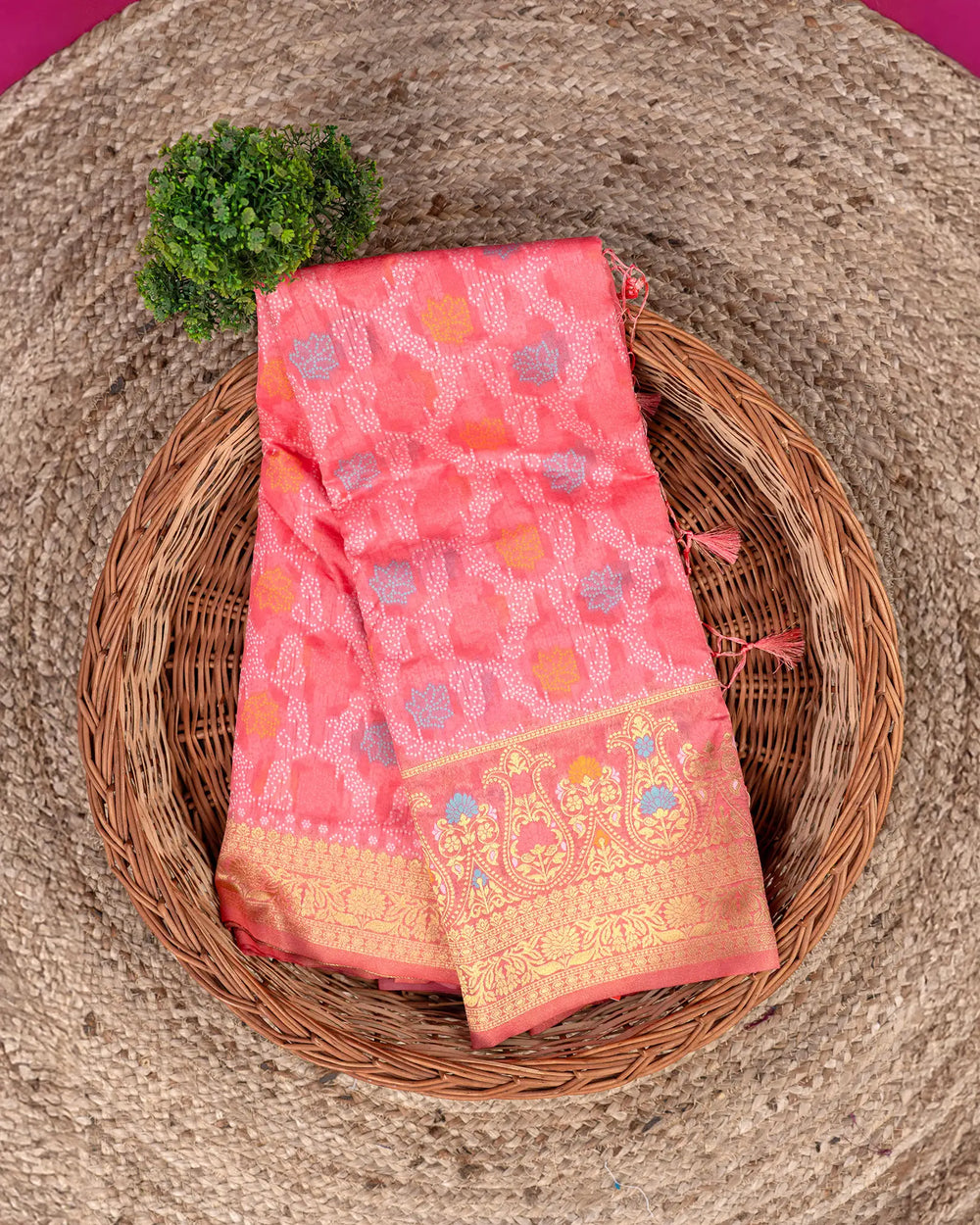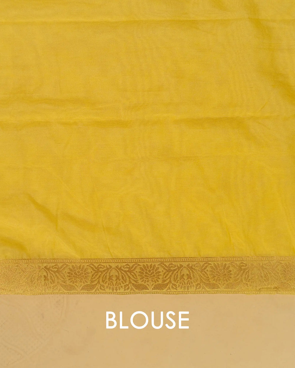 | Blouse | Running blouse with zari border along the hand, tailored to complement the Bandhini print’s rich design. |