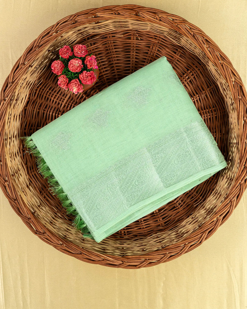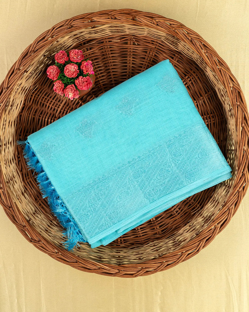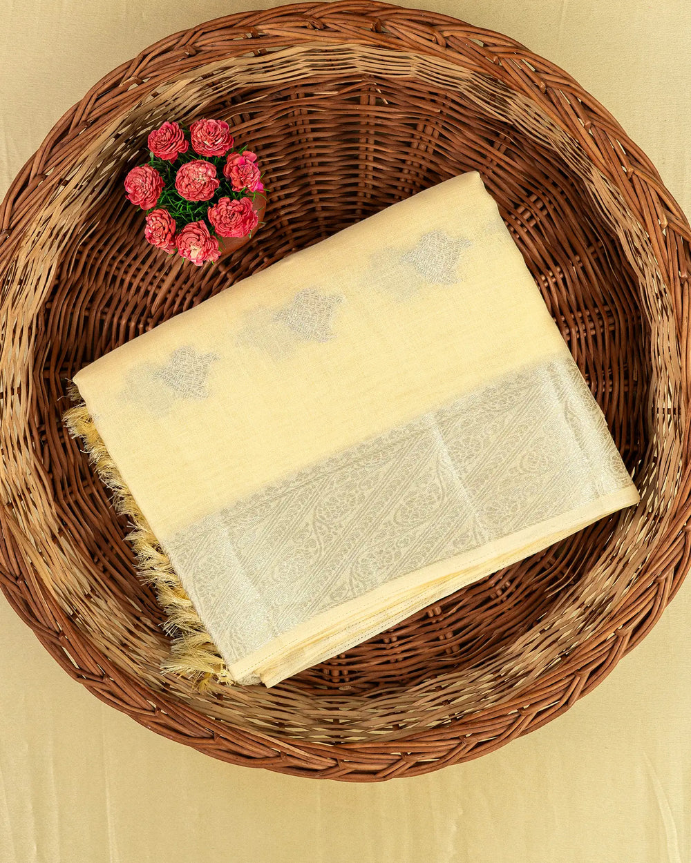 | Blouse | Running blouse featuring subtle silver lines that beautifully complement the saree’s butta detailing for a cohesive finish. |