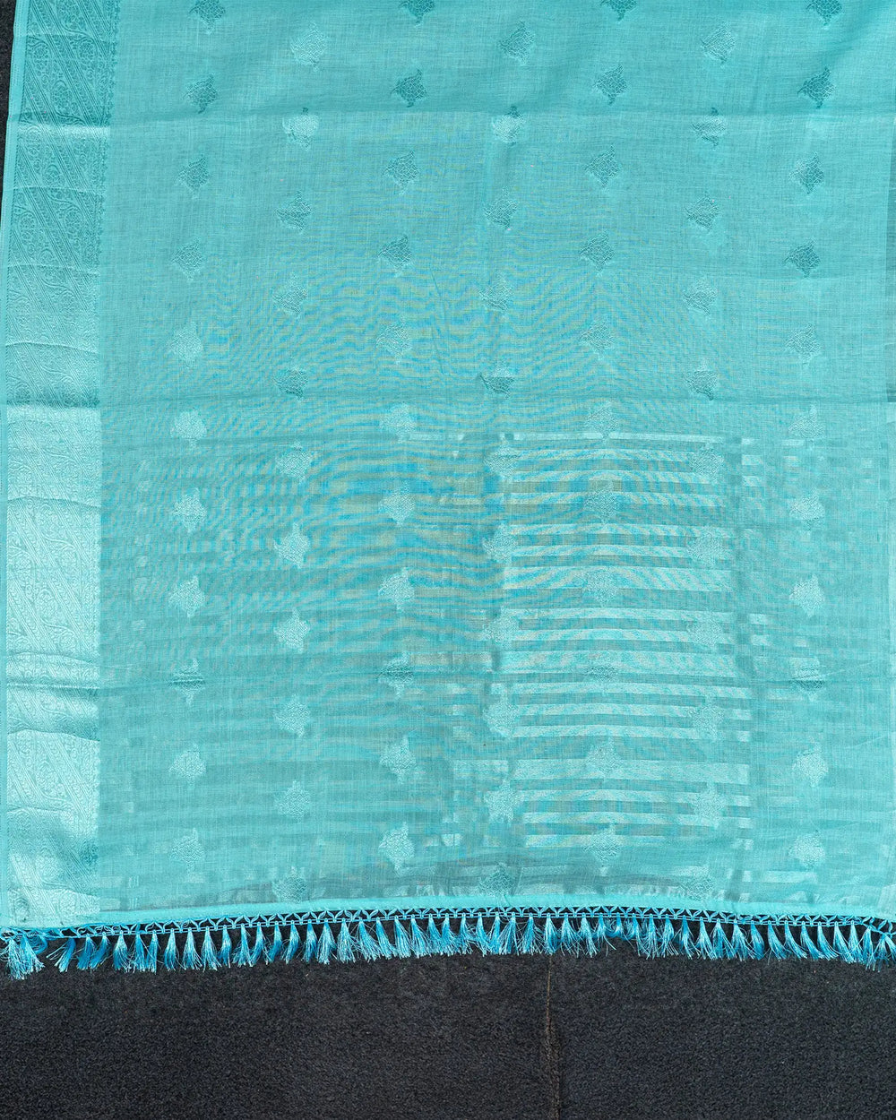 | Description | Elegant linen saree adorned with delicate silver butta work throughout the body, offering a refined and graceful traditional look with a modern touch. |