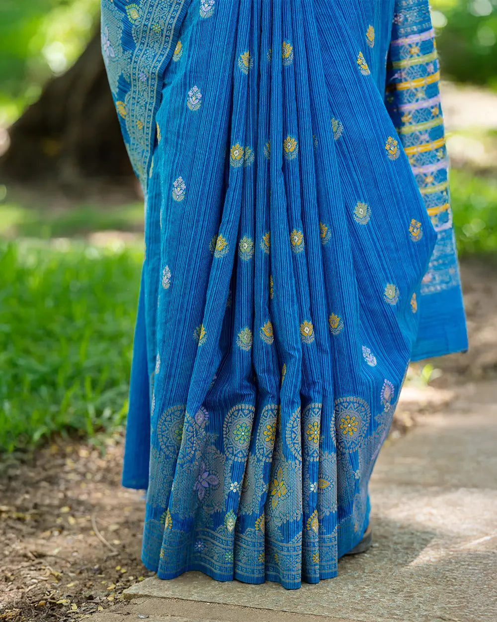| Description | Elegant cotton brasso saree featuring intricate meena butta work all over the body, combining traditional artistry with a light and breathable texture perfect for festive and casual wear. |
