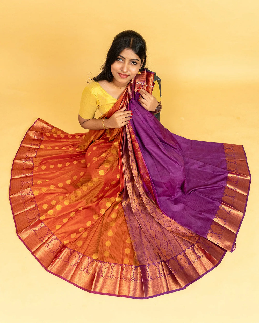 | Style | Luxurious silk saree enhanced with copper zari and embose butta patterns, ideal for weddings, receptions, and festive celebrations. |