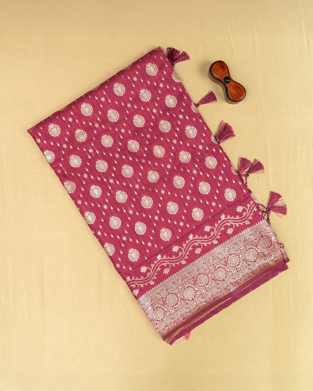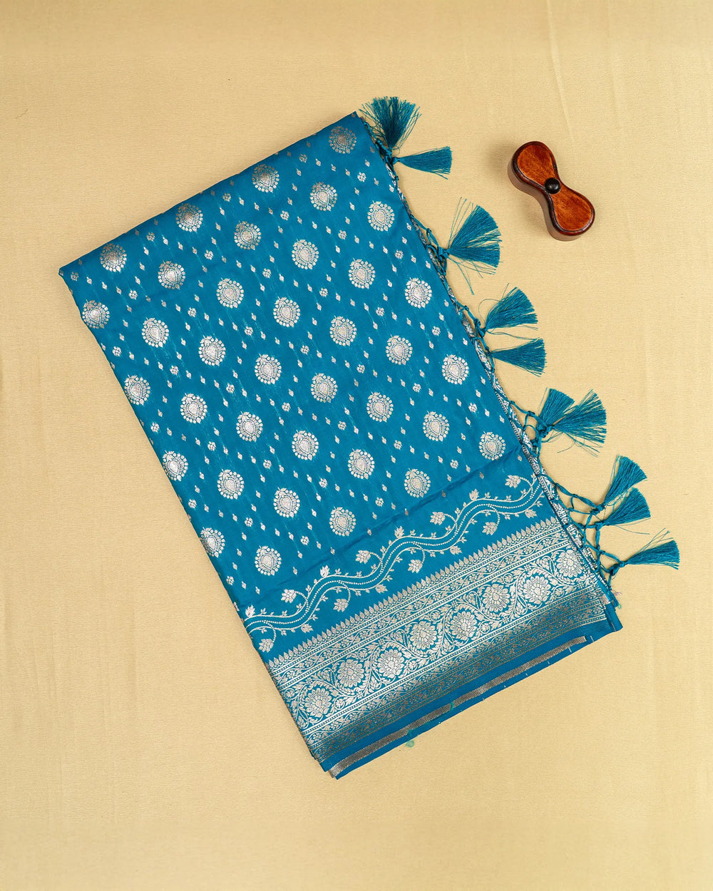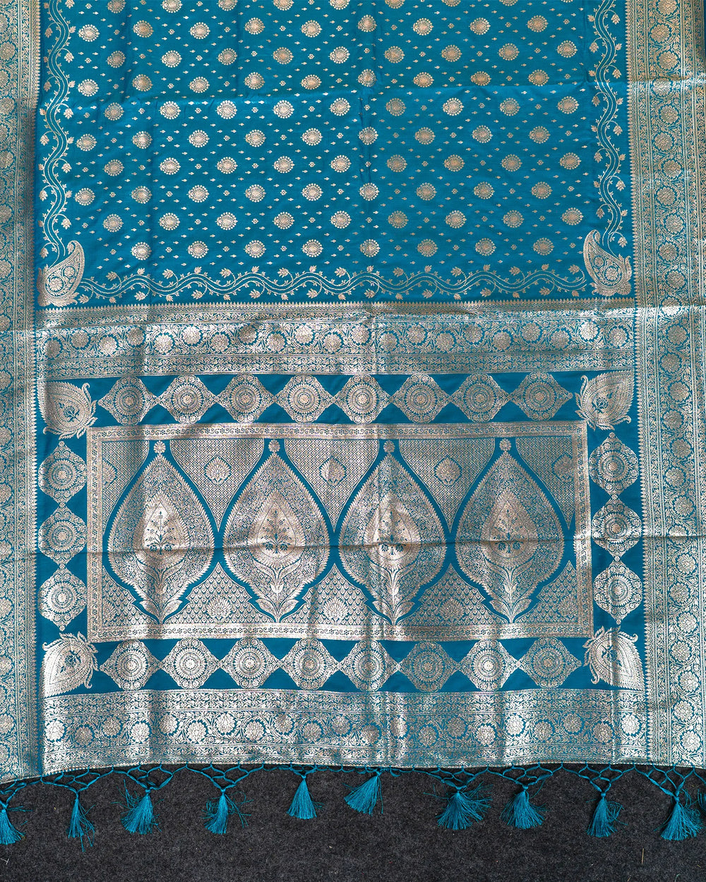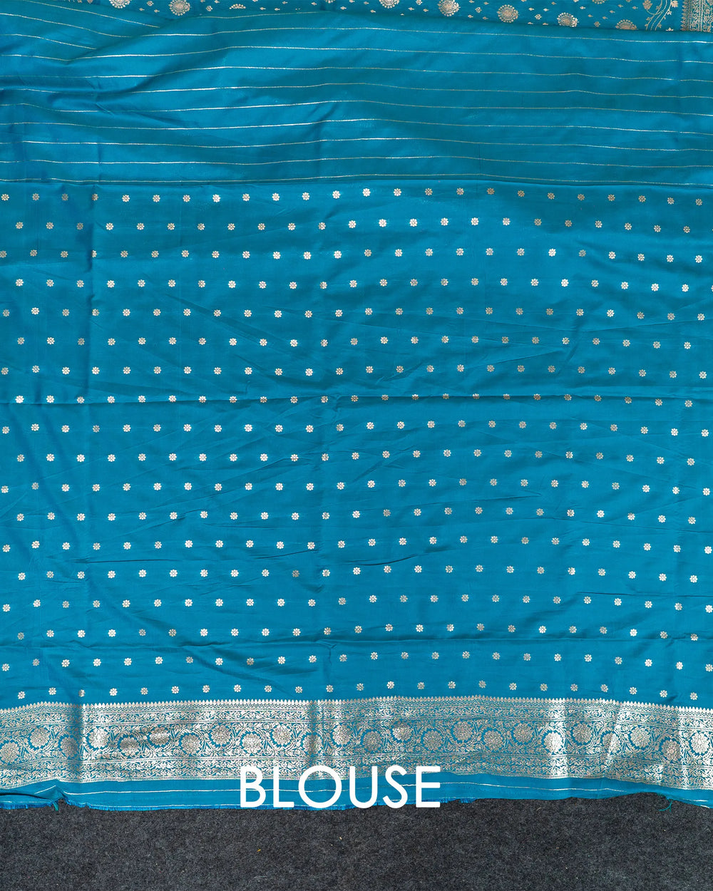 | Blouse | Running Blouse with Gold Butta, crafted to perfectly complement the saree’s shine and elegance. Designed for a comfortable fit, it adds a touch of sophistication to the overall look. |