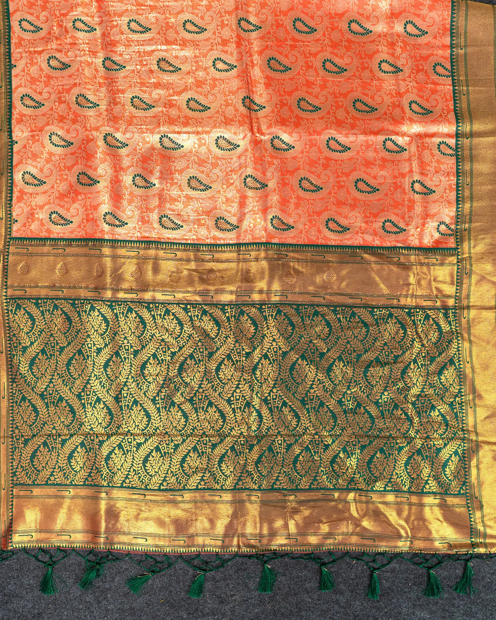 | Description | Graceful tissue saree adorned with Meena Butta detailing, offering a rich blend of shimmer and elegance, perfect for festive and ceremonial occasions. |