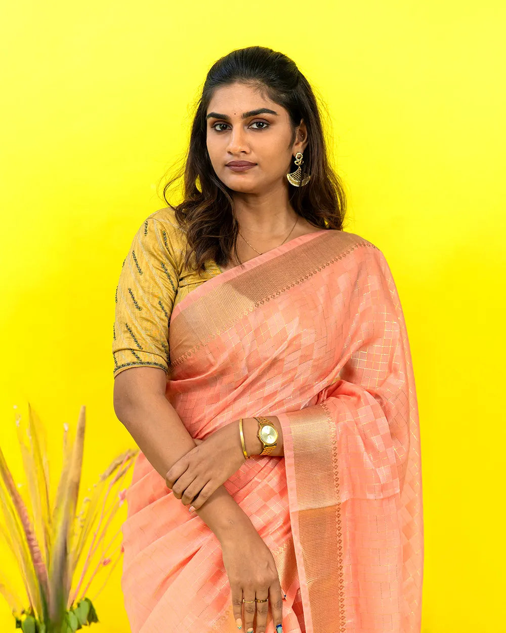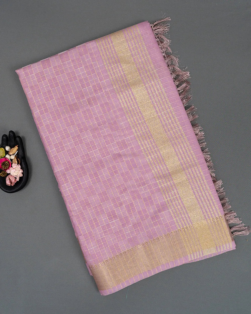 | Style | Linen saree enhanced with zari checked patterns, ideal for festive gatherings, office wear, and traditional celebrations. |
