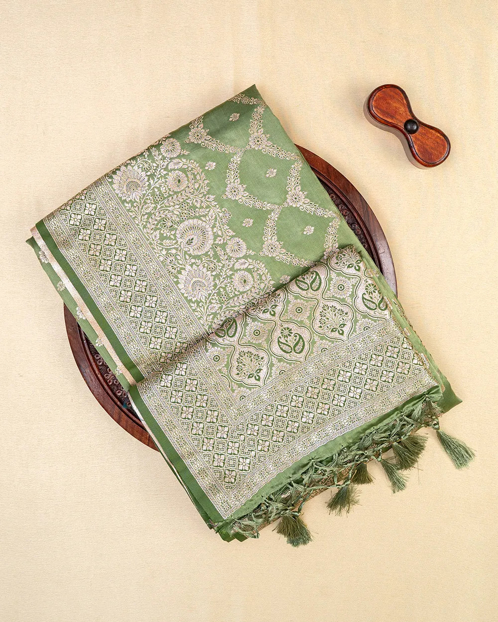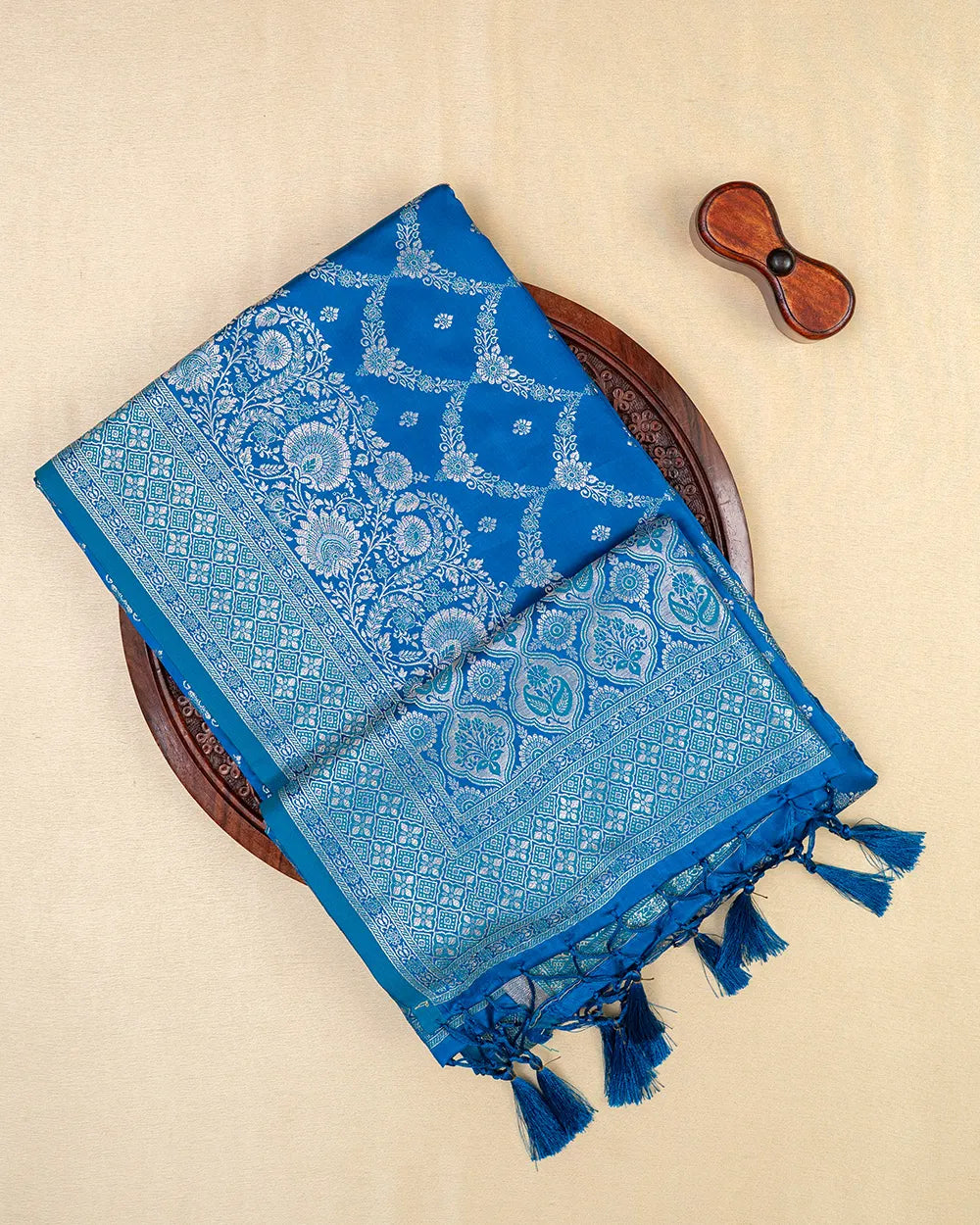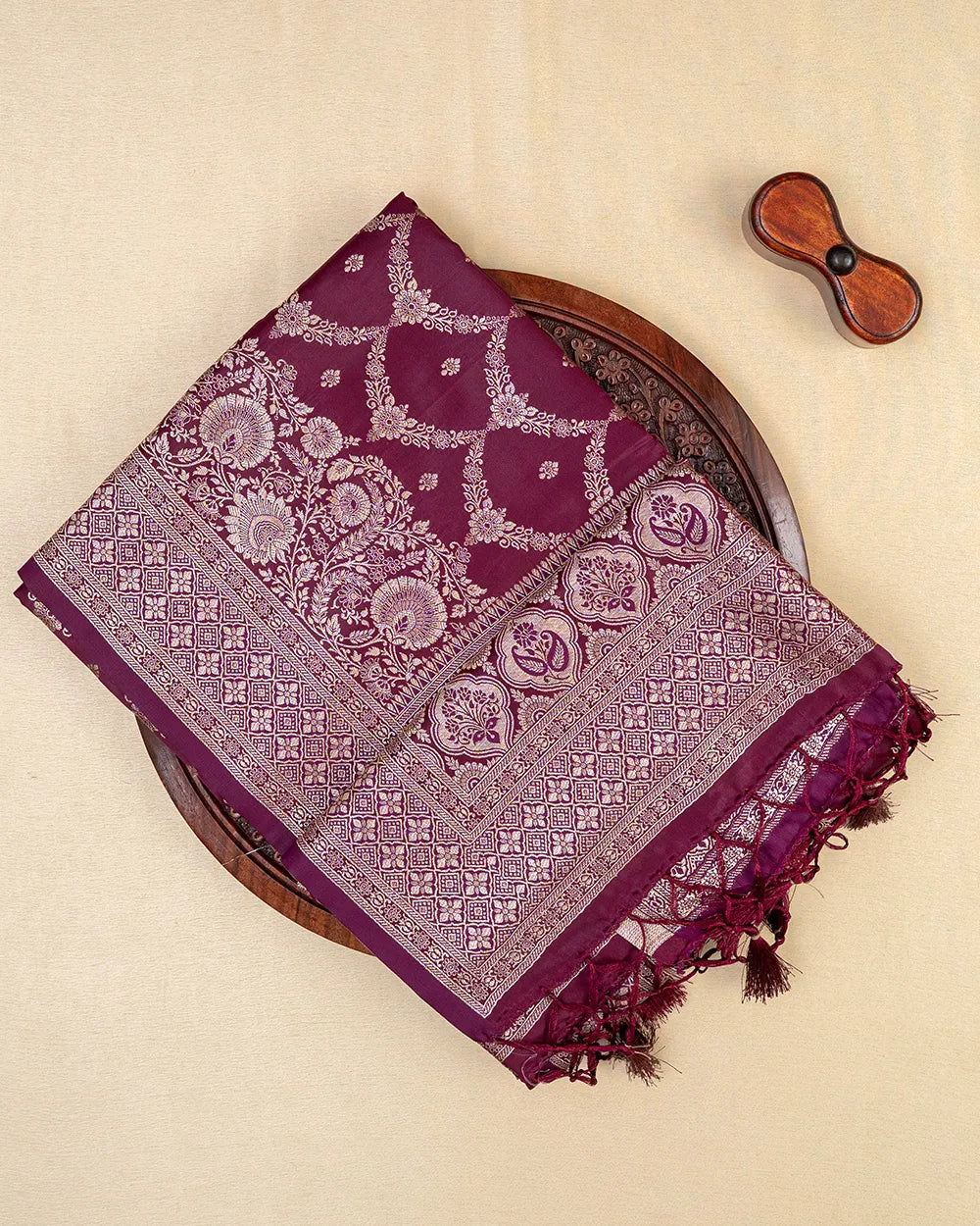 | Blouse | Running embossed blouse that enhances the saree’s sophistication and complements its glossy texture. |