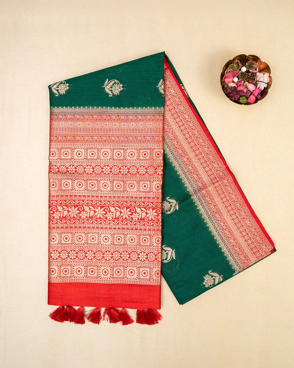 | Fabric | Premium raw silk with a natural sheen and soft texture. |