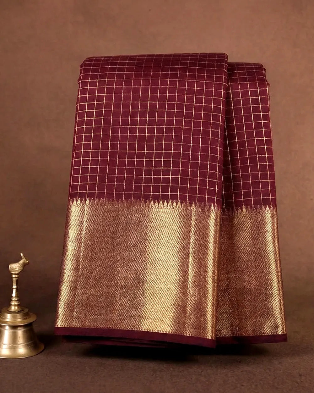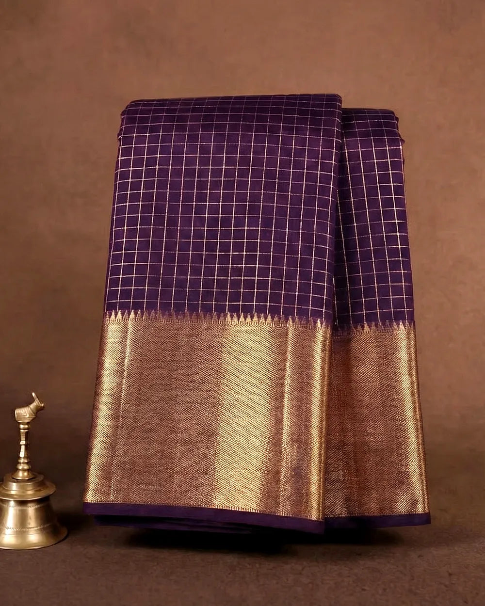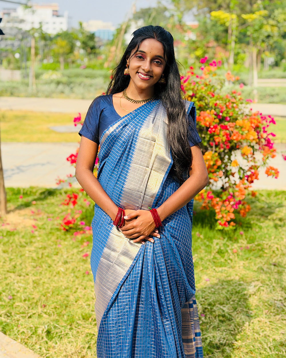 | Style | Contemporary checked saree paired with a running blouse, suitable for office wear, casual outings, and small gatherings. |