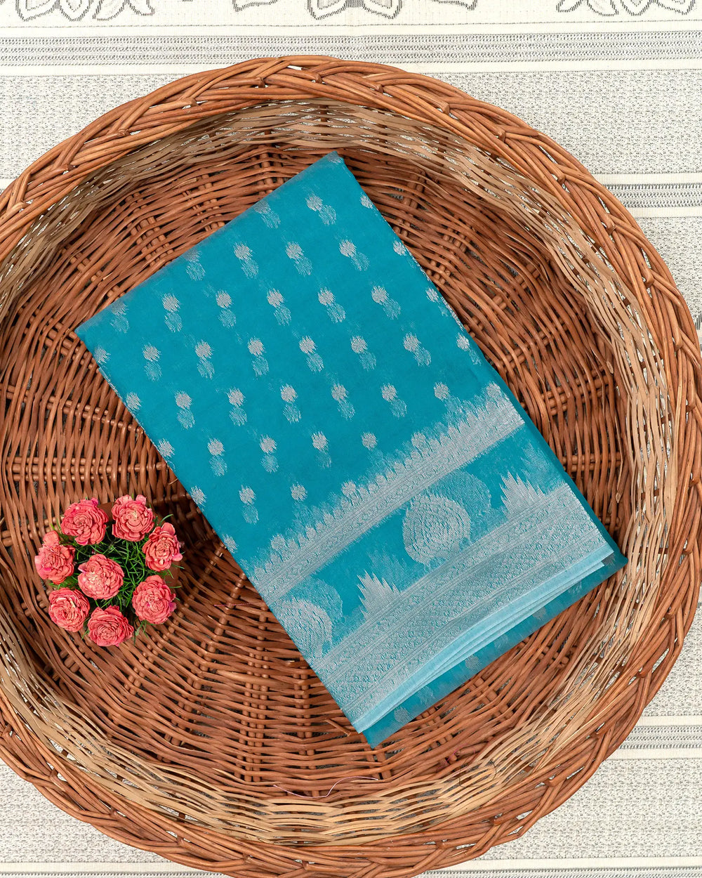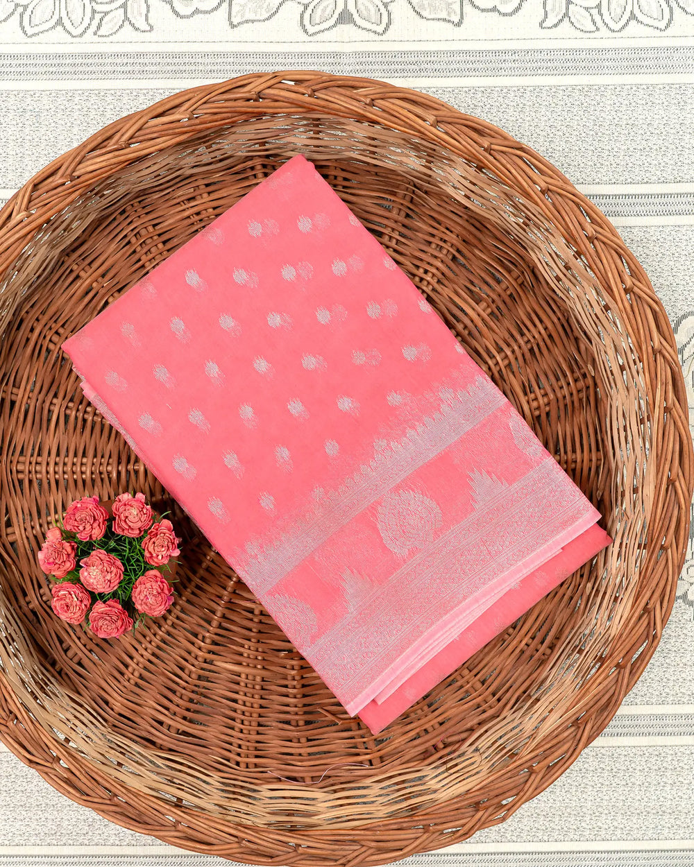 | Style | Classic gold zari motifs enhancing the rich silk cotton fabric |