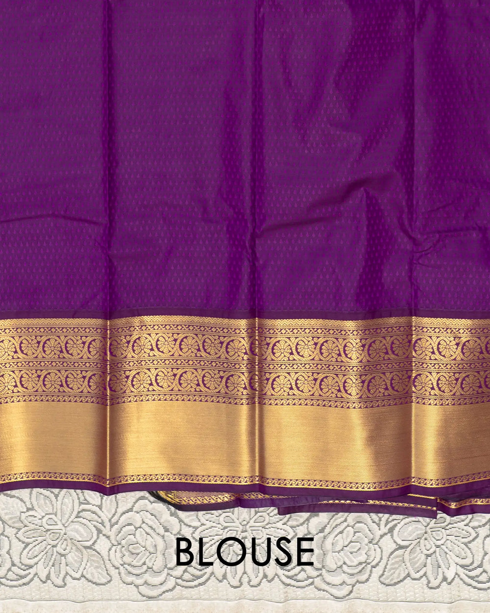 | Style | Embossed blouse with bold gold zari border enhancing the rich silk saree |