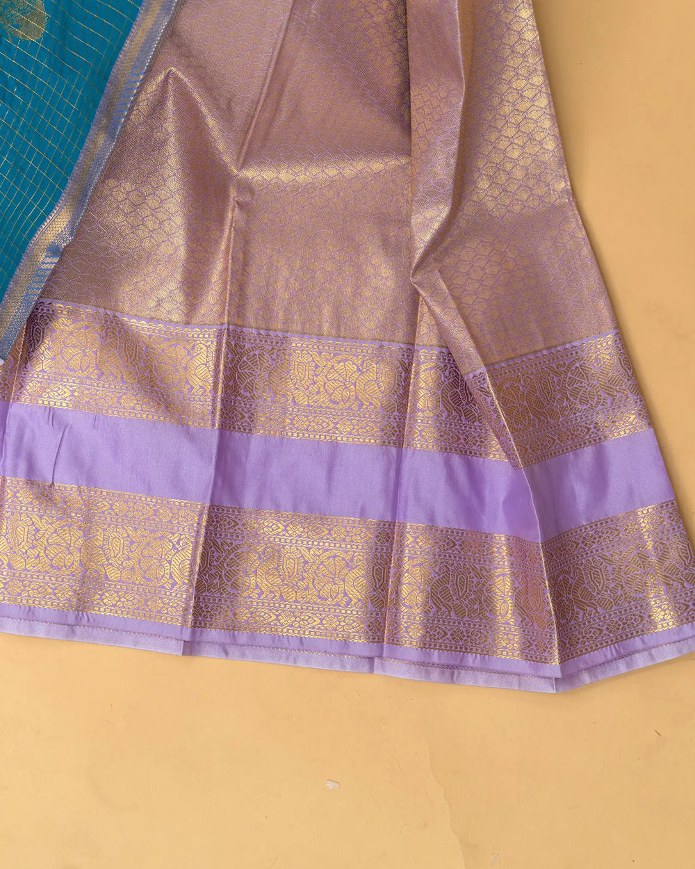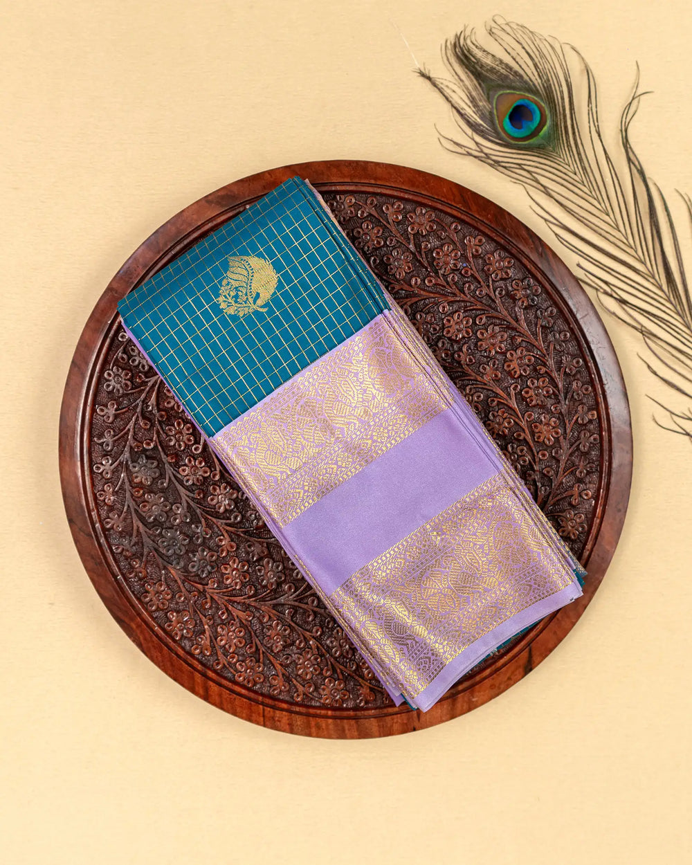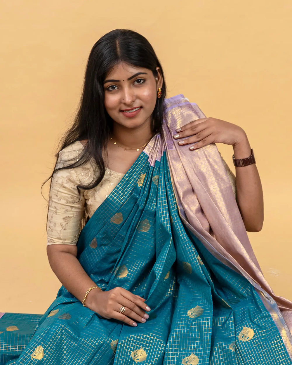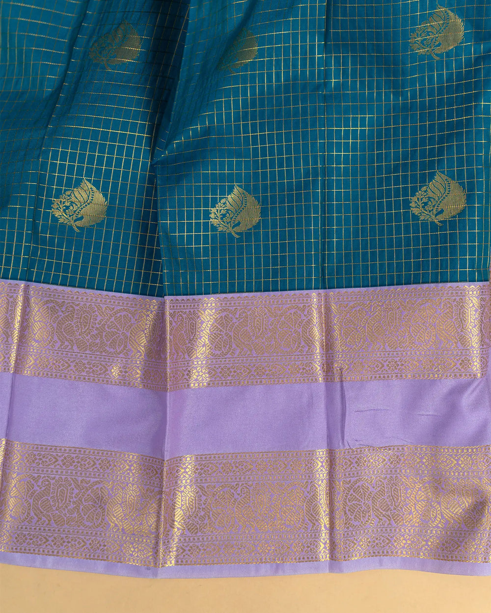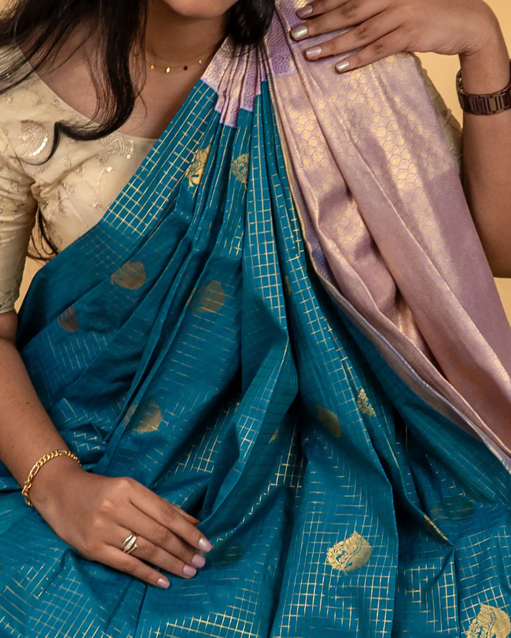 | Style | Traditional silk saree design with checked gold butta, ideal for festive and sophisticated styling |