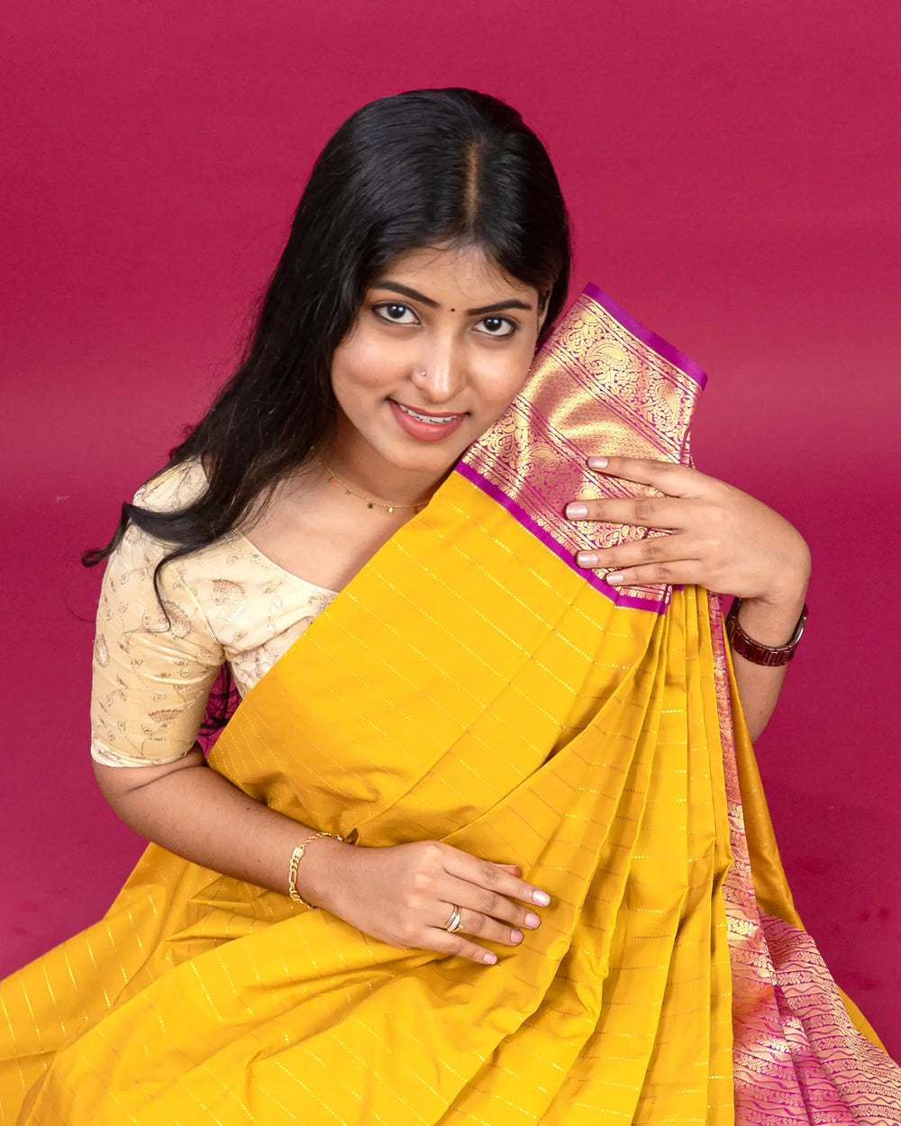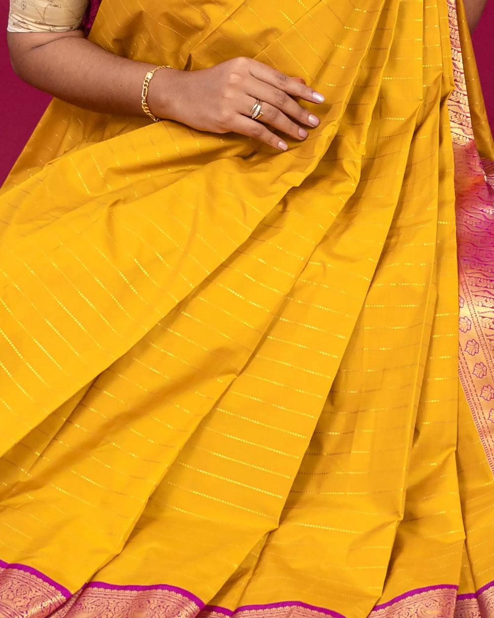 | Style | Traditional silk saree design with zari accents, perfect for sophisticated styling |