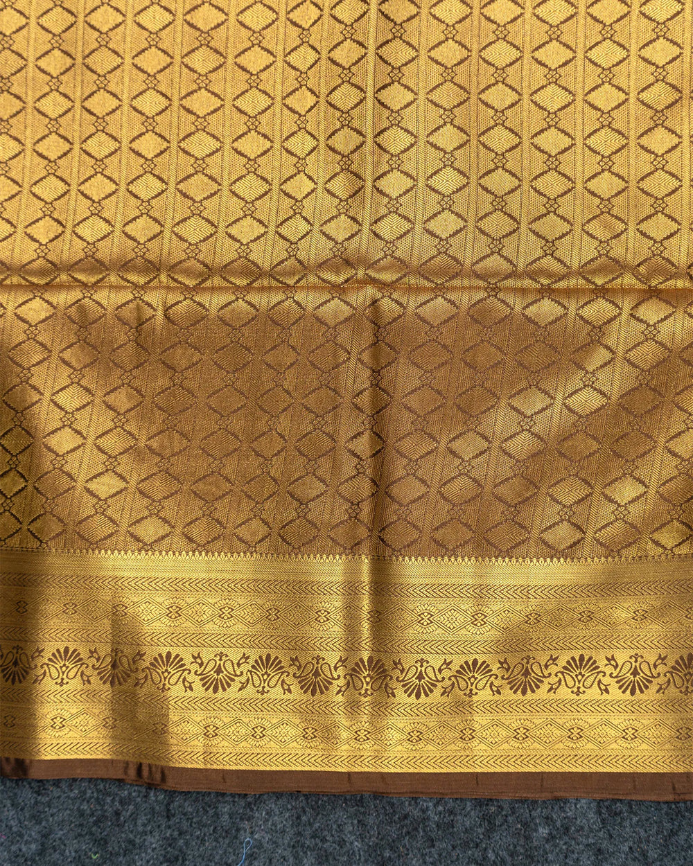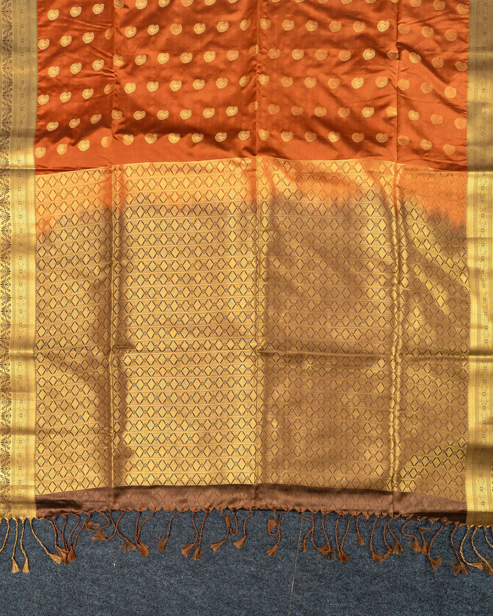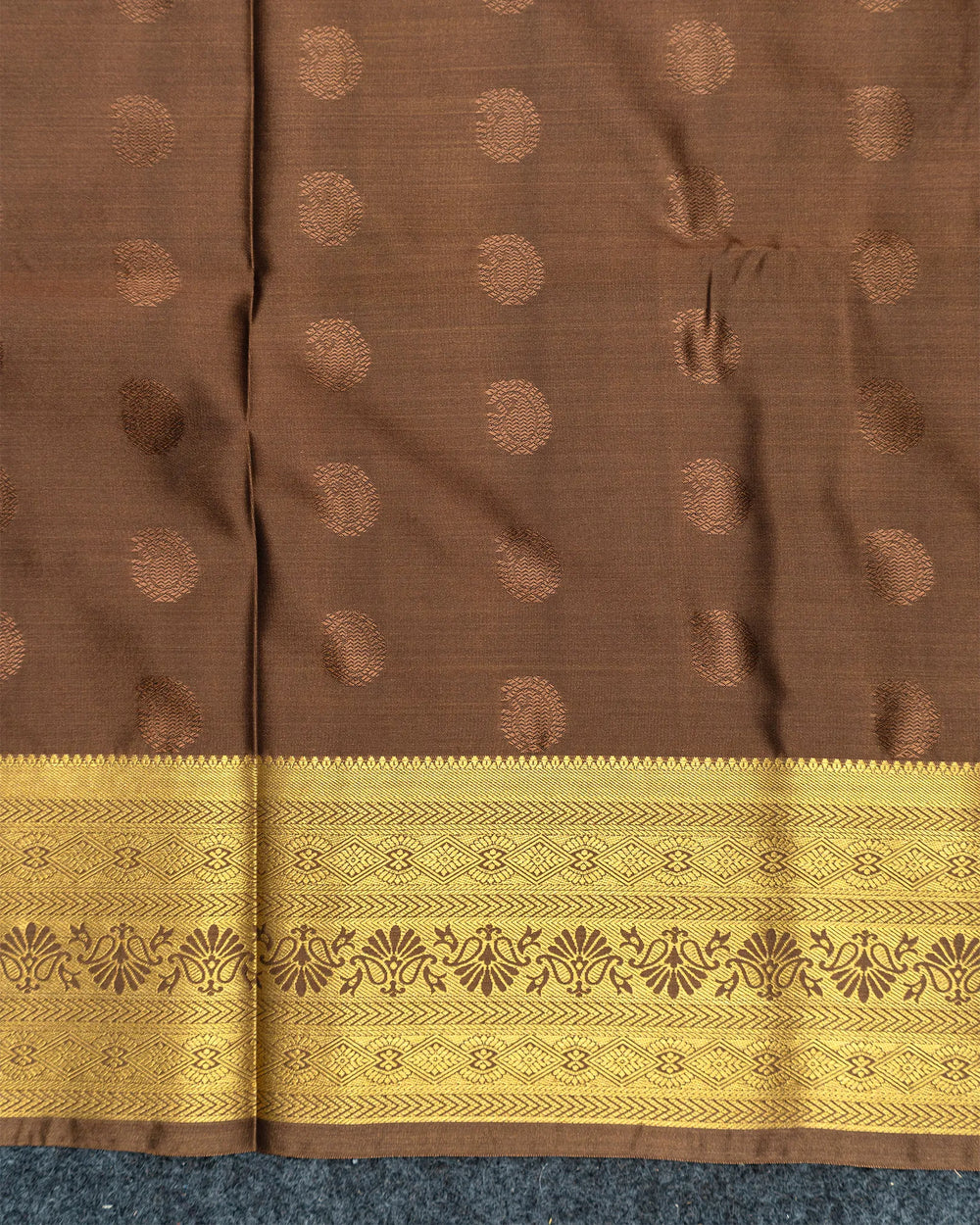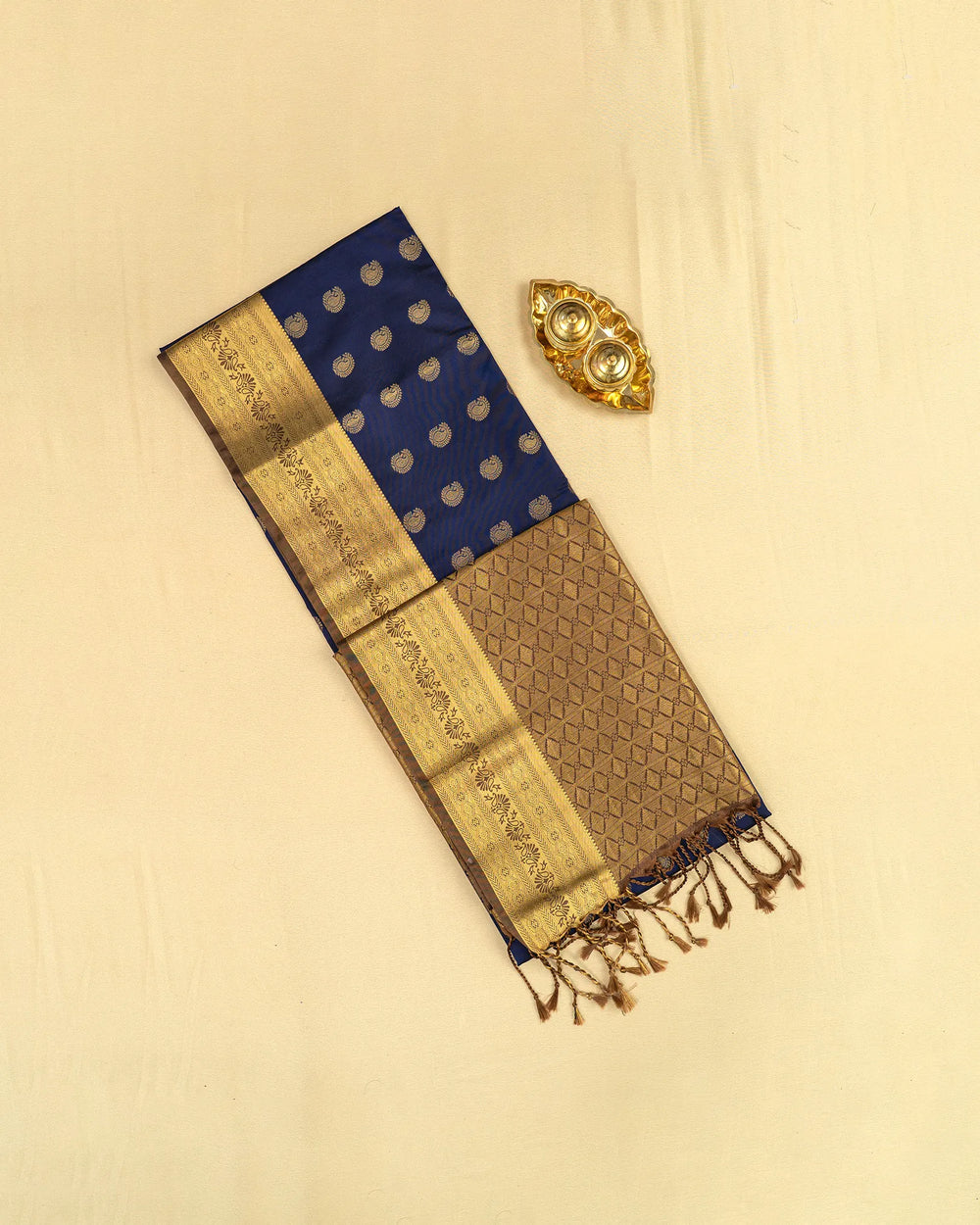| Description | Luxurious soft silk saree adorned with intricate gold Zari butta, paired with a striking contrast border for an elegant and festive look suitable for weddings and celebrations. |
