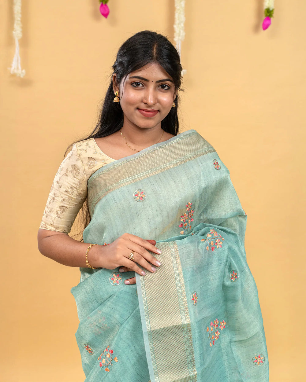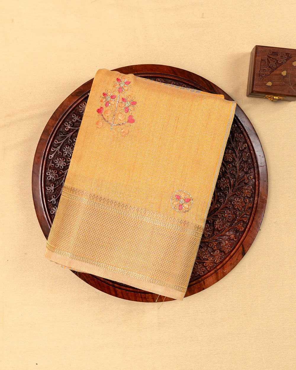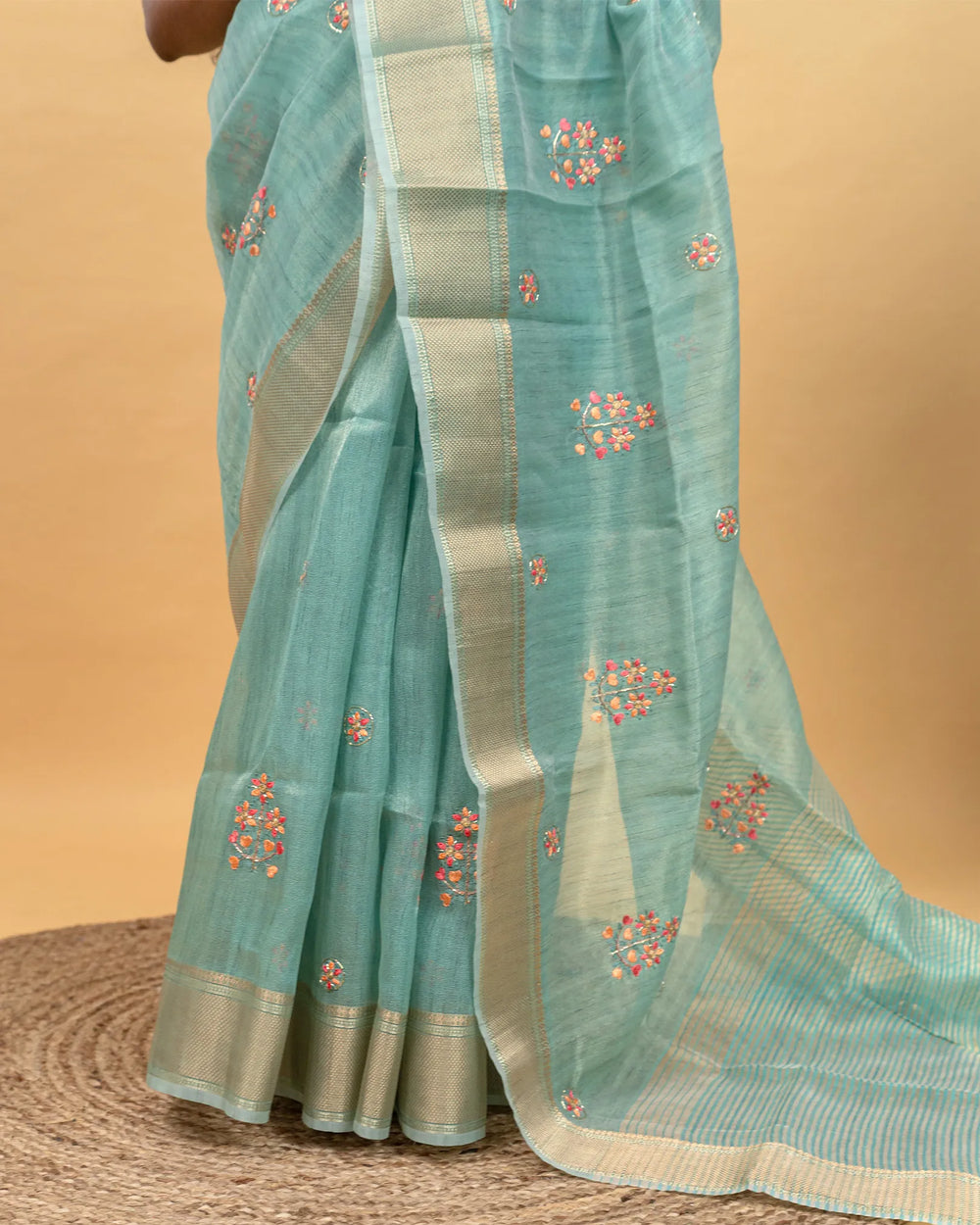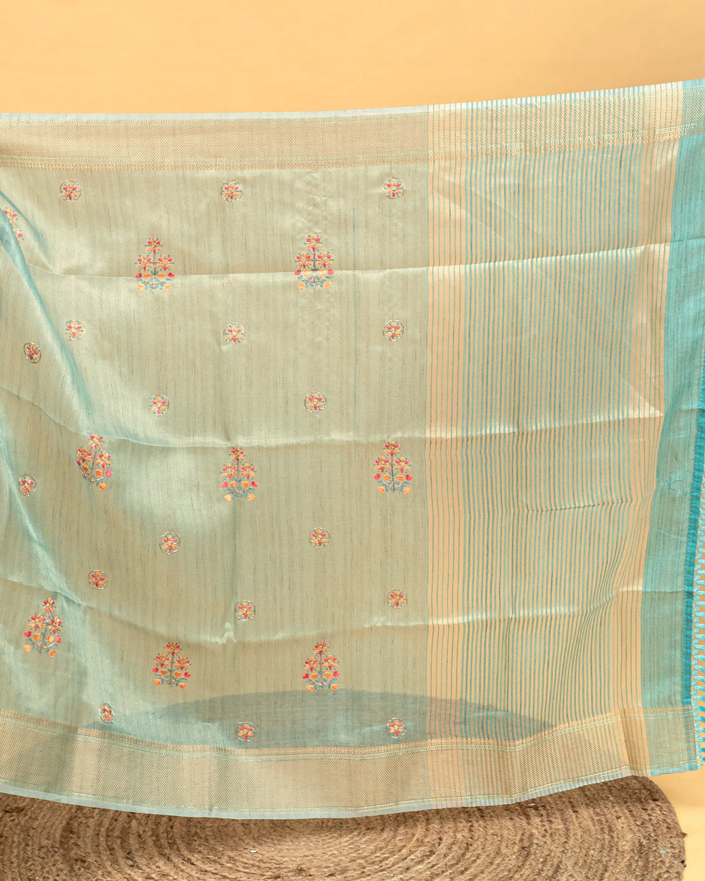| Description | A graceful tissue saree enriched with delicate embroidery and highlighted by intricate Jarjoshi work. Perfect for festive occasions and grand celebrations, this saree blends subtle shine with artisanal craftsmanship. |