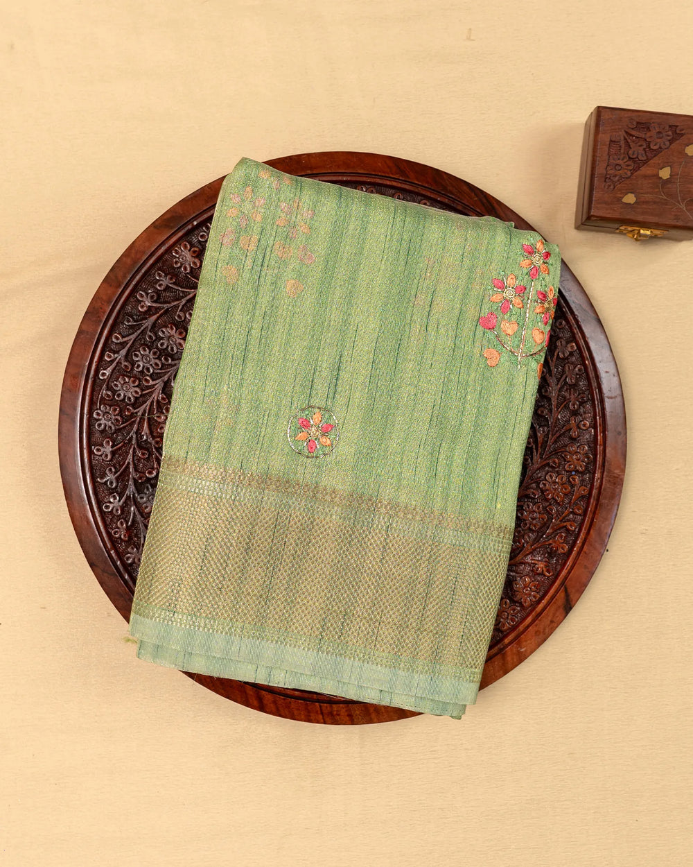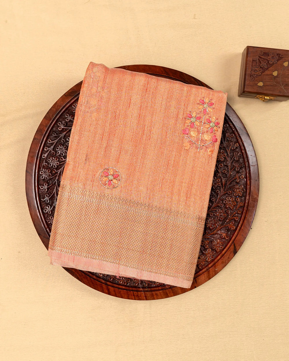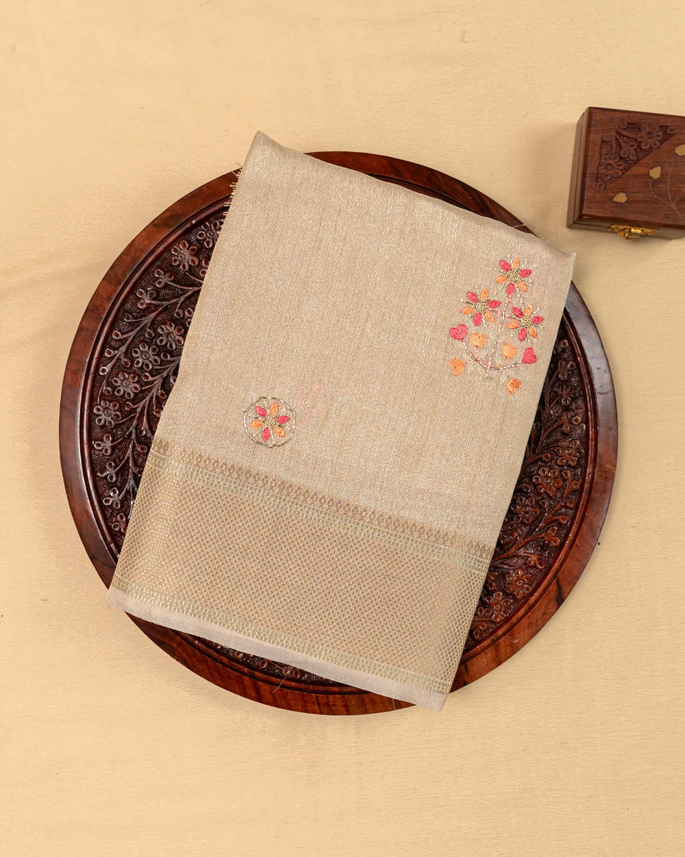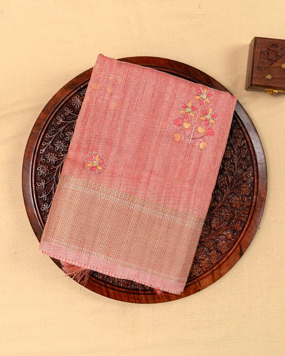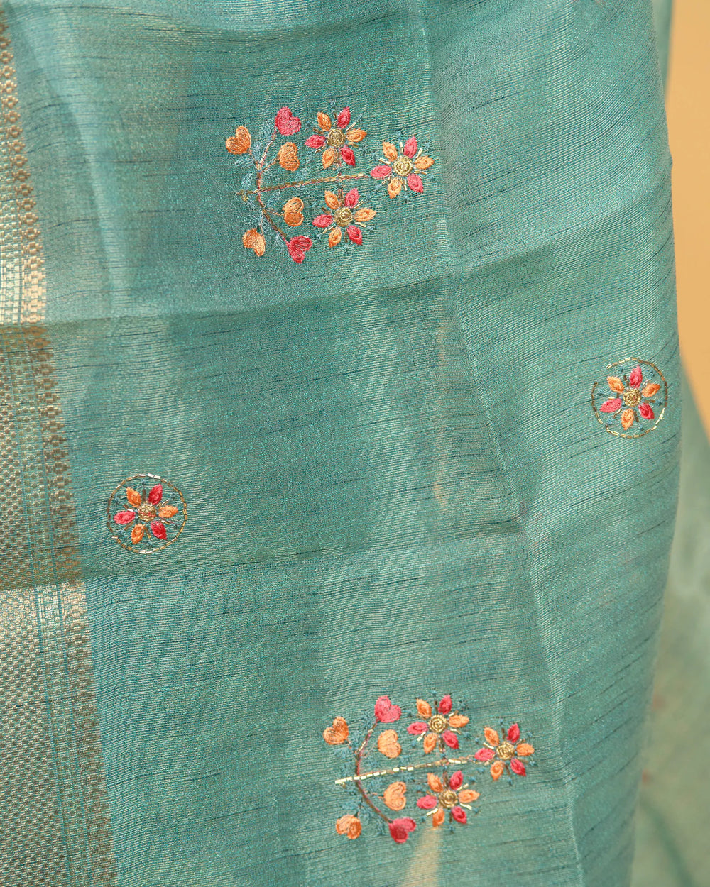 | Description | A graceful tissue saree enriched with delicate embroidery and highlighted by intricate Jarjoshi work. Perfect for festive occasions and grand celebrations, this saree blends subtle shine with artisanal craftsmanship. |