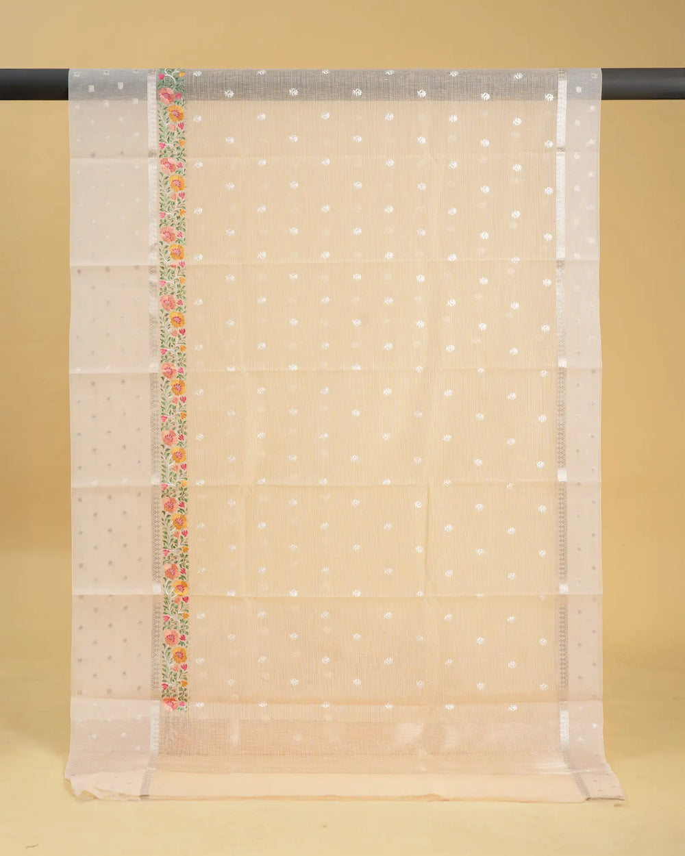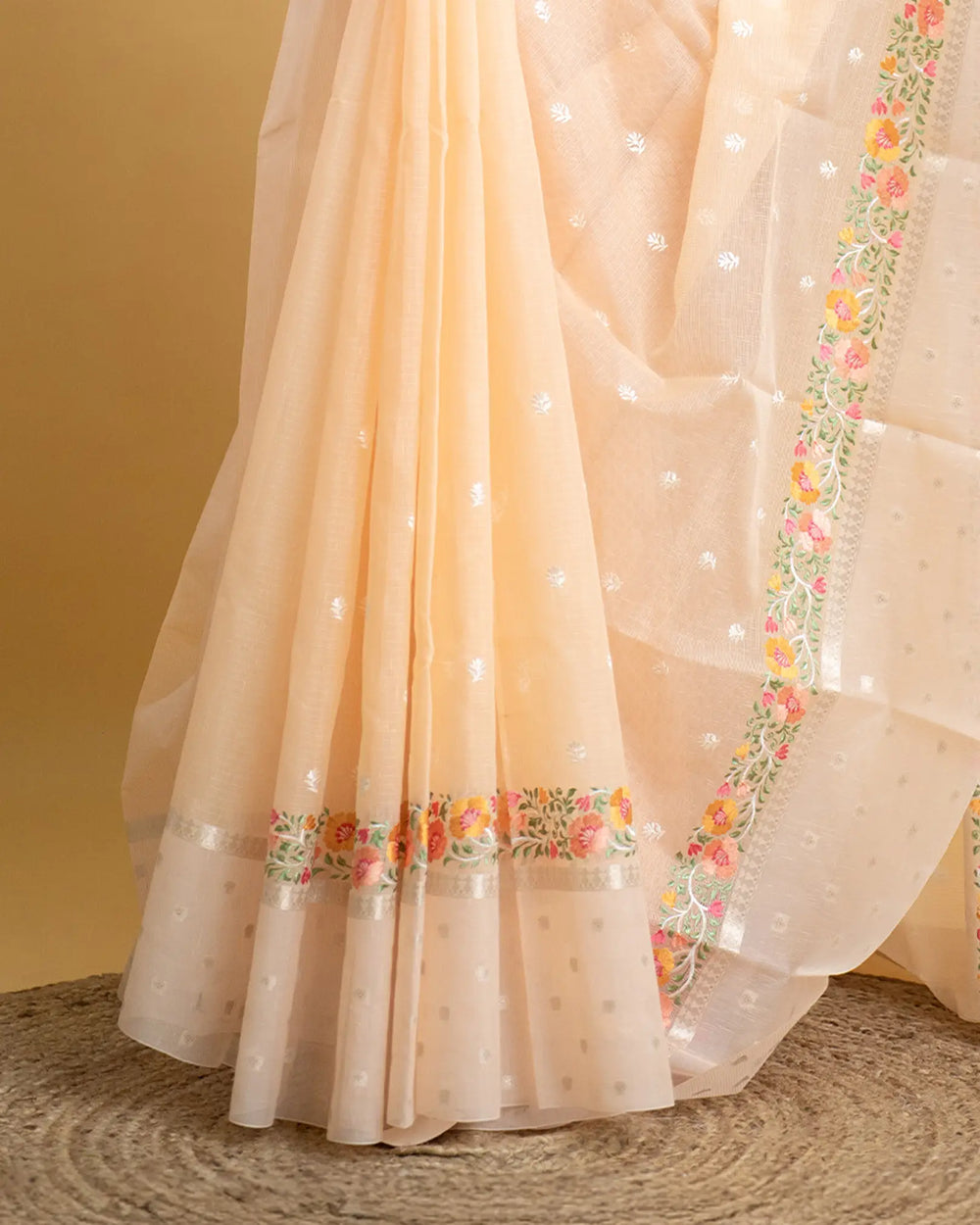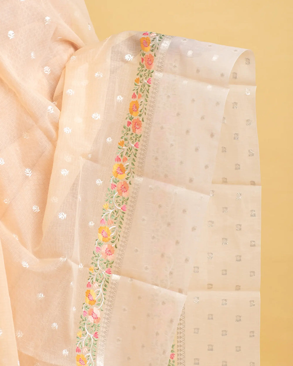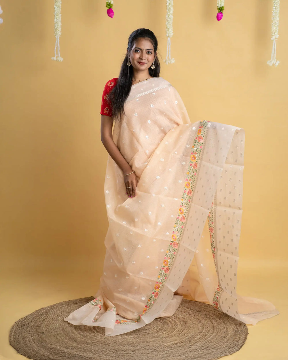 | Description | The Tissue Linen Saree with Fancy Border & Meena Flower Embroidery beautifully combines the lightweight elegance of tissue linen with exquisite floral embroidery. Featuring a decorative fancy border and delicate Meena flower patterns, this saree is perfect for festive occasions and elegant gatherings. |