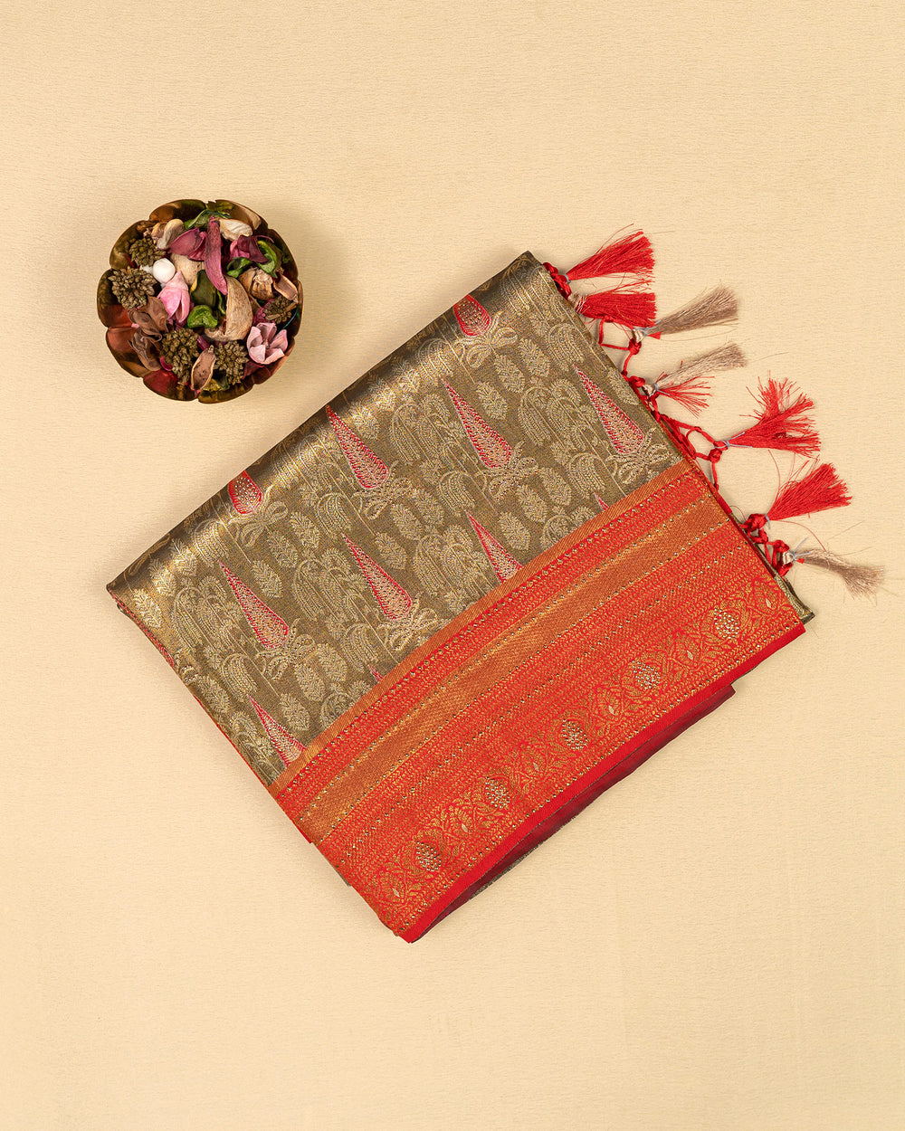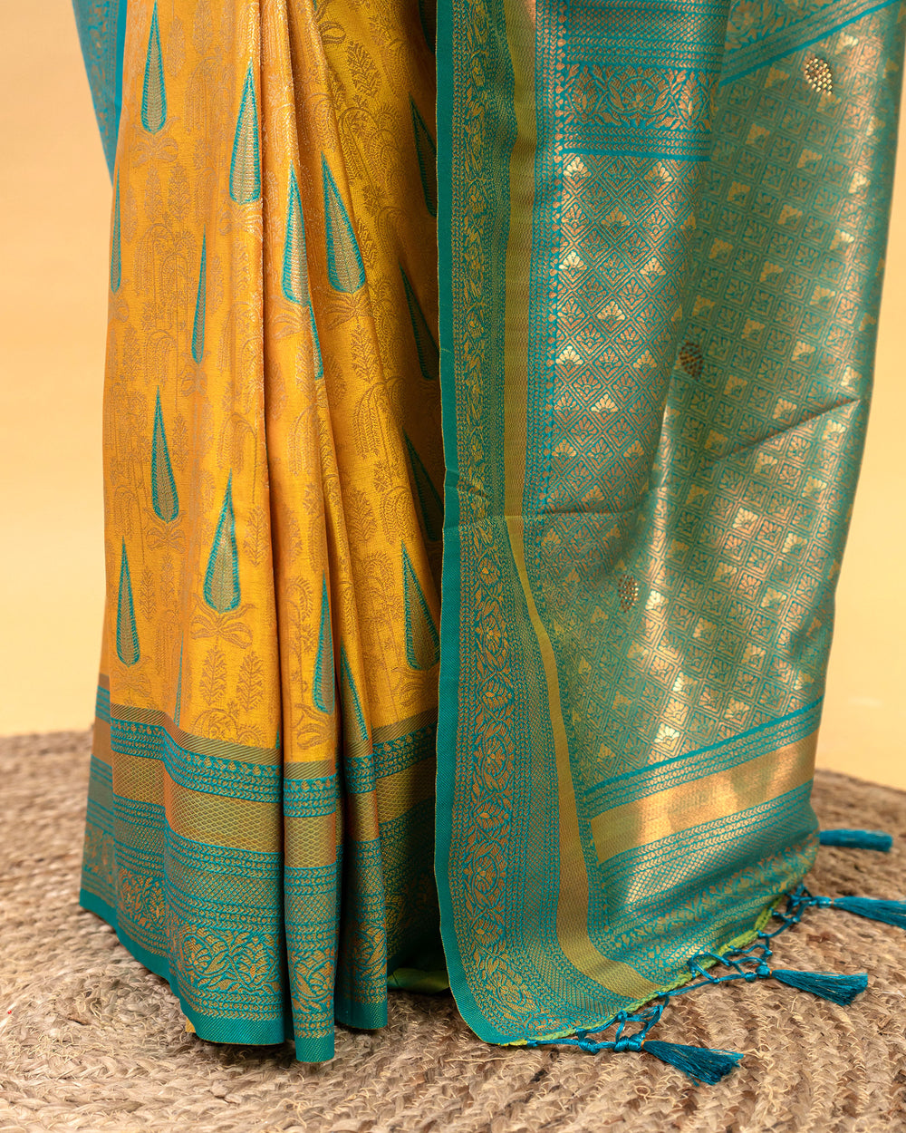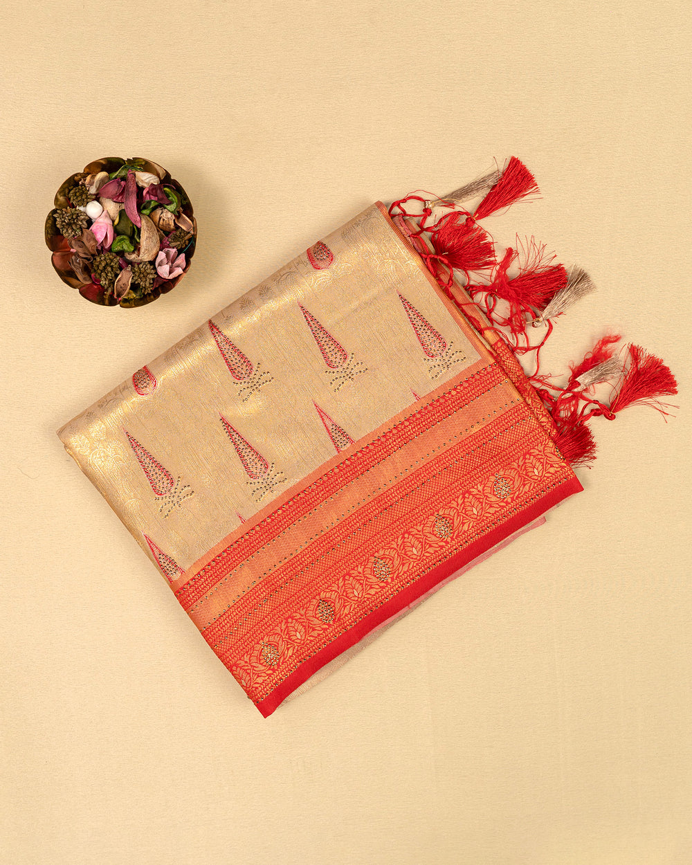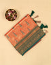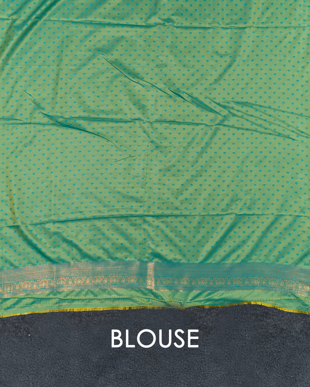 | Blouse | Running embossed blouse with gold border on hand, enhancing the luxurious appeal of the saree |