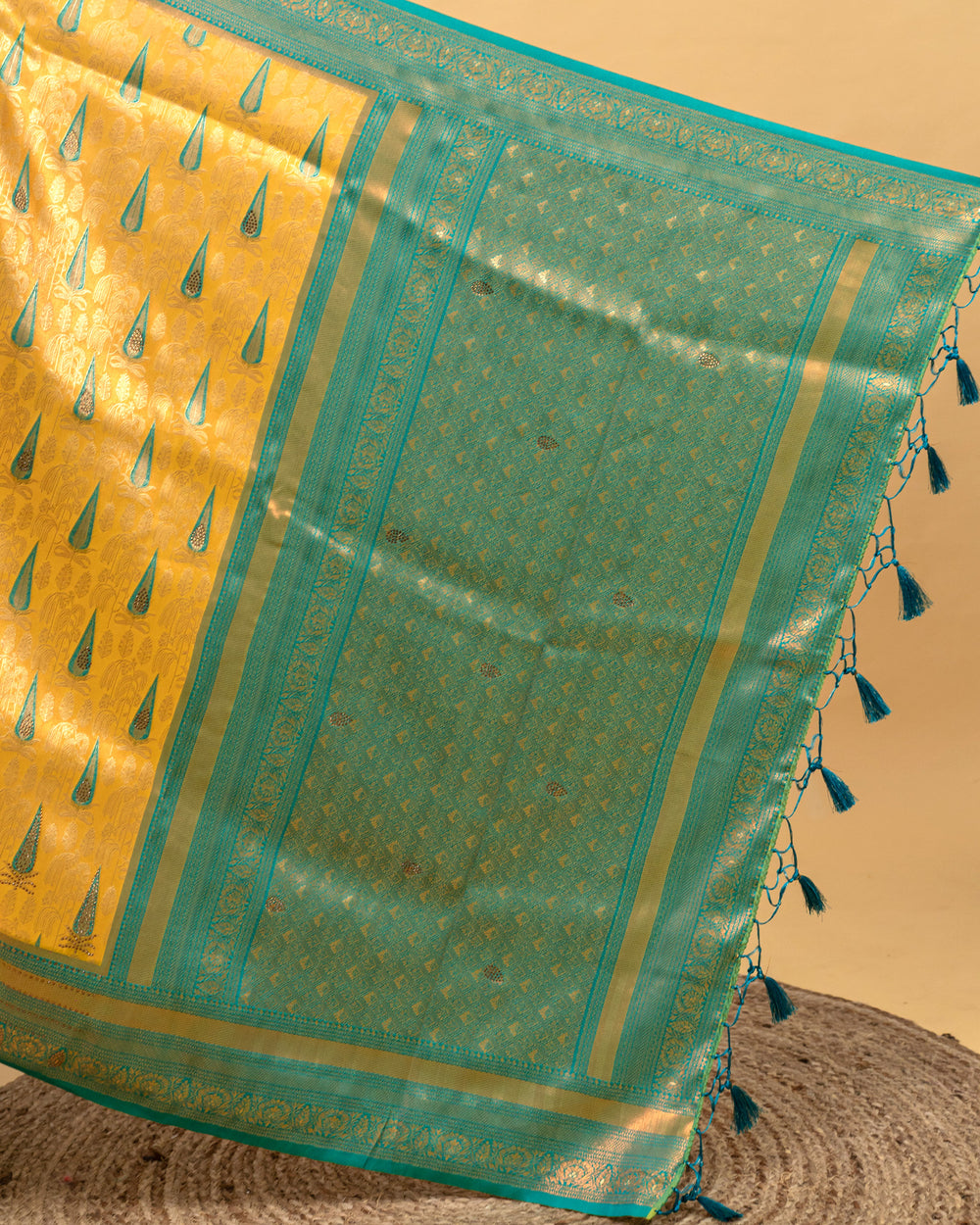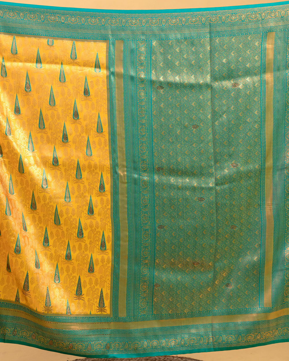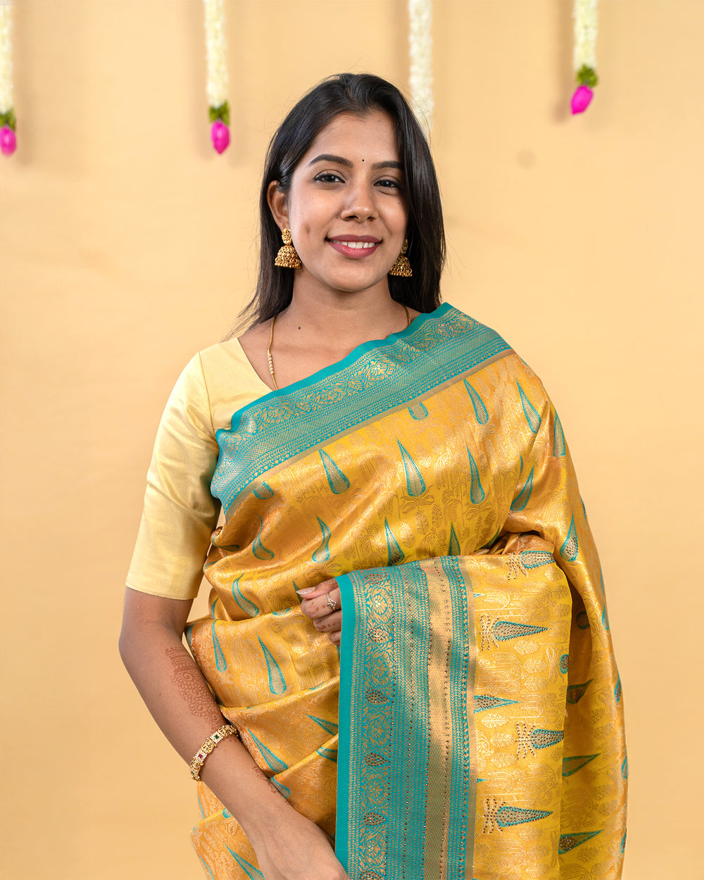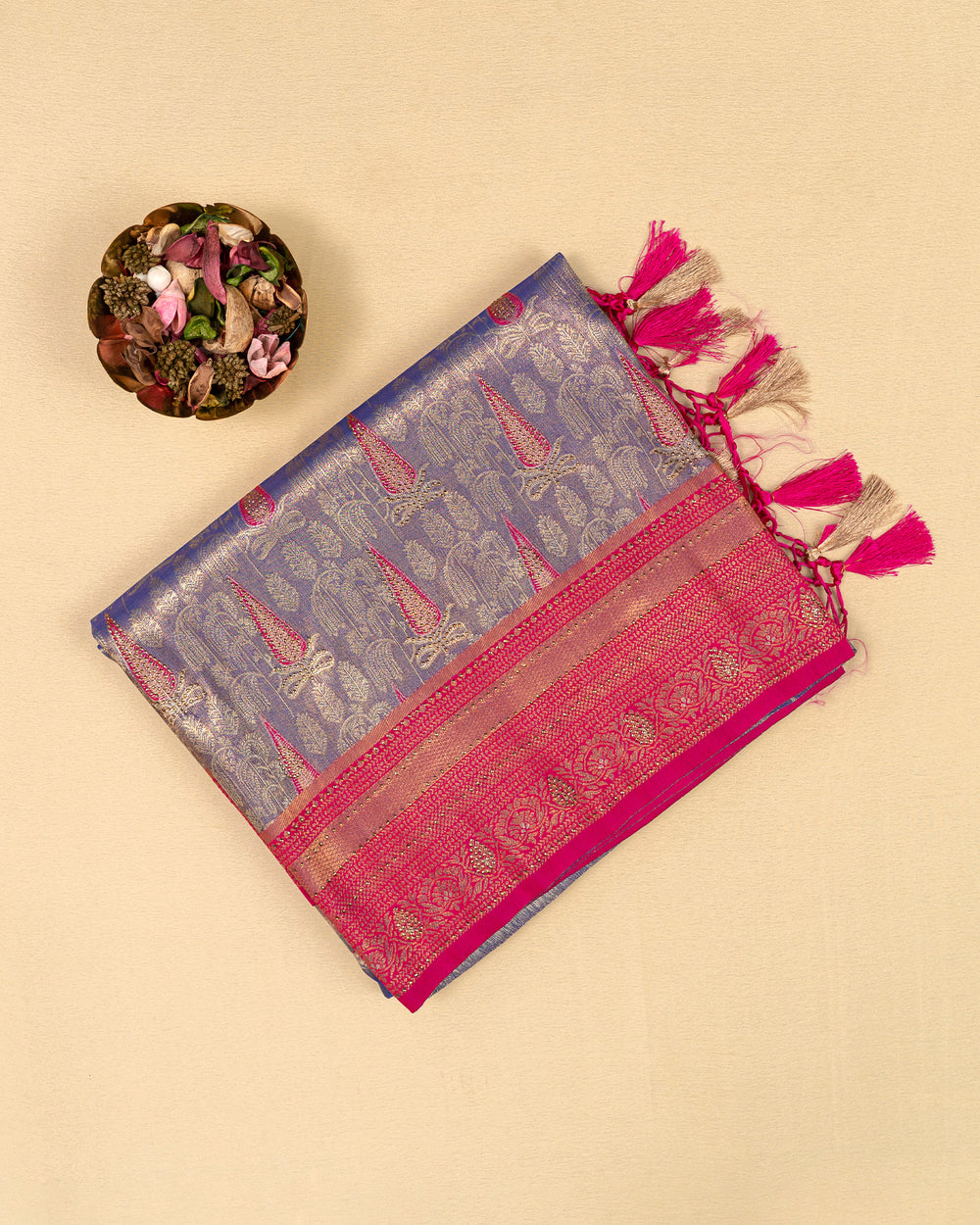 | Blouse | Running embossed blouse with gold border on hand, enhancing the luxurious appeal of the saree |