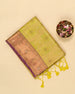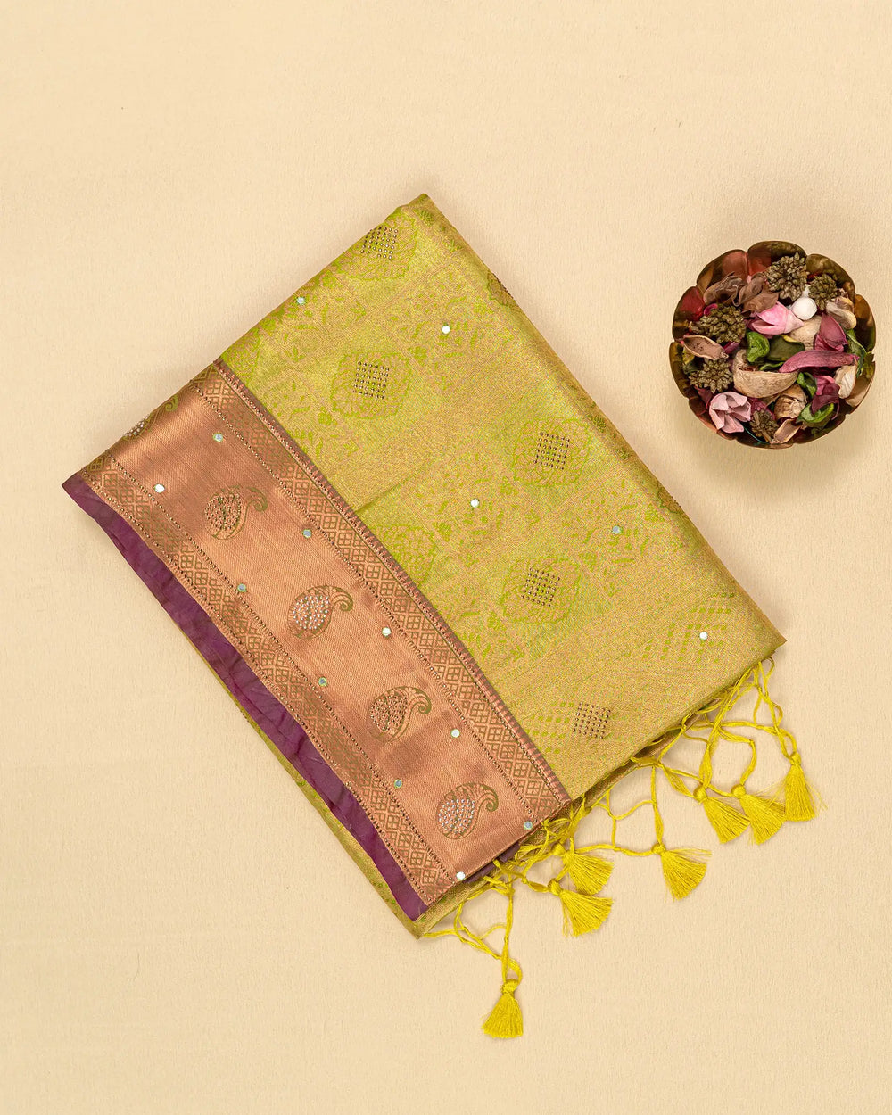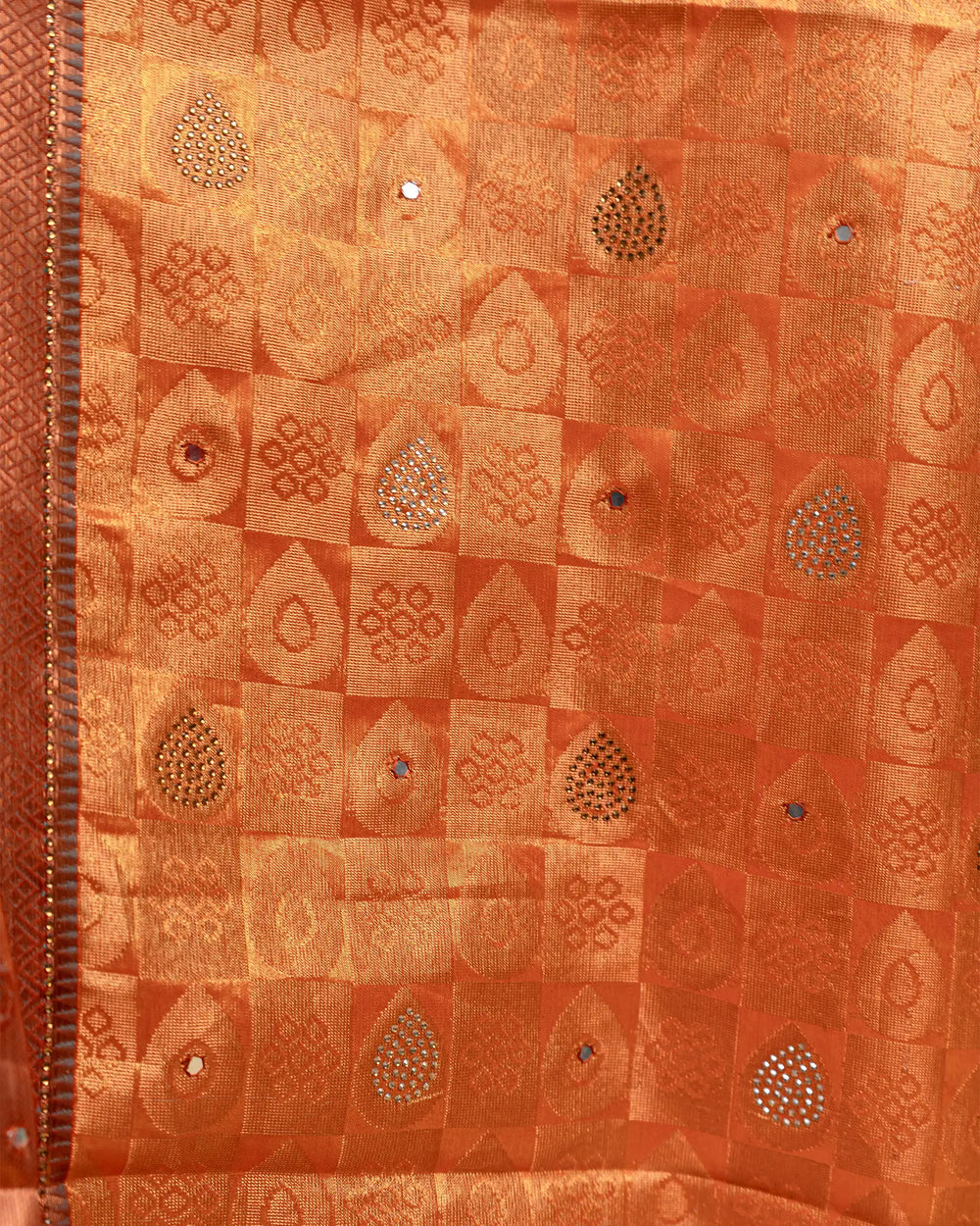 | Description | Tissue saree featuring mirror work and delicate stone embellishments, perfect for festive occasions and celebrations with a sparkling finish. |