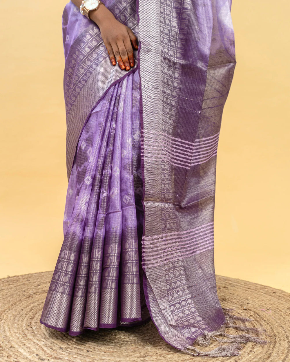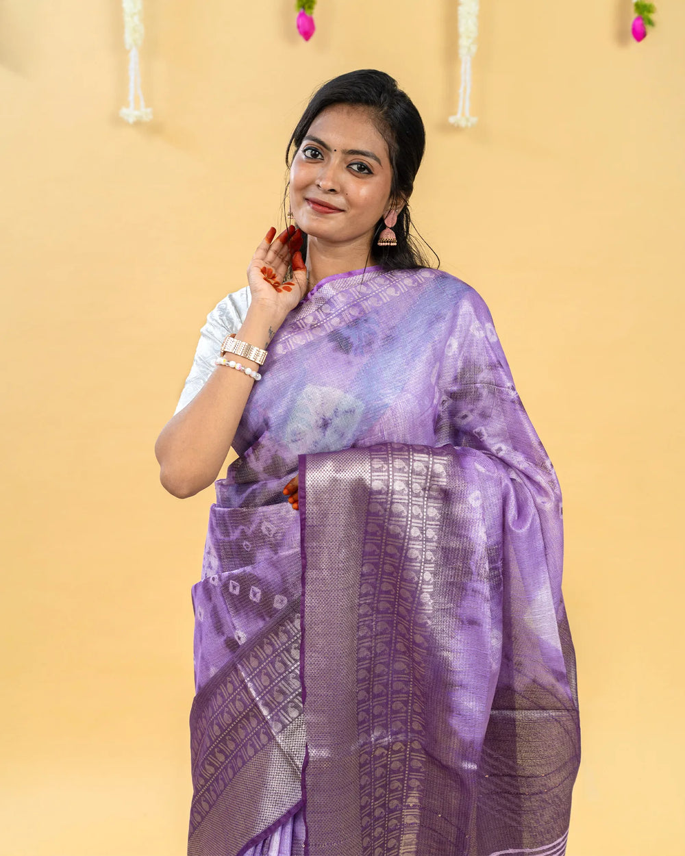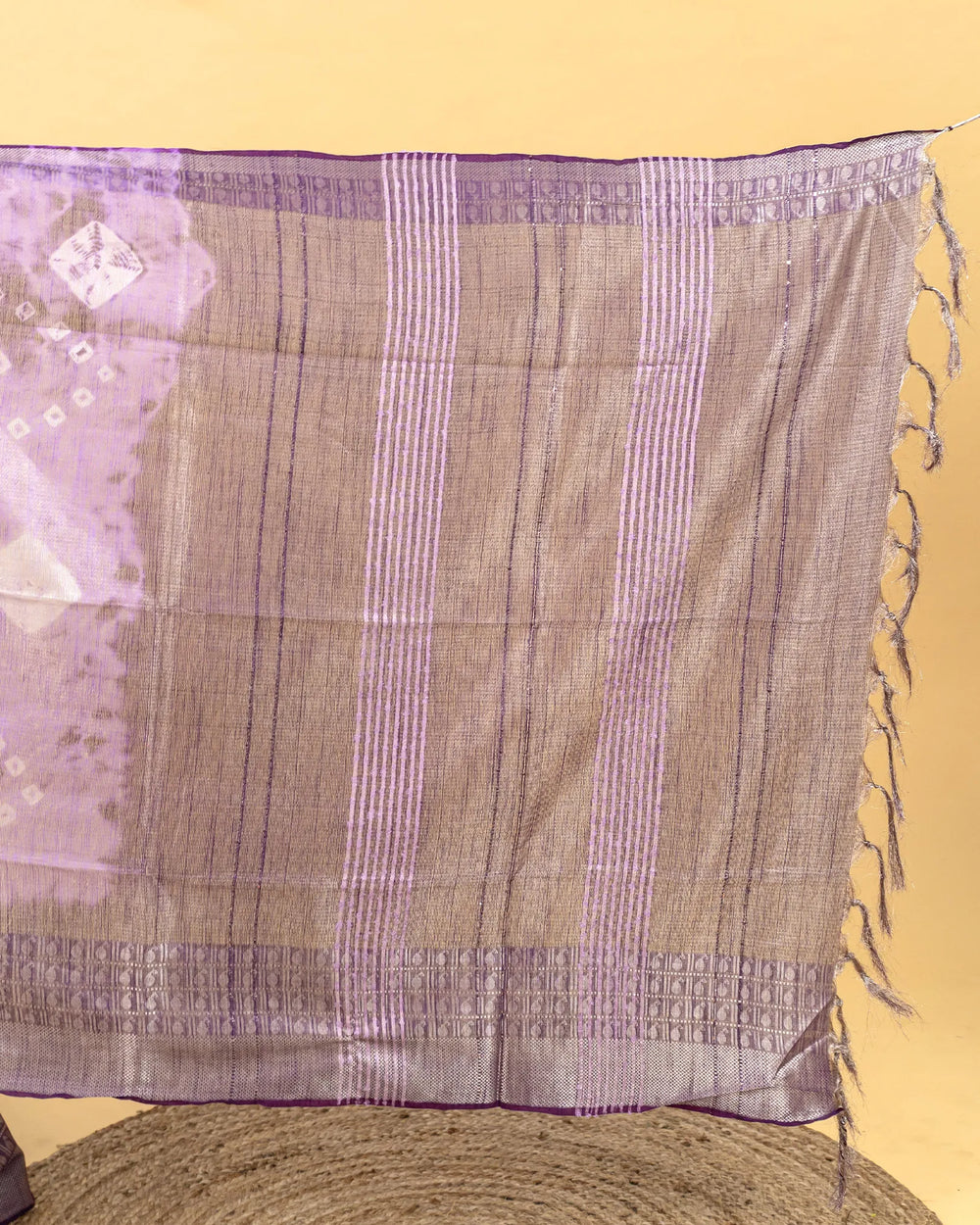 | Description | Exquisite tissue saree embellished with traditional Bandhini work, blending delicate patterns and soft sheen for a festive and graceful look. Ideal for weddings, festive gatherings, and special celebrations. |