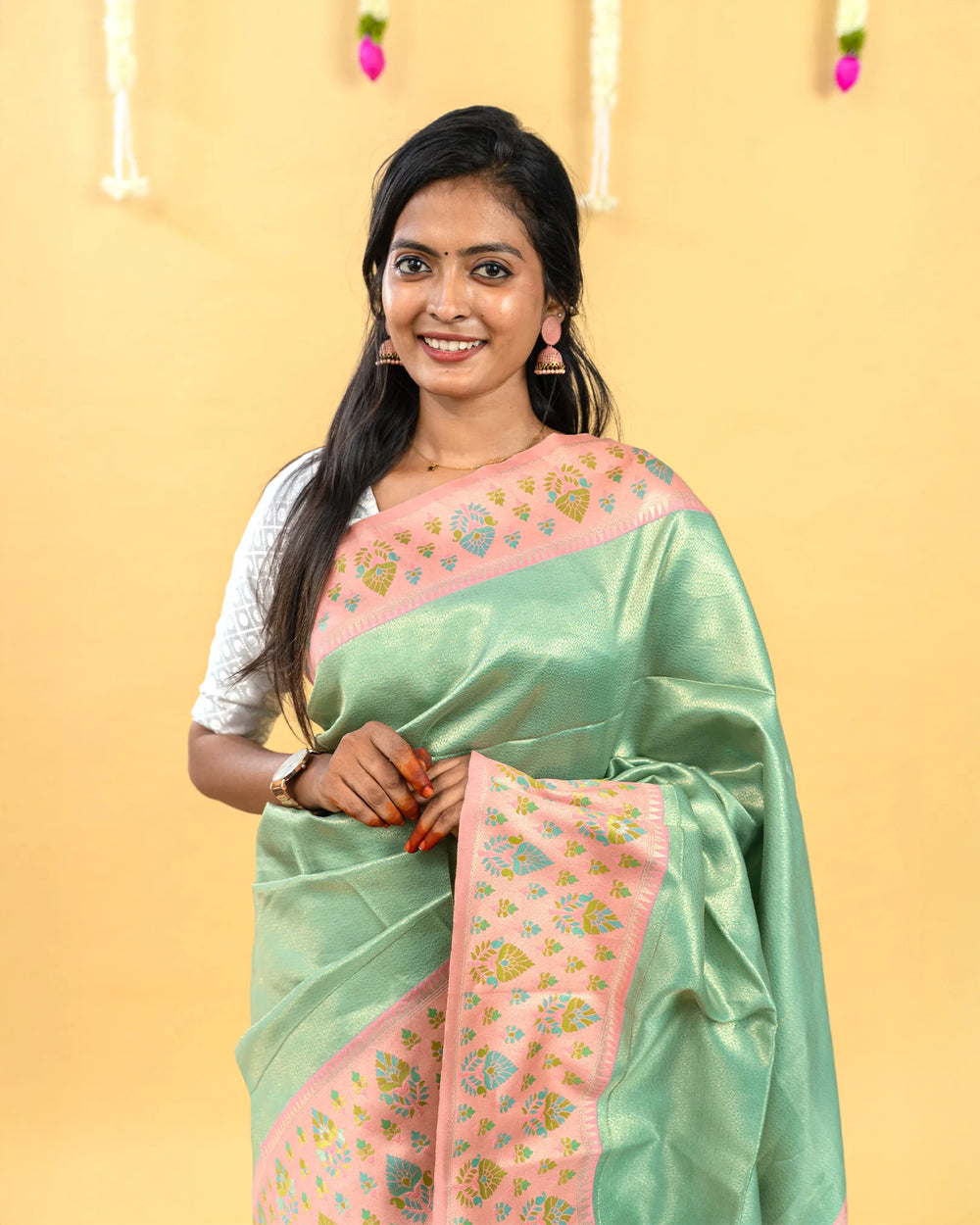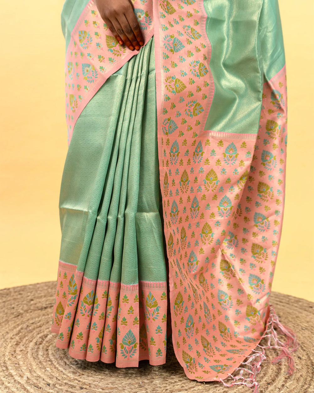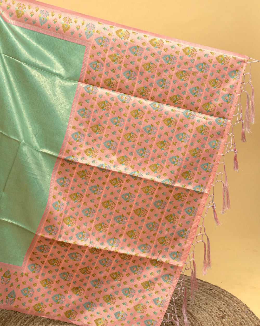 | Style | Intricately woven Meena border highlights the delicate tissue weave, creating a festive and sophisticated look |