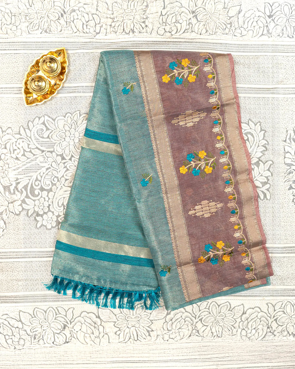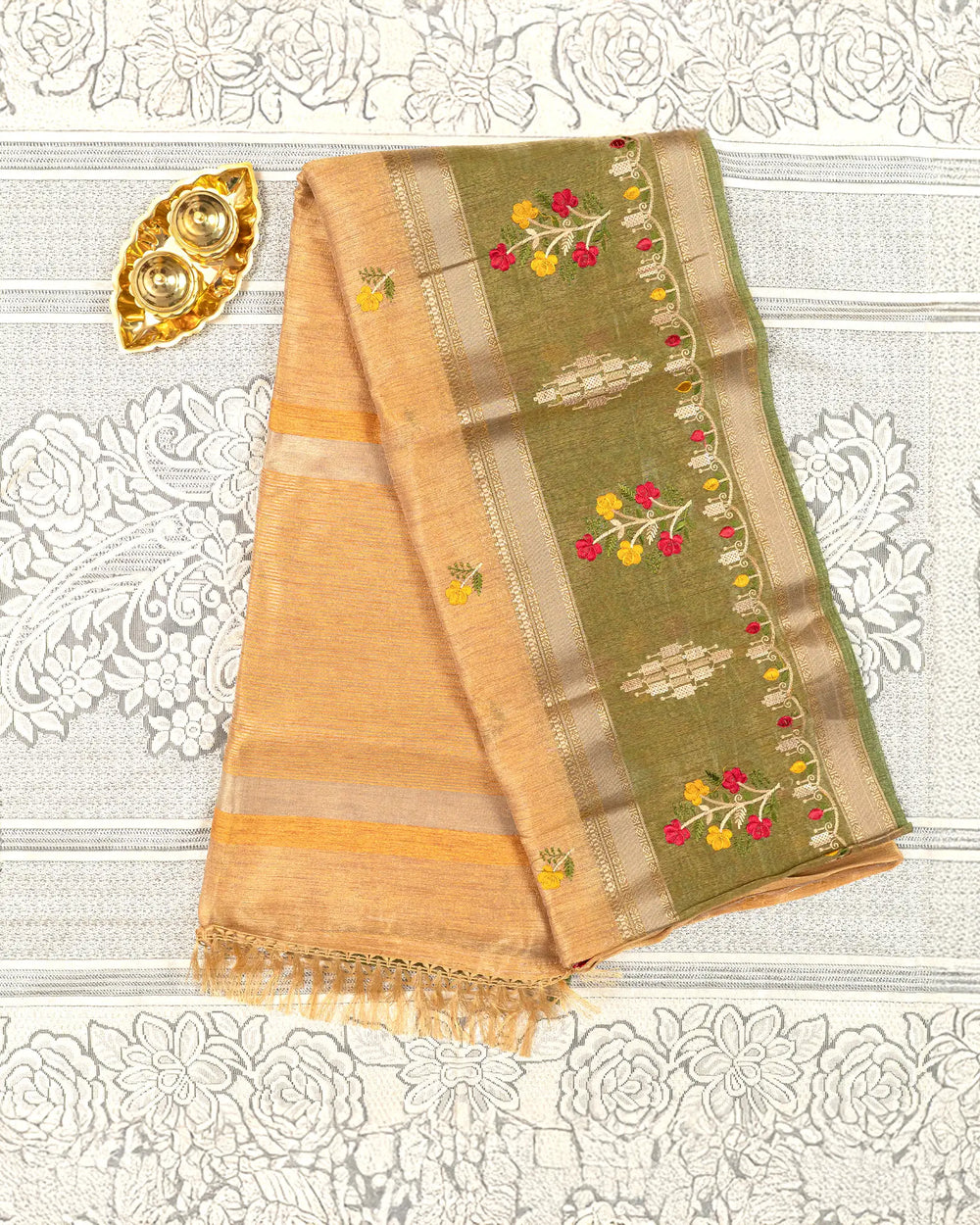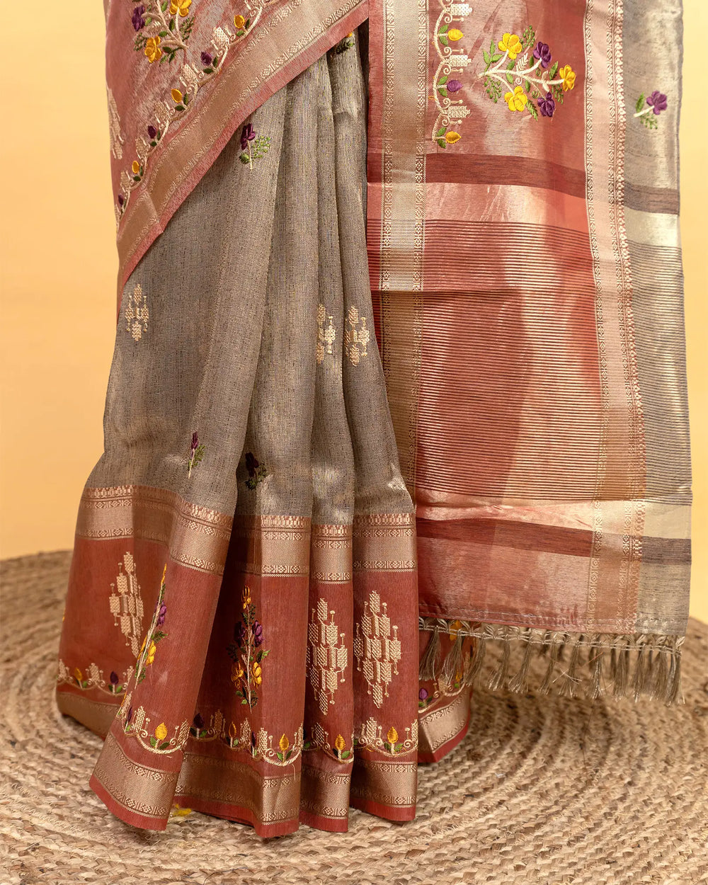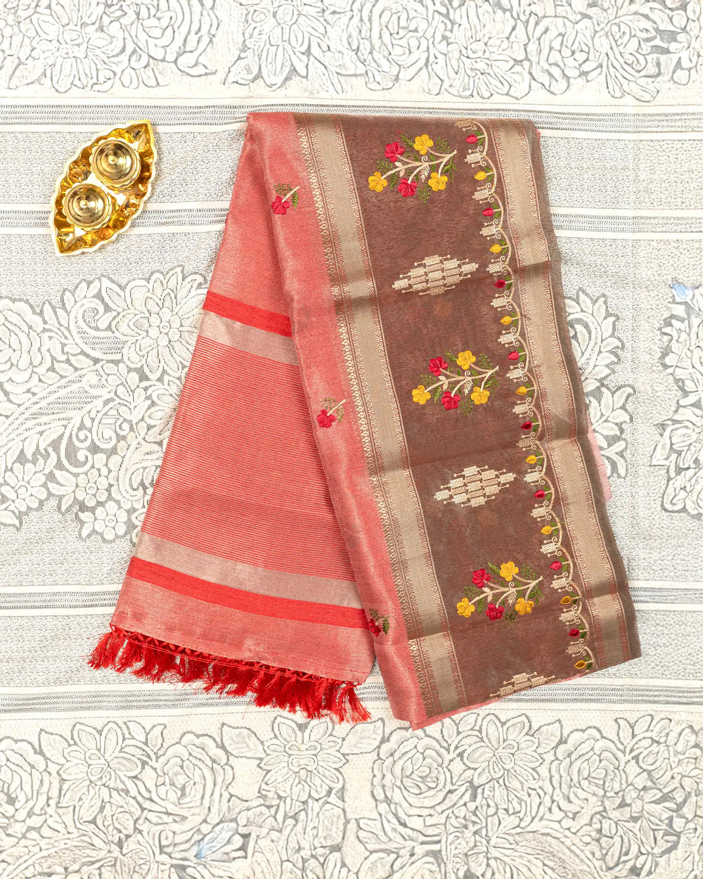| Fabric | Premium tissue fabric known for its soft sheen, lightweight texture, and graceful drape enhanced with detailed embroidery. |