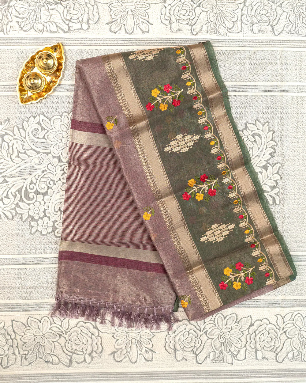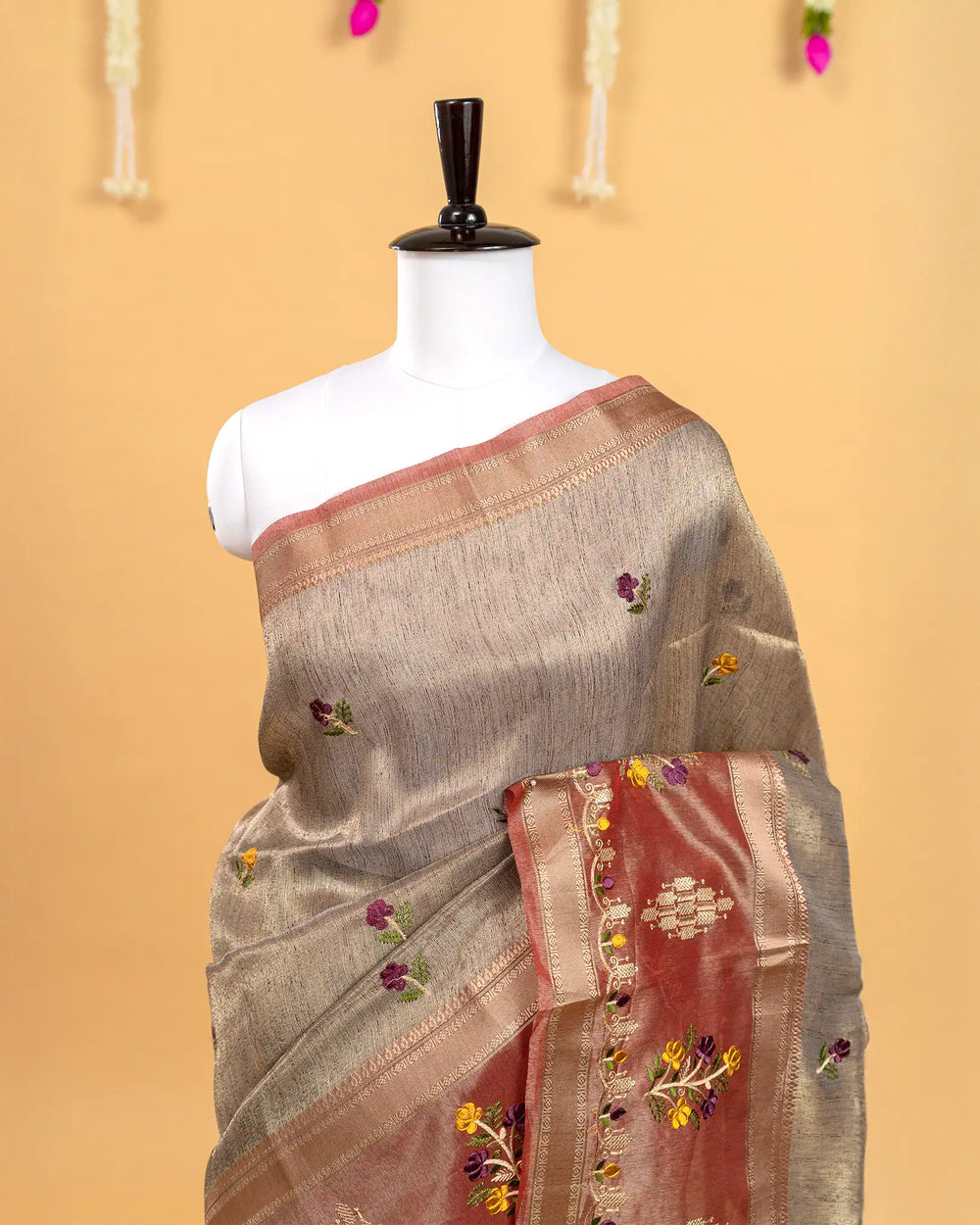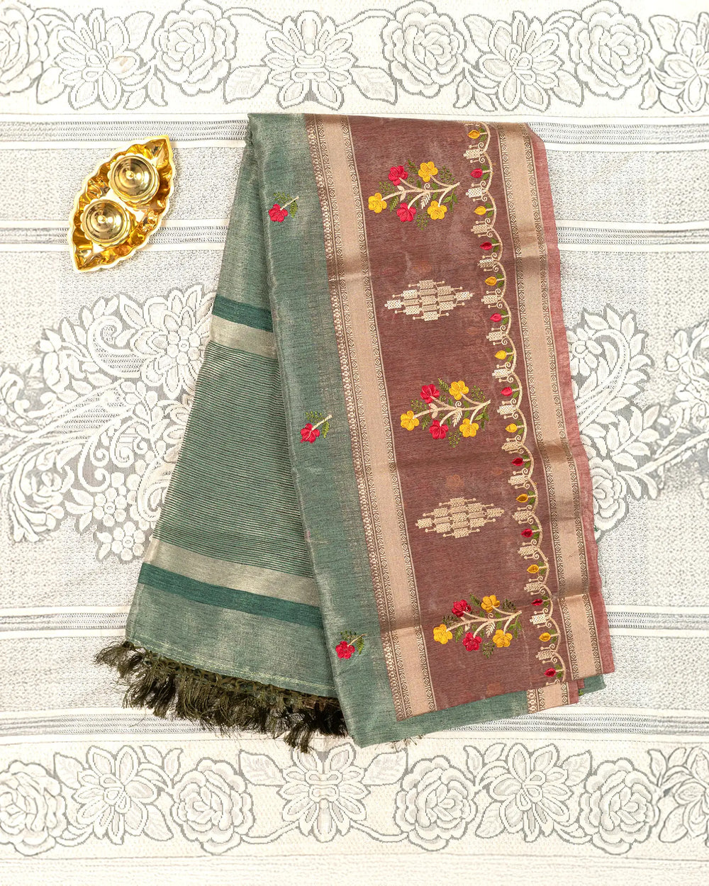 | Fabric | Premium tissue fabric known for its soft sheen, lightweight texture, and graceful drape enhanced with detailed embroidery. |