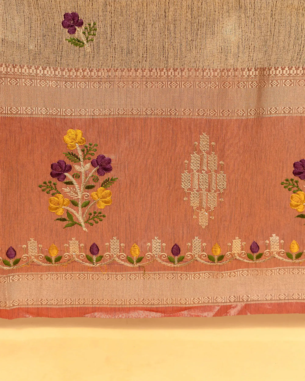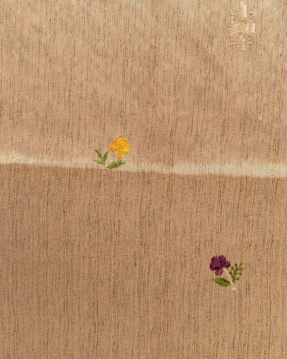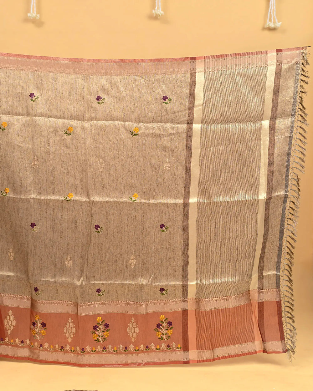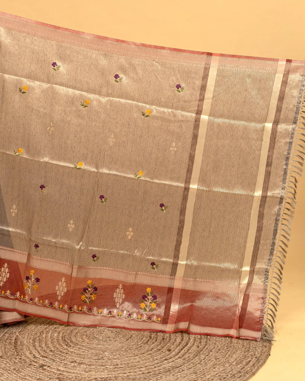 | Fabric | Premium tissue fabric known for its soft sheen, lightweight texture, and graceful drape enhanced with detailed embroidery. |