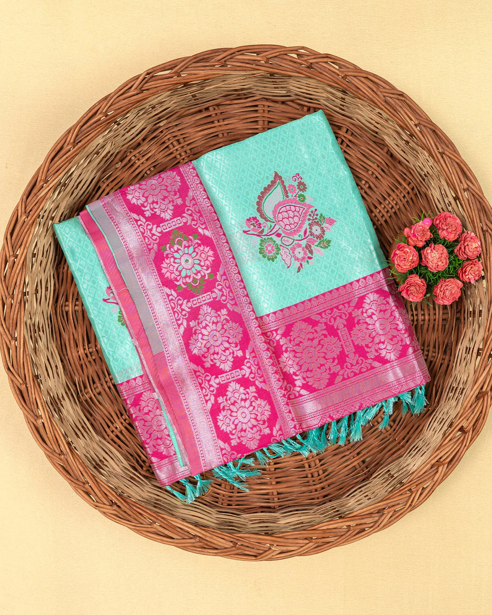 | Blouse | Running butta blouse designed to complement the saree’s silver zari meena butta, offering a seamless, elegant finish. |