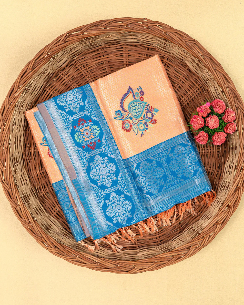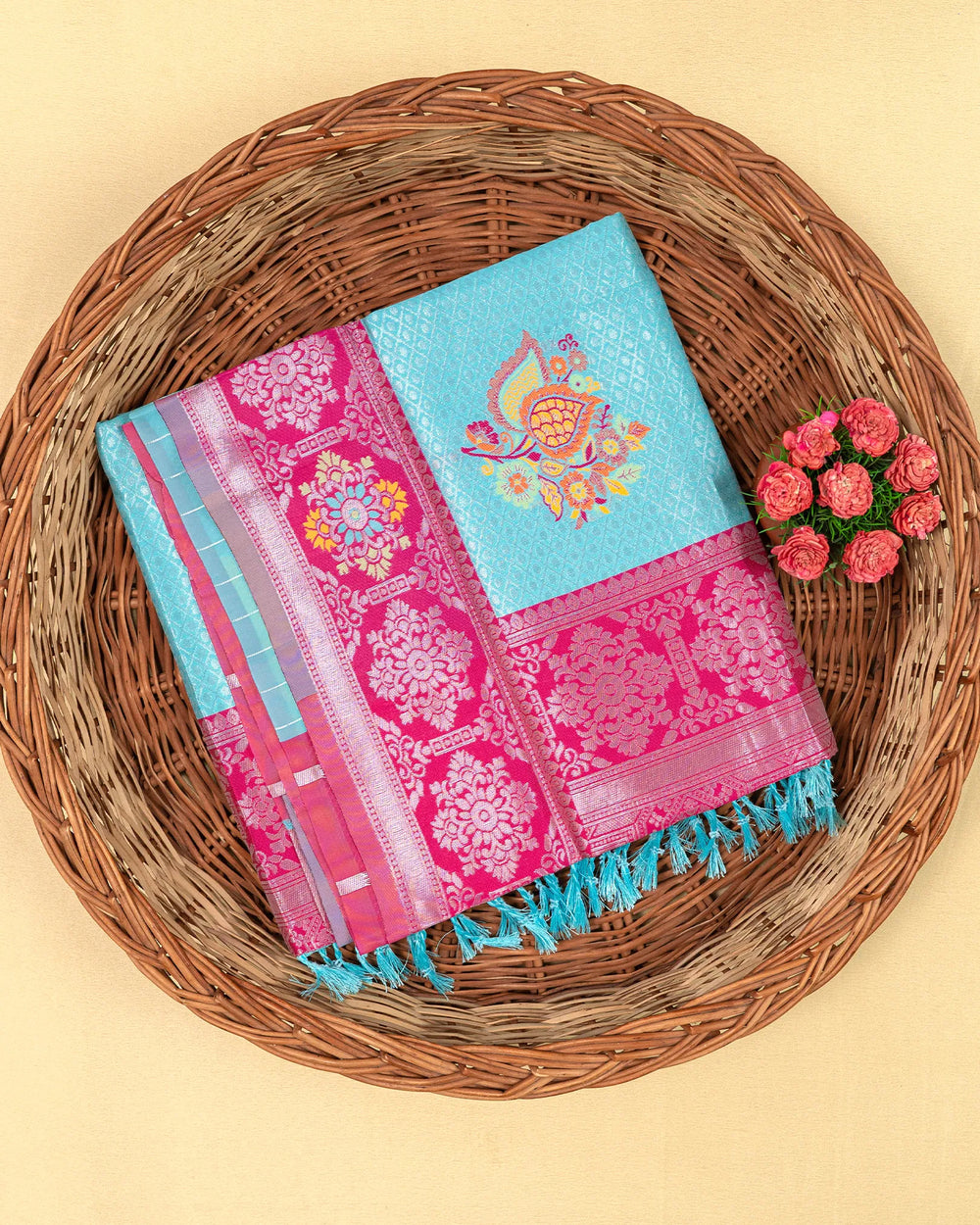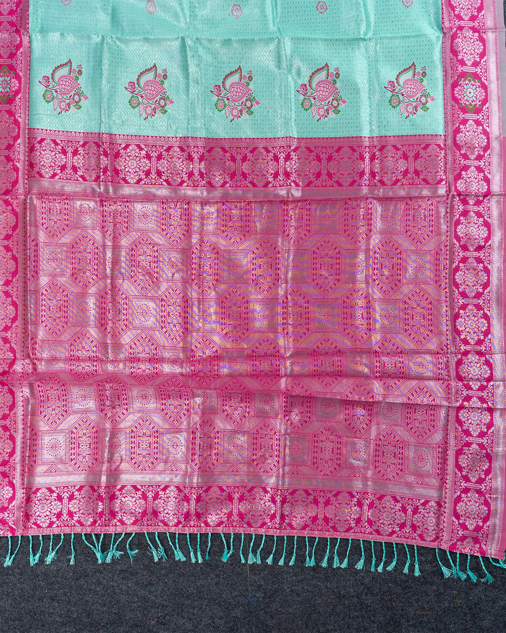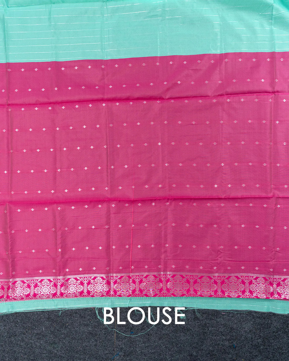 | Style | A traditional saree enhanced with silver zari meena butta, perfect for creating an elegant and polished appearance at weddings, parties, or any formal event. |