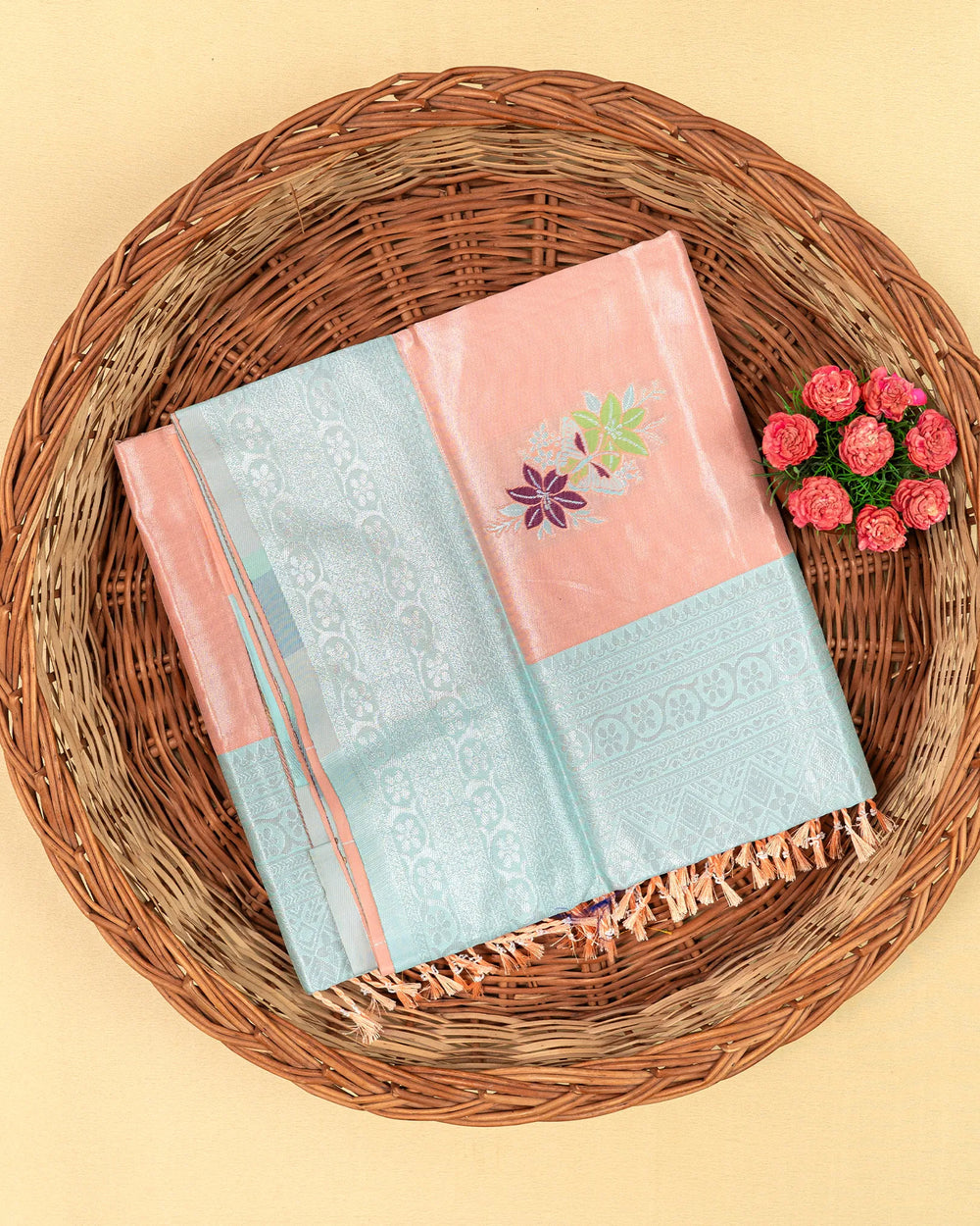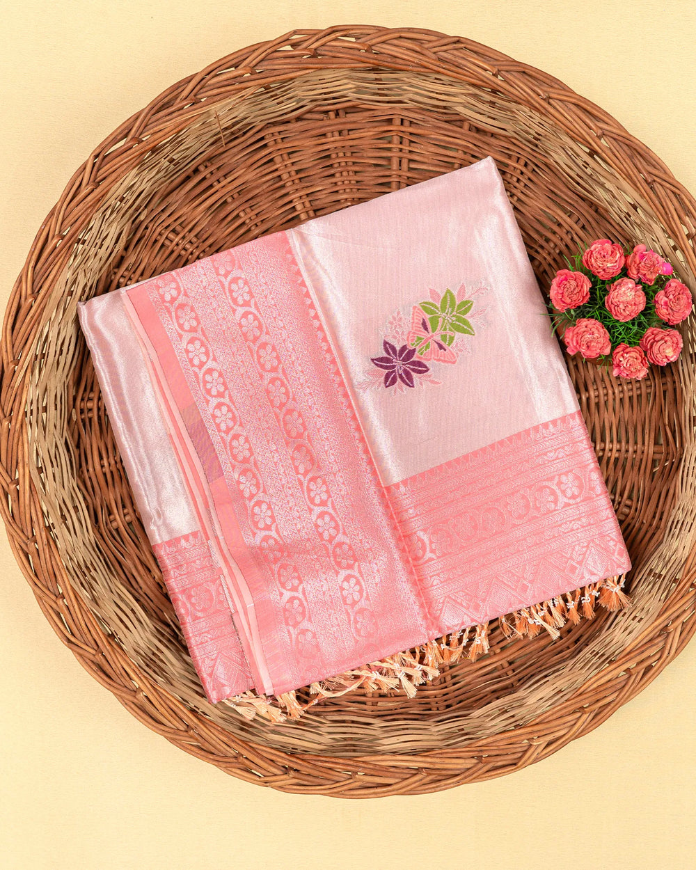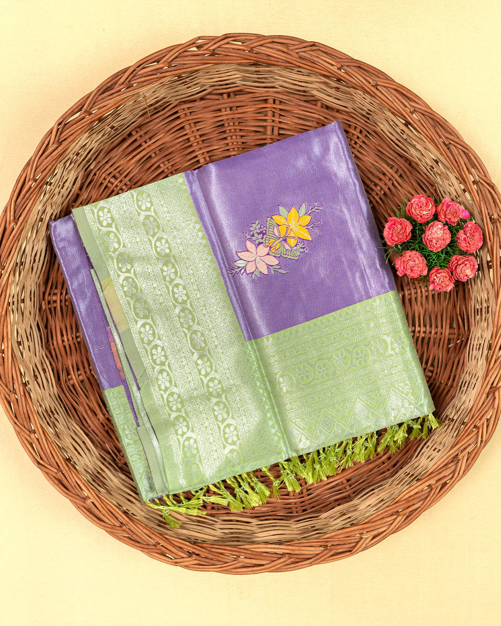 | Style | A traditional saree enhanced with silver zari meena butta, perfect for creating an elegant and polished appearance at weddings, parties, or any formal event. |