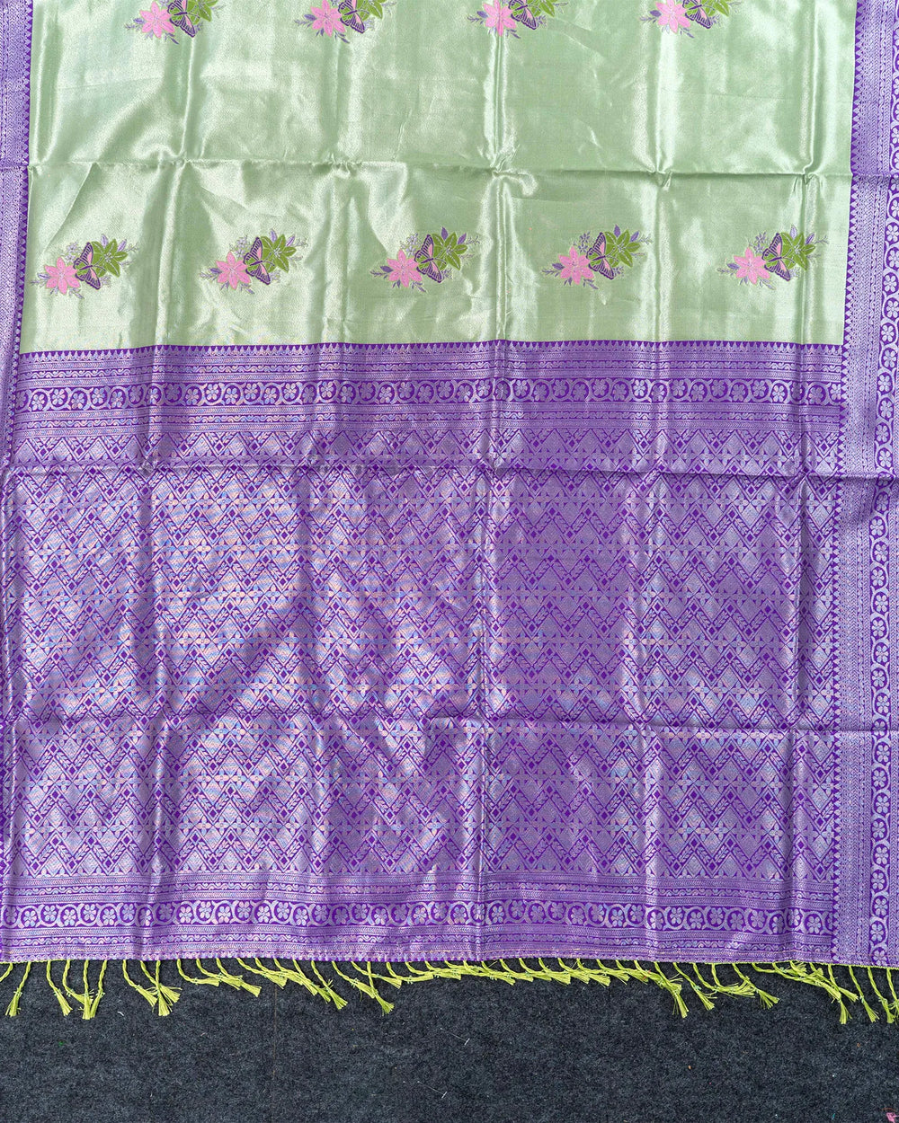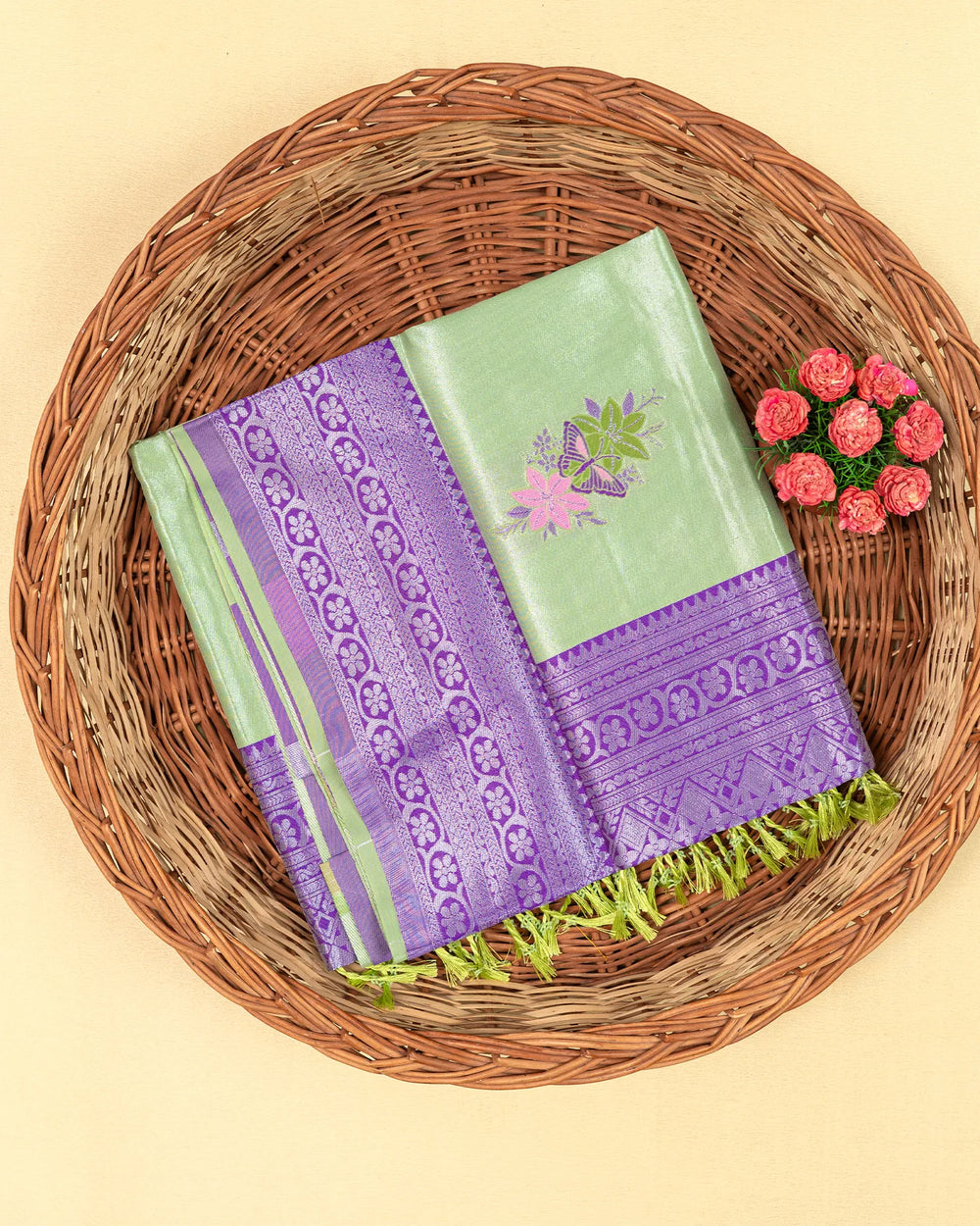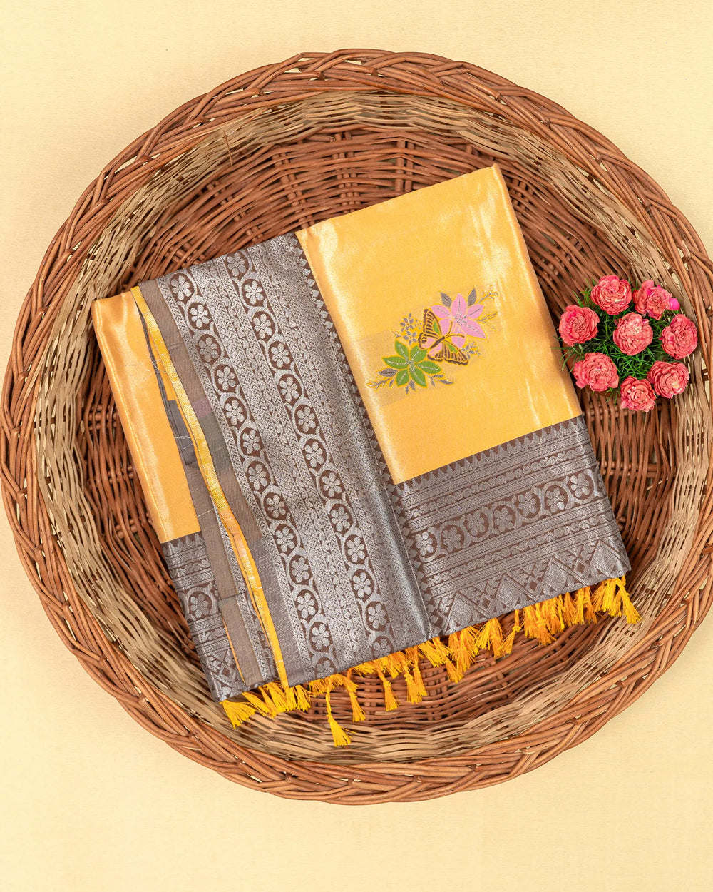 | Style | A traditional saree enhanced with silver zari meena butta, perfect for creating an elegant and polished appearance at weddings, parties, or any formal event. |