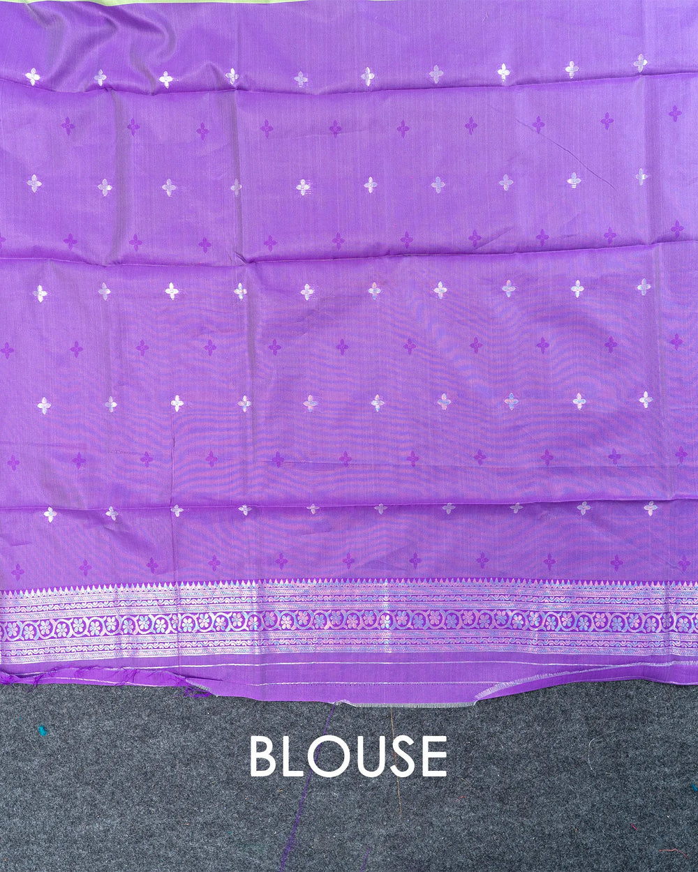 | Blouse | Running butta blouse designed to complement the saree’s silver zari meena butta, offering a seamless, elegant finish. |