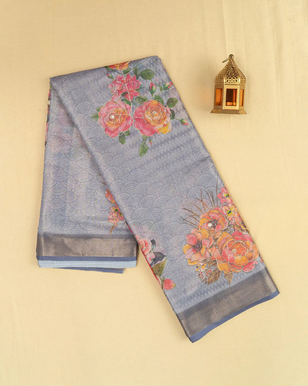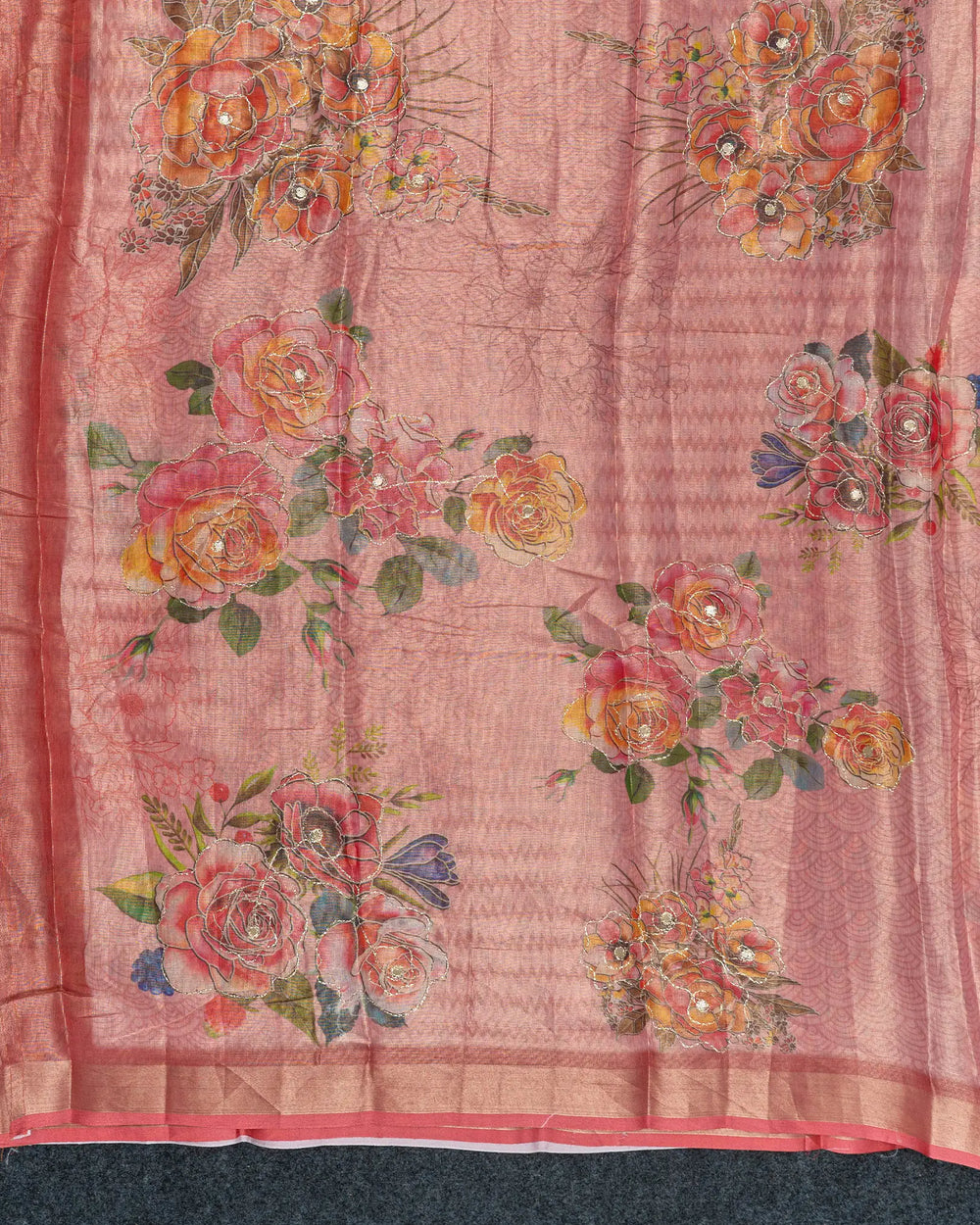 | Description | Exquisite tissue saree featuring vibrant digital prints complemented by elegant gold foil work, giving it a festive and luxurious appeal. |