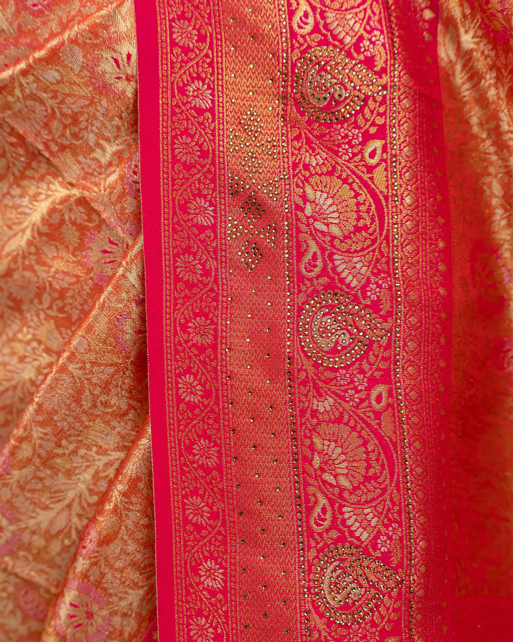 | Style | Saree accented with Jharkhand stones, complemented by contrast embossed blouse with hand zari and stone |