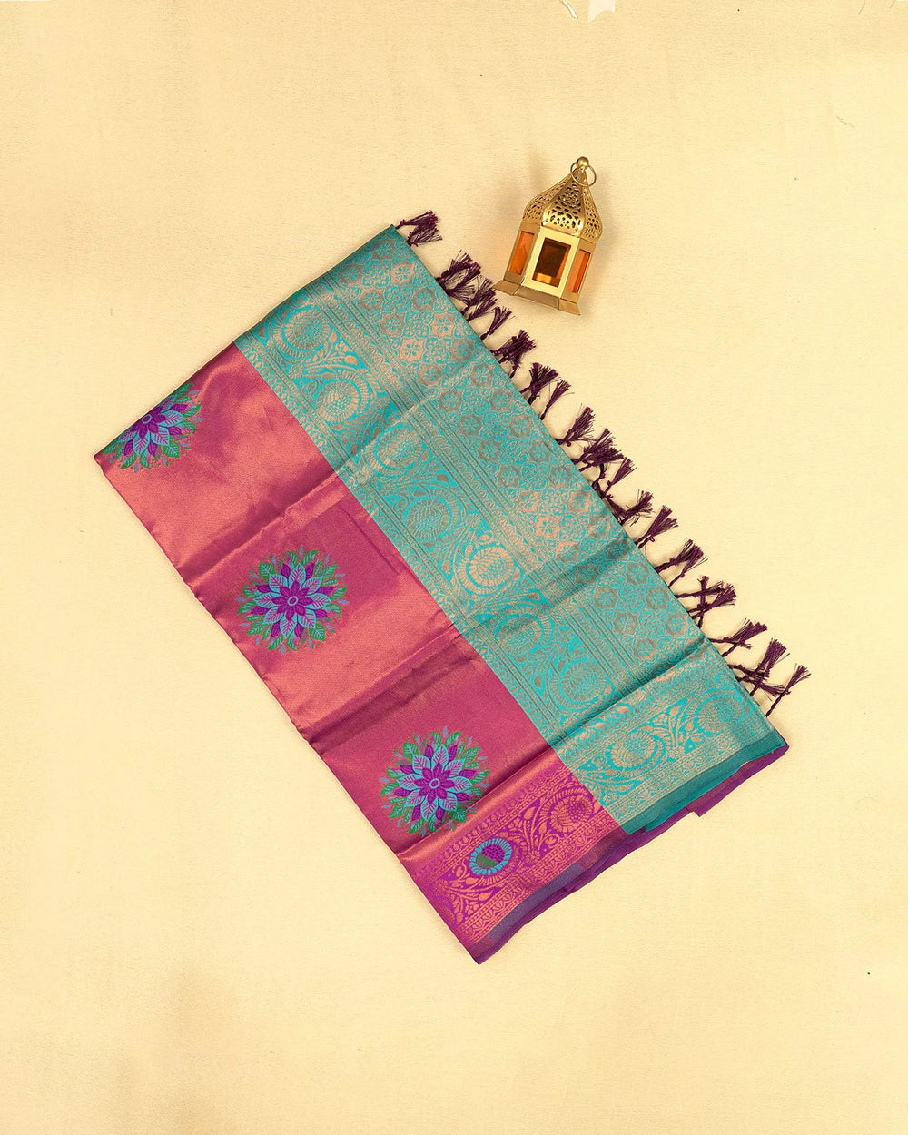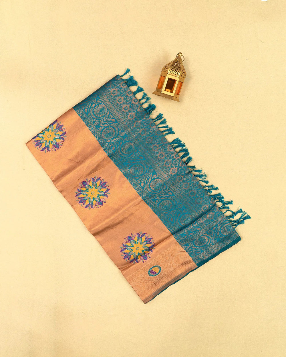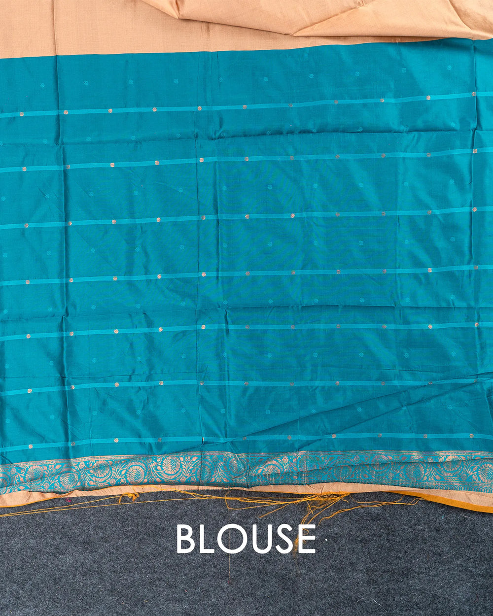 | Blouse | Running lines butta blouse that beautifully complements the saree’s meena body and copper border, adding a refined, elegant touch to the overall ensemble. |
