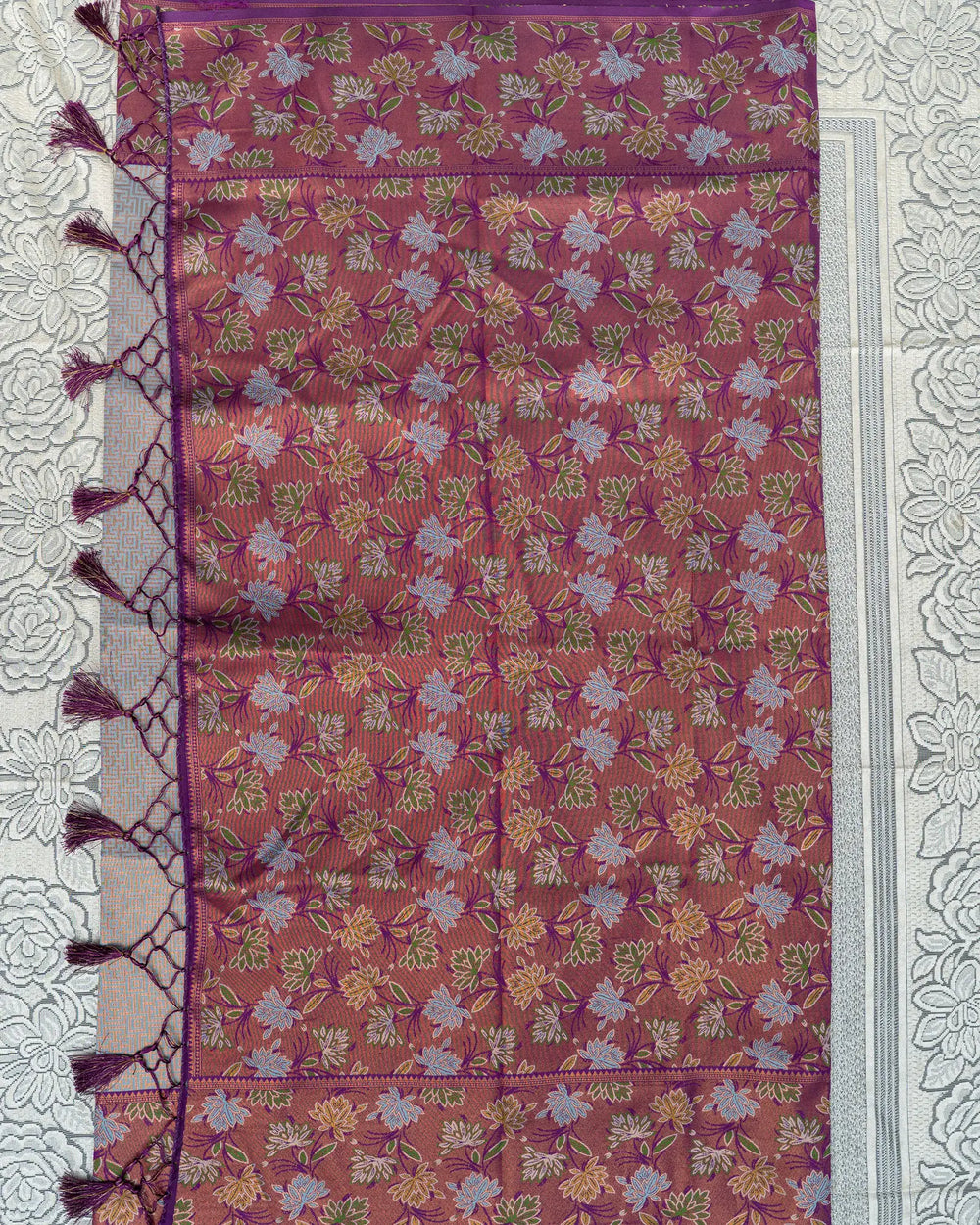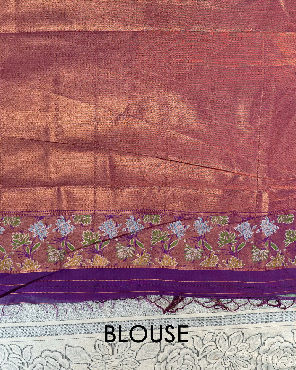 | Blouse | Tissue jarat blouse matching the saree with elegant detailing |