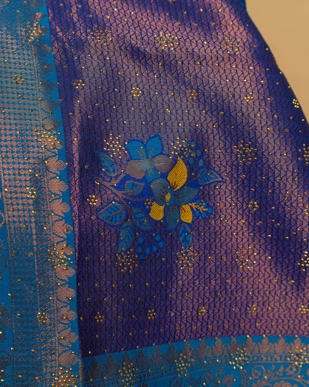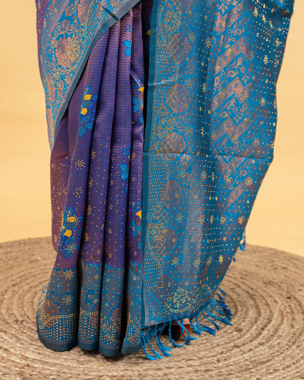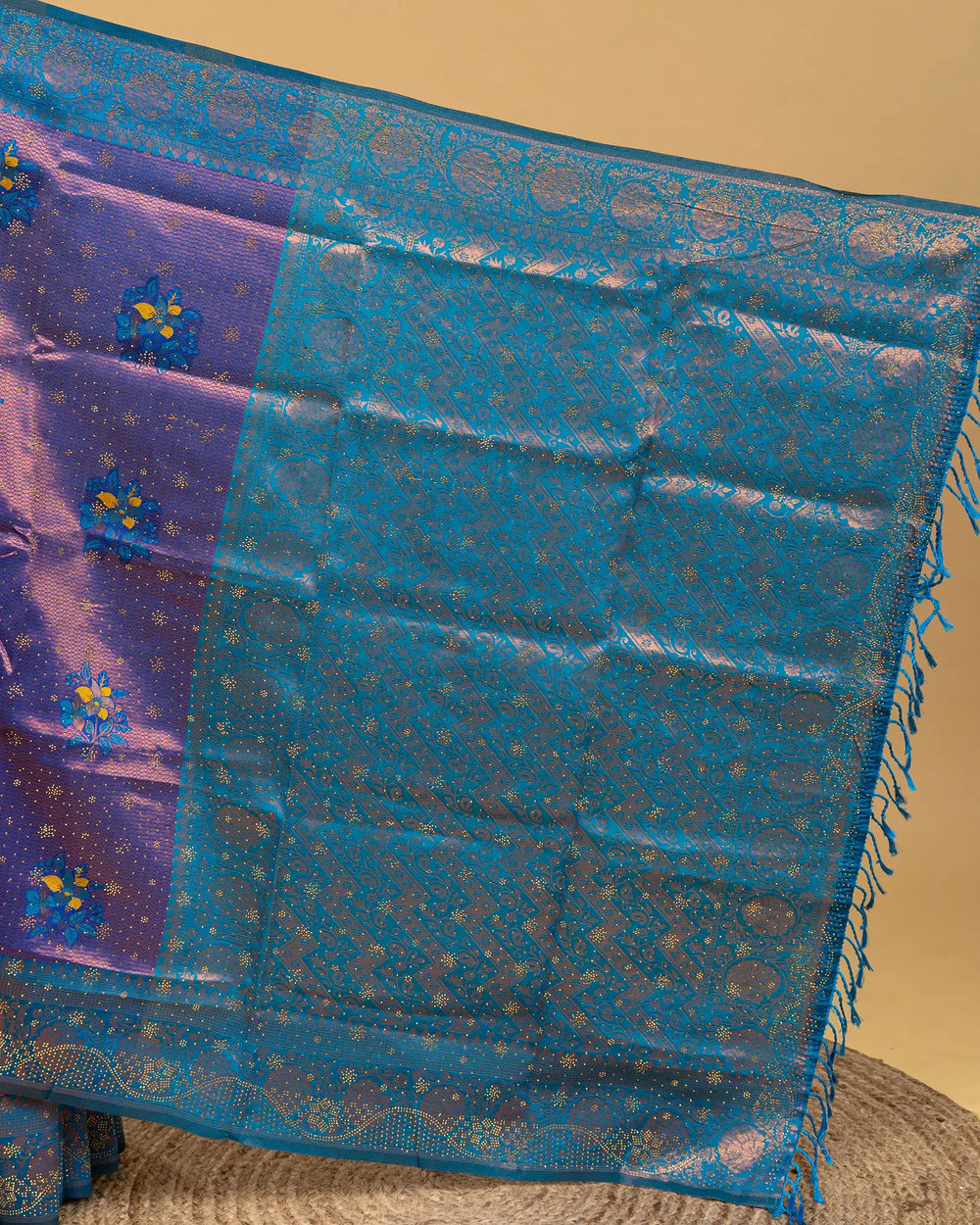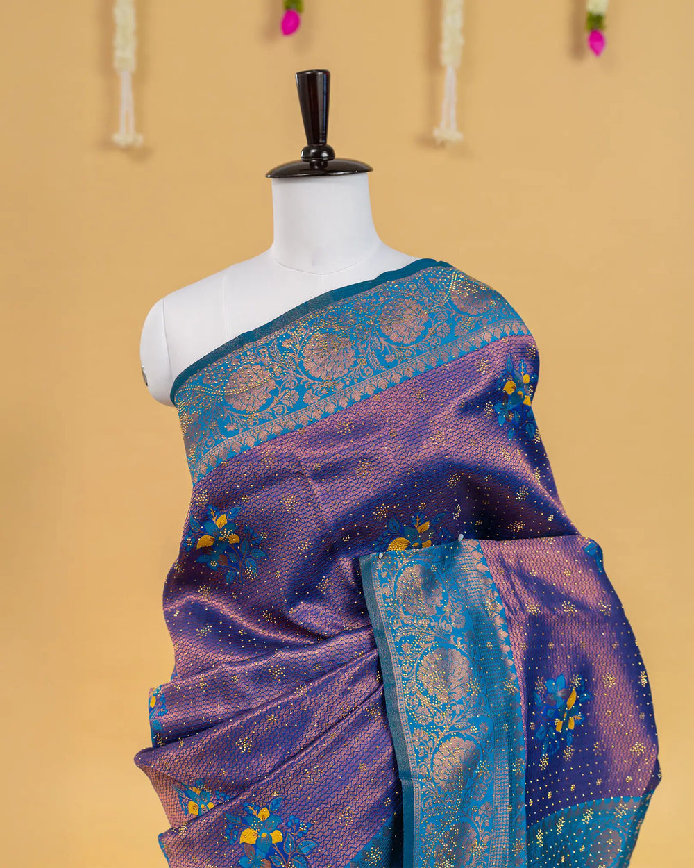 | Style | Saree embellished with sparkling stone work and Meena butta, complemented with contrast zari jacquard blouse |