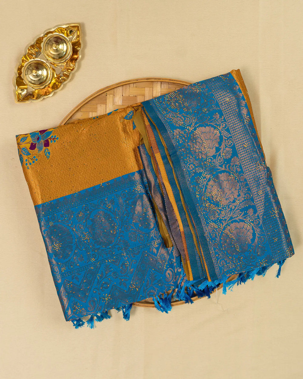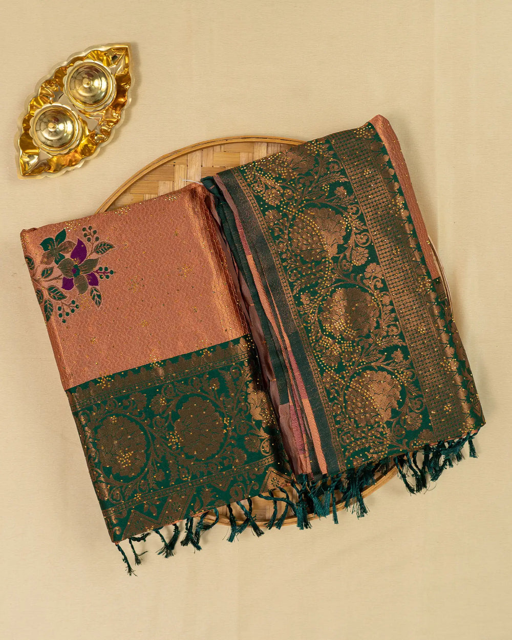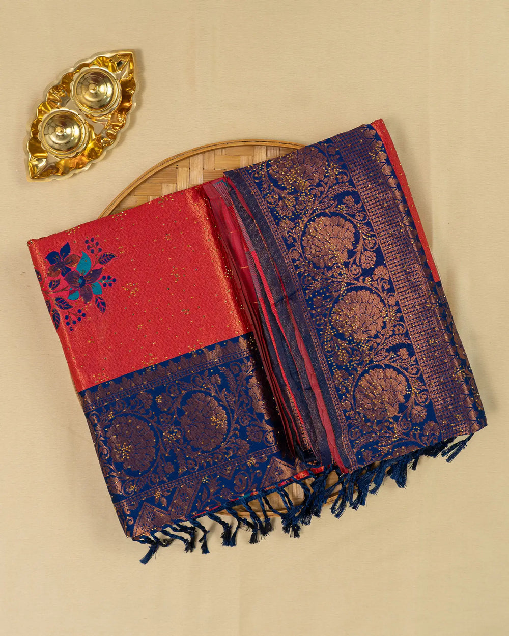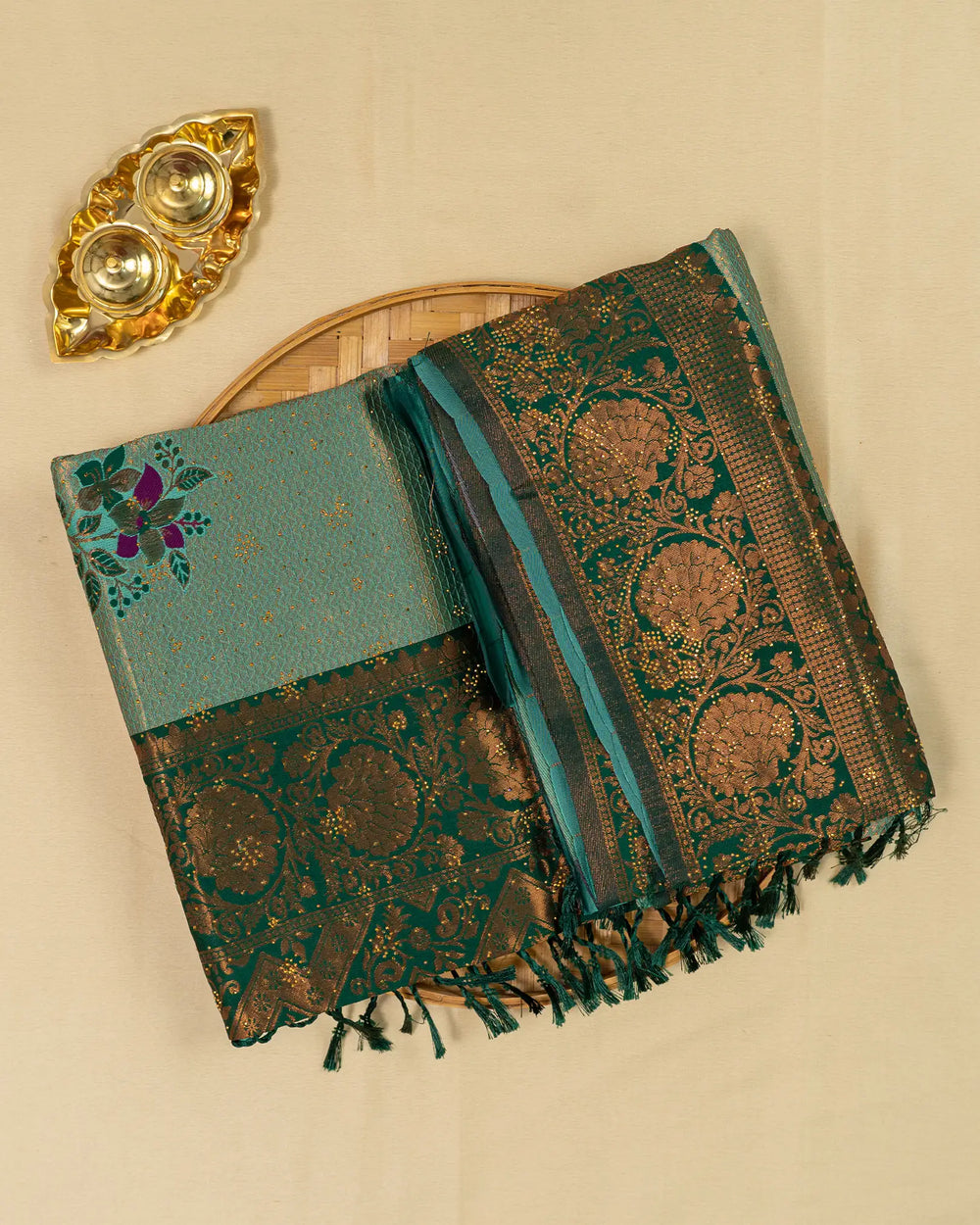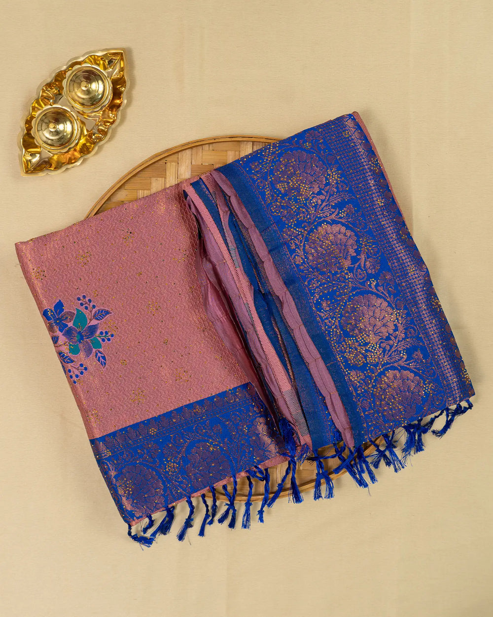 | Style | Saree embellished with sparkling stone work and Meena butta, complemented with contrast zari jacquard blouse |