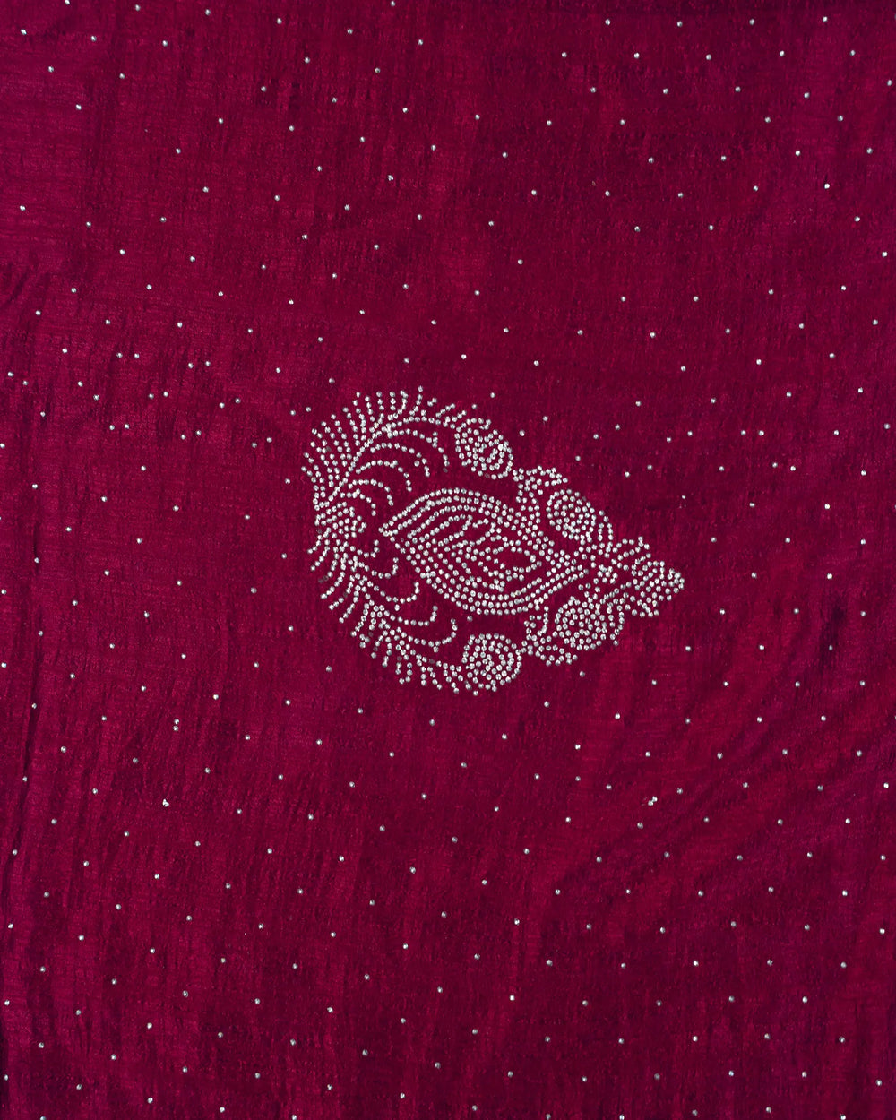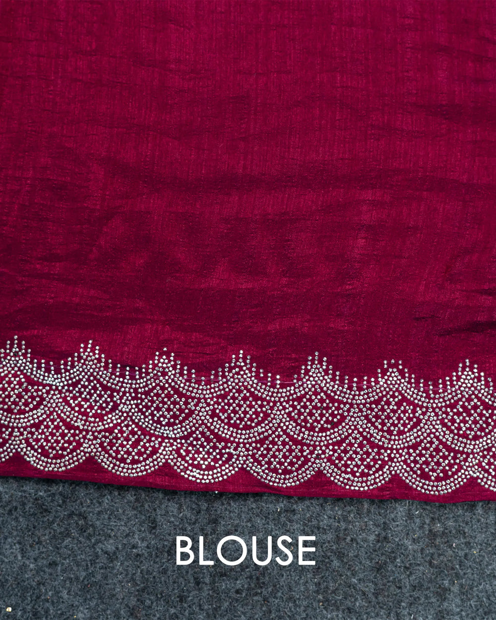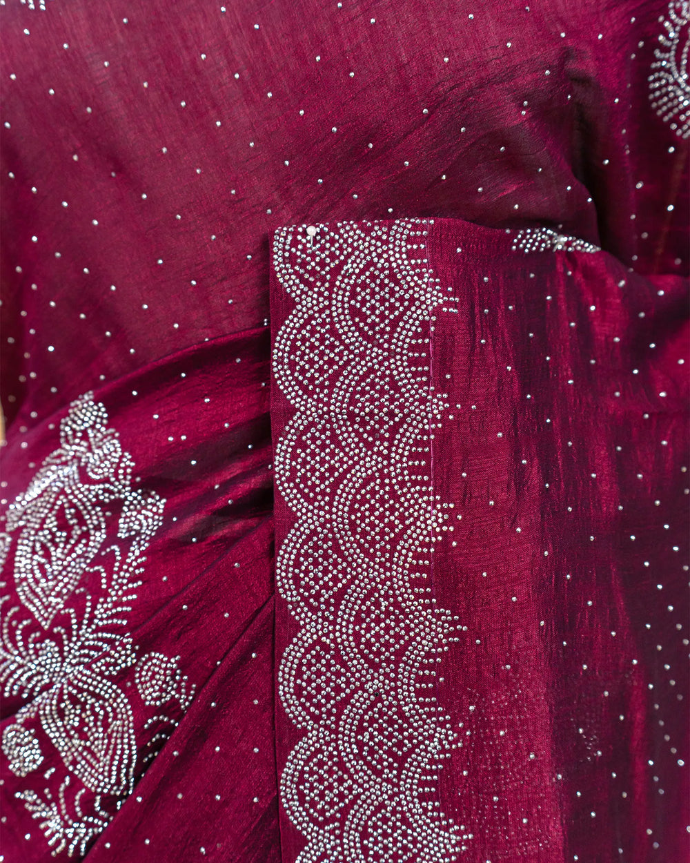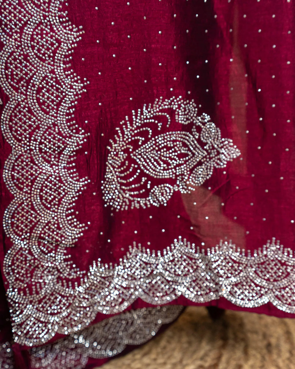 | Description | Graceful Vichitra saree adorned with delicate silver stone embellishments that add a subtle sparkle to the elegant drape. Perfect for weddings, receptions, and festive occasions where refined style is desired. |