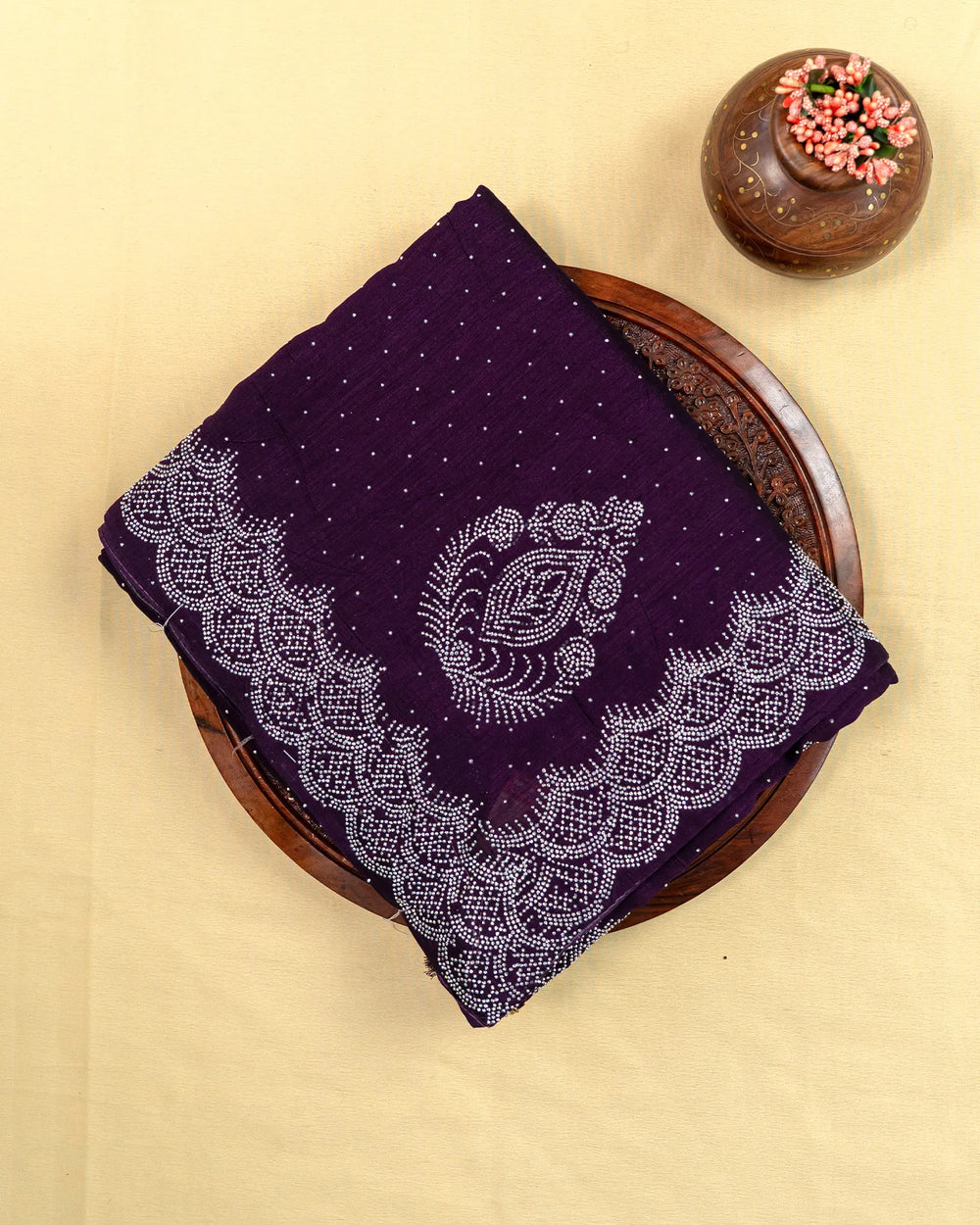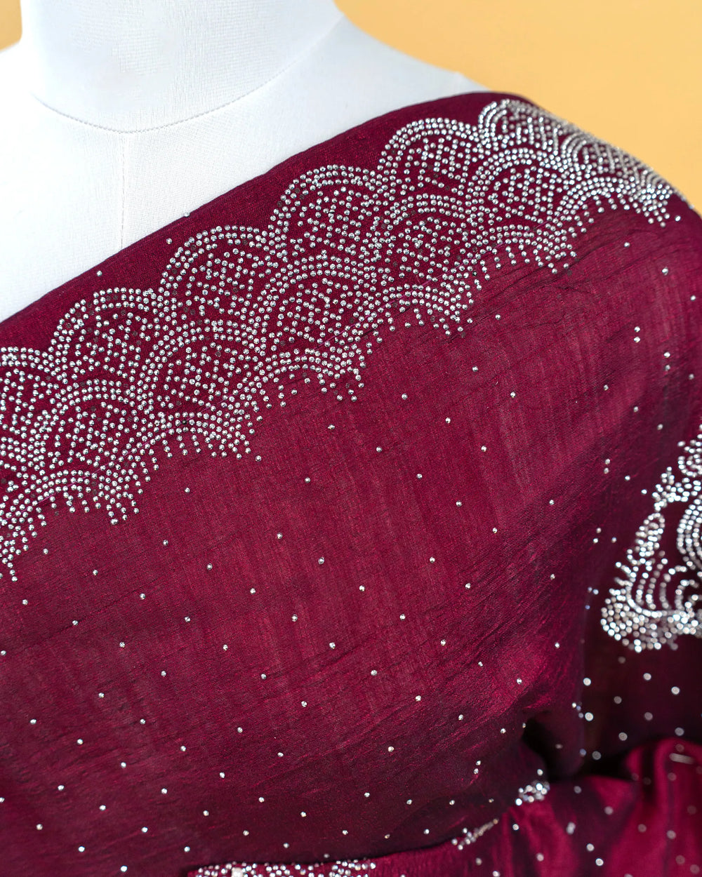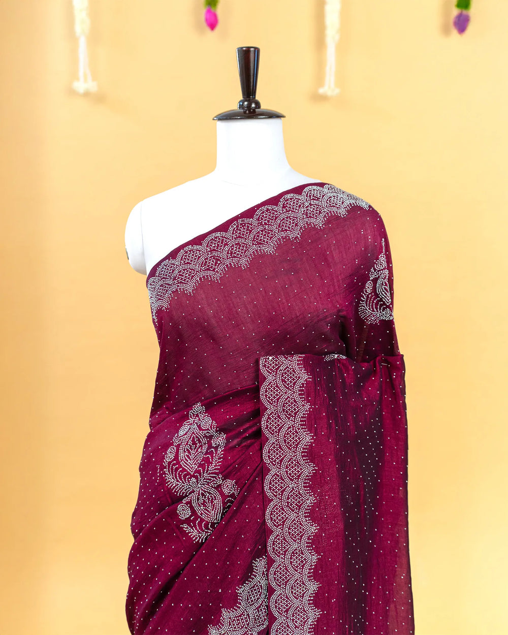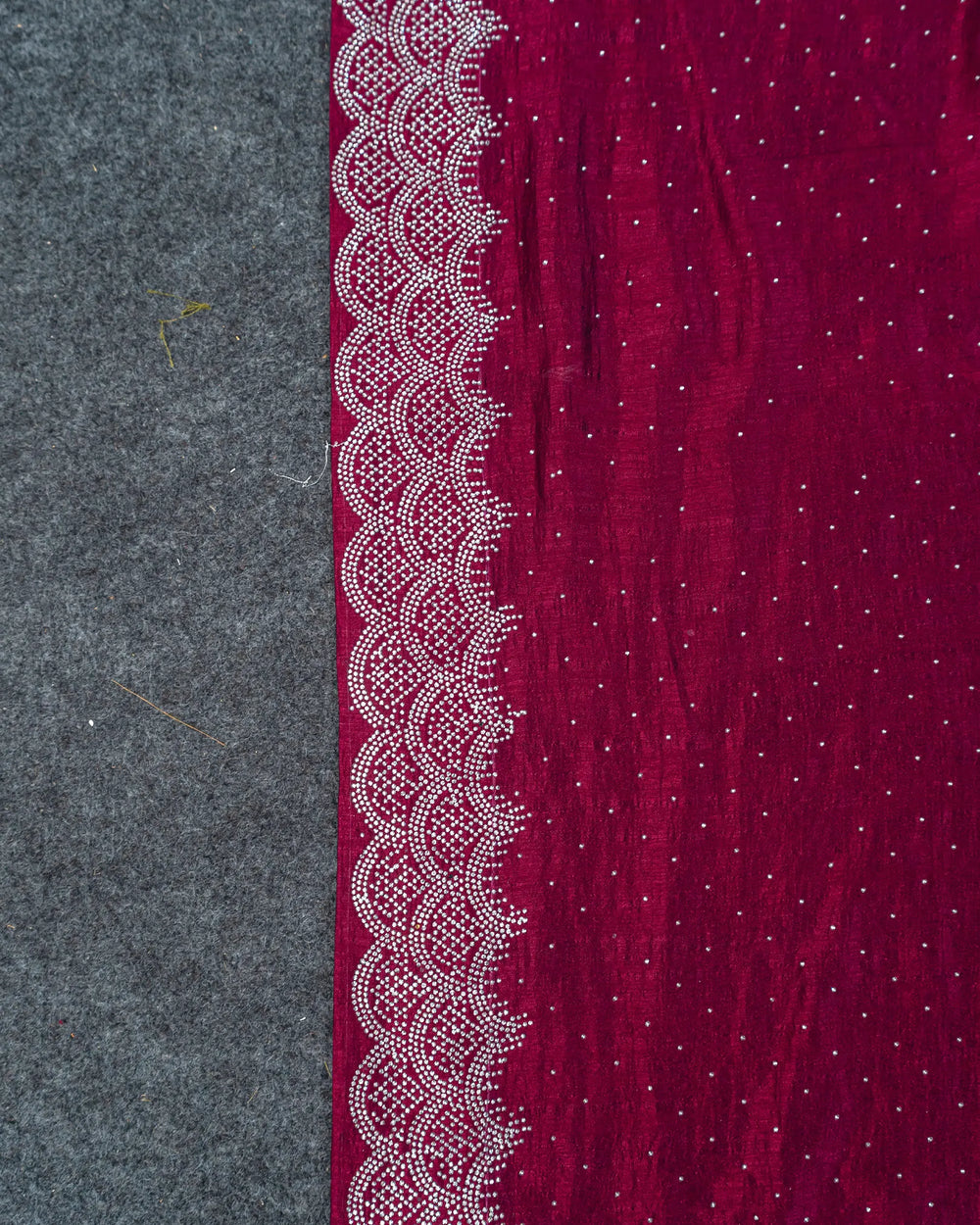 | Description | Graceful Vichitra saree adorned with delicate silver stone embellishments that add a subtle sparkle to the elegant drape. Perfect for weddings, receptions, and festive occasions where refined style is desired. |