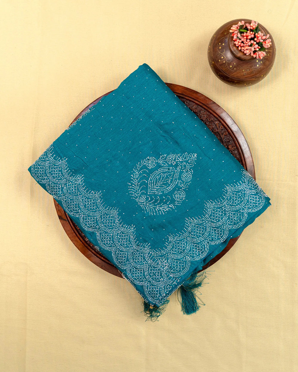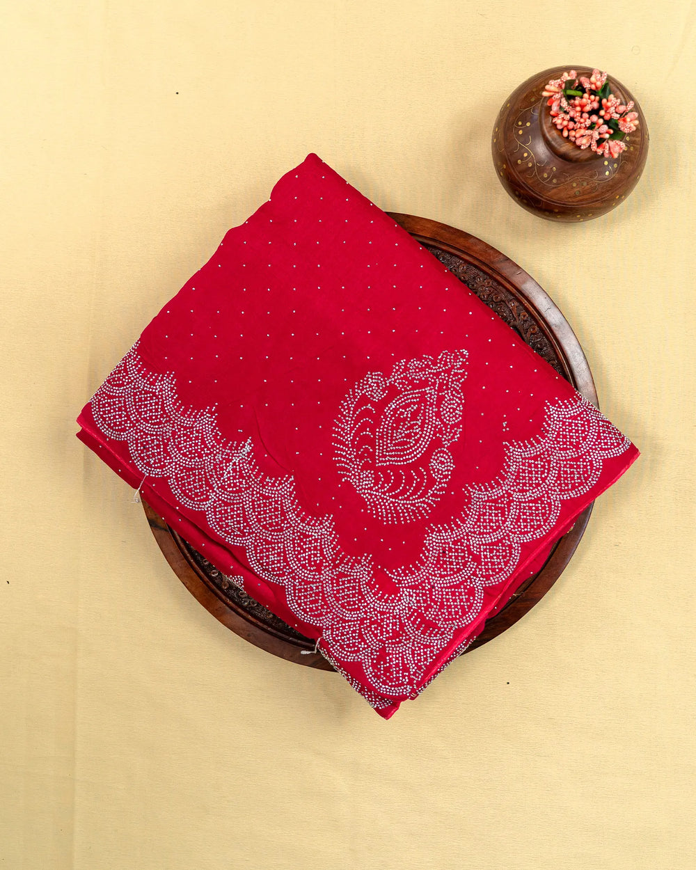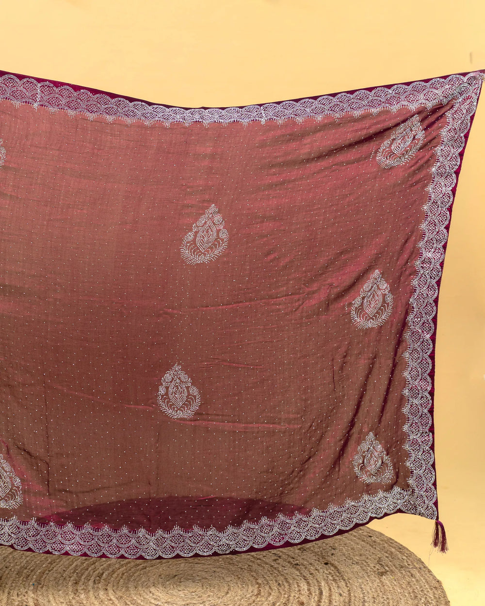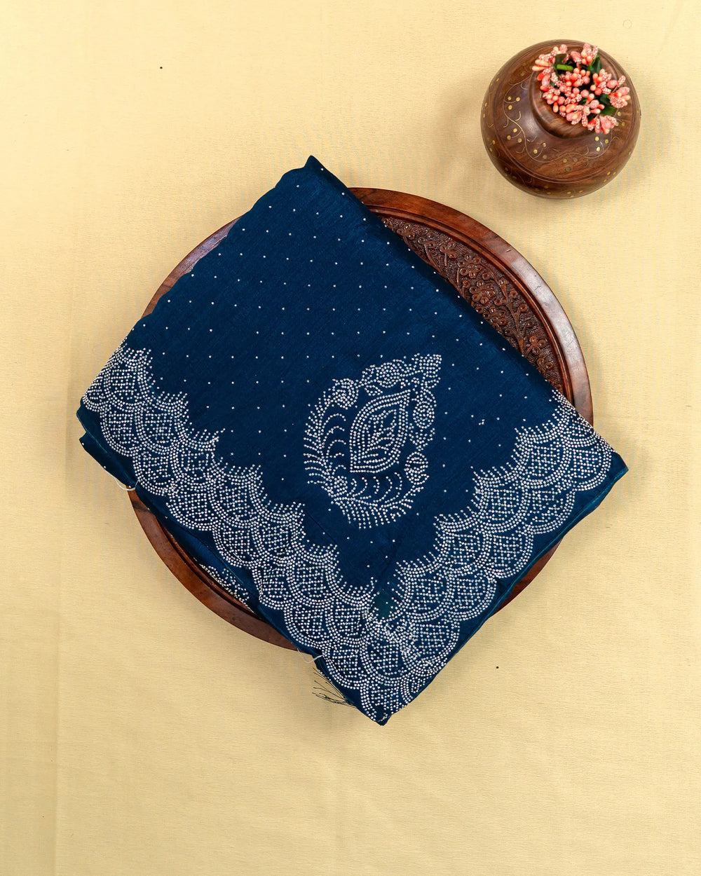 | Description | Graceful Vichitra saree adorned with delicate silver stone embellishments that add a subtle sparkle to the elegant drape. Perfect for weddings, receptions, and festive occasions where refined style is desired. |
