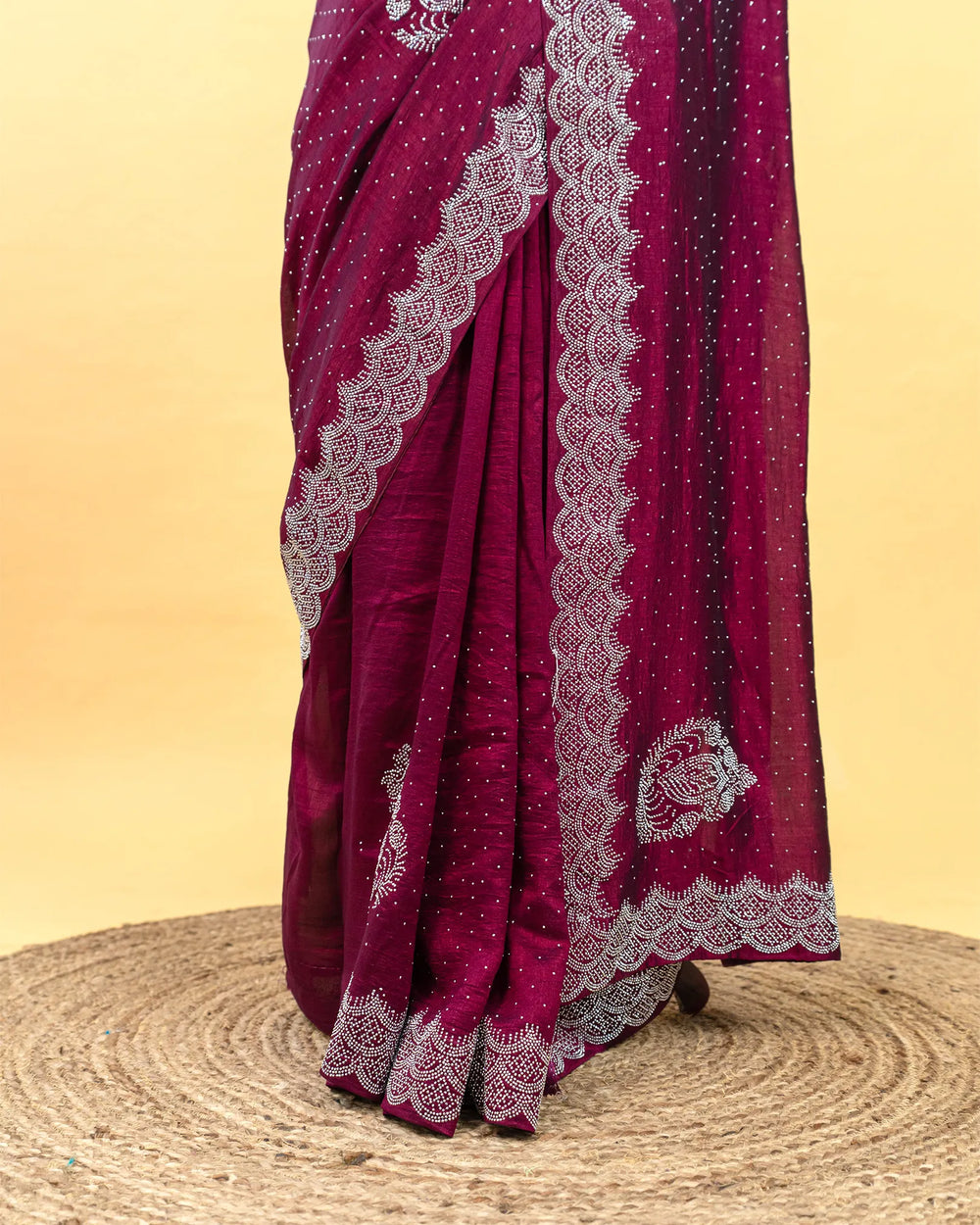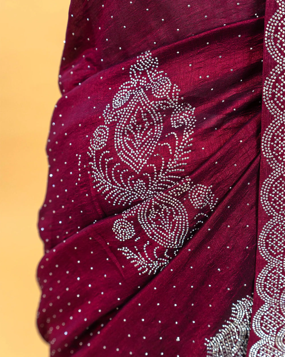 | Style | Sparkling silver stone detailing enhances the rich Vichitra weave, creating a luxurious and festive appearance |
